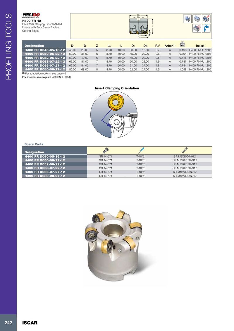 D3 Da H400 FR-12 Face Mills Carrying Double-Sided L Rd° Inserts with Four 6 mm Radius Cutting Edges ap D D1 kg Designation D 1 D Z a p L D 3 Da R d ° Arbor (1) Insert H400 FR D040-05-16-12 40.00 28.00 5 8.70 40.00 38.00 16.00 3.7 A 0.196 H400 RNHU 1205 H400 FR D050-06-22-12 50.00 38.00 6 8.70 50.00 45.00 22.00 2.6 A 0.394 H400 RNHU 1205 H400 FR D052-06-22-12 52.00 40.00 6 8.70 50.00 45.00 22.00 2.5 A 0.418 H400 RNHU 1205 H400 FR D063-07-22-12 63.00 51.00 7 8.70 50.00 60.00 22.00 1.9 A 0.787 H400 RNHU 1205 H400 FR D066-07-27-12 66.00 54.00 7 8.70 50.00 61.00 27.00 1.8 A 0.784 H400 RNHU 1205 H400 FR D080-08-27-12 80.00 68.00 8 8.70 50.00 62.00 27.00 1.5 A 1.048 H400 RNHU 1205 (1) For adaptation options, see page 461 For inserts, see pages: H400 RNHU (451) PROFILING TOOLS Insert Clamping Orientation Spare Parts Designation H400 FR D040-05-16-12 SR 14-571 T-10/51 SR M8X25DIN912 H400 FR D050-06-22-12 SR 14-571 T-10/51 SR M10X25 DIN912 H400 FR D052-06-22-12 SR 14-571 T-10/51 SR M10X25 DIN912 H400 FR D063-07-22-12 SR 14-571 T-10/51 SR M10X25 DIN912 H400 FR D066-07-27-12 SR 14-571 T-10/51 SR M12X30DIN912 H400 FR D080-08-27-12 SR 14-571 T-10/51 SR M12X30DIN912 242 ISCAR