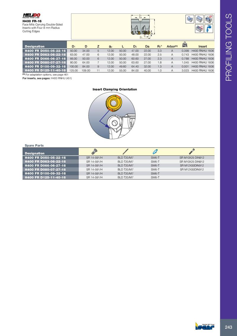 D3 Da H400 FR-16 Face Mills Carrying Double-Sided L Rd° Inserts with Four 8 mm Radius Cutting Edges ap D D1 kg Designation D 1 D Z a p L D 3 Da R d ° Arbor (1) Insert H400 FR D050-05-22-16 50.00 34.00 5 12.00 50.00 47.00 22.00 3.3 A 0.399 H400 RNHU 1606 H400 FR D063-06-22-16 63.00 47.00 6 12.00 50.00 48.00 22.00 2.5 A 0.743 H400 RNHU 1606 H400 FR D066-06-27-16 66.00 50.00 6 12.00 50.00 60.60 27.00 2.3 A 0.788 H400 RNHU 1606 H400 FR D080-07-27-16 80.00 64.00 7 12.00 50.00 63.60 27.00 1.8 A 1.045 H400 RNHU 1606 H400 FR D100-09-32-16 100.00 84.00 9 12.00 49.60 64.40 32.00 1.3 A 0.001 H400 RNHU 1606 H400 FR D125-11-40-16 125.00 109.00 11 12.00 55.00 84.00 40.00 1.0 A 3.023 H400 RNHU 1606 (1) For adaptation options, see page 461 For inserts, see pages: H400 RNHU (451) PROFILING TOOLS Insert Clamping Orientation Spare Parts Designation H400 FR D050-05-22-16 SR 14-591/H BLD T20/M7 SW6-T SR M10X25 DIN912 H400 FR D063-06-22-16 SR 14-591/H BLD T20/M7 SW6-T SR M10X25 DIN912 H400 FR D066-06-27-16 SR 14-591/H BLD T20/M7 SW6-T SR M12X30DIN912 H400 FR D080-07-27-16 SR 14-591/H BLD T20/M7 SW6-T SR M12X30DIN912 H400 FR D100-09-32-16 SR 14-591/H BLD T20/M7 SW6-T H400 FR D125-11-40-16 SR 14-591/H BLD T20/M7 SW6-T 243