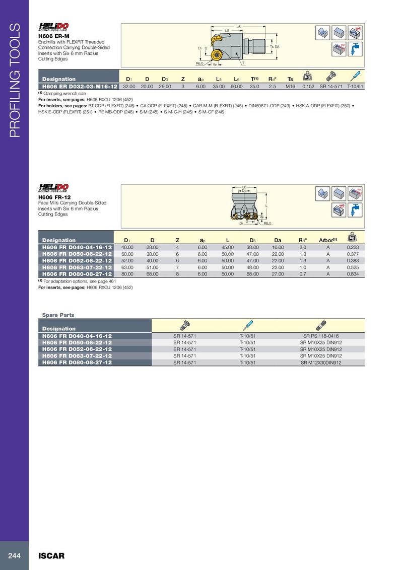 L6 L5 H606 ER-M Endmills with FLEXFIT Threaded Rd° Connection Carrying Double-Sided D1 D Ts D3 Inserts with Six 6 mm Radius Cutting Edges R6.0 ap T kg Designation D 1 D D 3 Z a p L 5 L 6 T (1) R d ° Ts H606 ER D032-03-M16-12 32.00 20.00 29.00 3 6.00 35.00 60.00 25.0 2.5 M16 0.152 SR 14-571 T-10/51 (1) Clamping wrench size For inserts, see pages: H606 RXCU 1206 (452) For holders, see pages: BT-ODP (FLEXFIT) (248) • C#-ODP (FLEXFIT) (248) • CAB M-M (FLEXFIT) (245) • DIN69871-ODP (249) • HSK A-ODP (FLEXFIT) (250) • HSK E-ODP (FLEXFIT) (251) • RE MB-ODP (246) • S M (245) • S M-C-H (245) • S M-CF (246) PROFILING TOOLS D3 Da Rd° H606 FR-12 Face Mills Carrying Double-Sided L Inserts with Six 6 mm Radius Cutting Edges ap D D1 R6.0 Designation D 1 D Z a p L D 3 Da R d ° Arbor (1) kg H606 FR D040-04-16-12 40.00 28.00 4 6.00 45.00 38.00 16.00 2.0 A 0.223 H606 FR D050-06-22-12 50.00 38.00 6 6.00 50.00 47.00 22.00 1.3 A 0.377 H606 FR D052-06-22-12 52.00 40.00 6 6.00 50.00 47.00 22.00 1.3 A 0.383 H606 FR D063-07-22-12 63.00 51.00 7 6.00 50.00 48.00 22.00 1.0 A 0.525 H606 FR D080-08-27-12 80.00 68.00 8 6.00 50.00 58.00 27.00 0.7 A 0.834 (1) For adaptation options, see page 461 For inserts, see pages: H606 RXCU 1206 (452) Spare Parts Designation H606 FR D040-04-16-12 SR 14-571 T-10/51 SR PS 118-0416 H606 FR D050-06-22-12 SR 14-571 T-10/51 SR M10X25 DIN912 H606 FR D052-06-22-12 SR 14-571 T-10/51 SR M10X25 DIN912 H606 FR D063-07-22-12 SR 14-571 T-10/51 SR M10X25 DIN912 H606 FR D080-08-27-12 SR 14-571 T-10/51 SR M12X30DIN912 244 ISCAR