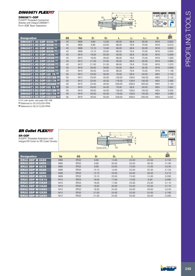 L A 0.003 A AT3 Taper 58-60 HRc L1 DIN69871-ODP SS L3 D2 FLEXFIT Threaded Connection 10 G2.5 SK 40=20,000 RPM Shanks with Integral DIN69871 D1 U<1.0 gmm G6.3 Form ADB Taper Adaptation SK 50=12,000 RPM G Tsi kg Designation SS Tsi D 1 D 2 L L 1 L 3 G DIN69871 40 ODP 6X58 (1) 40 M06 9.80 13.00 58.00 38.9 30.00 M16 0.820 DIN69871 40 ODP 6X98 (1) 40 M06 9.80 23.00 98.00 78.9 70.00 M16 0.910 DIN69871 40 ODP 8X58 (1) 40 M08 13.10 15.00 58.00 38.9 30.00 M16 0.820 DIN69871 40 ODP 8X98 (1) 40 M08 13.10 23.00 98.00 78.9 70.00 M16 0.920 DIN69871 40 ODP10X58 (1) 40 M10 18.00 20.00 58.00 38.9 30.00 M16 0.838 DIN69871 40 ODP10X98 (1) 40 M10 18.00 28.00 98.00 78.9 70.00 M16 1.000 DIN69871 40 ODP12X58 (1) 40 M12 21.00 24.00 58.00 38.9 30.00 M16 0.880 DIN69871 40 ODP12X98 (1) 40 M12 21.00 31.00 98.00 78.9 70.00 M16 1.070 PROFILING TOOLS DIN69871 40 ODP16X58 (1) 40 M16 29.00 28.60 58.00 38.9 35.00 M16 0.908 DIN69871 40 ODP16X98 (1) 40 M16 29.00 34.00 98.00 78.9 70.00 M16 1.148 DIN69871 50 ODP12X 78 (2) 50 M12 23.00 30.00 78.00 58.9 50.00 M24 2.740 DIN69871 50 ODP12X128 (2) 50 M12 23.00 40.00 128.00 108.9 100.00 M24 3.142 DIN69871 50 ODP12X178 (2) 50 M12 23.00 40.00 178.00 158.9 150.00 M24 3.380 DIN69871 50 ODP12X228 (2) 50 M12 23.00 46.00 228.00 208.9 200.00 M24 4.140 DIN69871 50 ODP16X 78 (2) 50 M16 29.00 34.00 78.00 58.9 50.00 M24 2.954 DIN69871 50 ODP16X128 (2) 50 M16 29.00 40.00 128.00 108.9 100.00 M24 3.200 DIN69871 50 ODP16X178 (2) 50 M16 29.00 55.00 178.00 158.9 150.00 M24 4.080 DIN69871 50 ODP16X228 (2) 50 M16 29.00 55.00 228.00 208.9 200.00 M24 4.642 • For user guide, see page 462-468 (1) Balanced to G2.5/25,000 RPM (2) Balanced to G6.3/12,000 RPM A 0.003 A SS L ER-ODP L 3 10 Bar Max FLEXFIT Threaded Adaptation with 58-60 HRc Integral ER Collet for ER Collet Chucks D 1 Tsi Coolant JET2 D 2 kg Designation Tsi SS D 1 D 2 L L 3 ER32 ODP M 6X25 M06 ER32 9.80 14.00 25.00 22.00 0.150 ER32 ODP M 6X50 M06 ER32 9.80 20.00 50.00 48.00 0.190 ER32 ODP M 6X75 M06 ER32 9.80 23.00 75.00 74.00 0.240 ER32 ODP M 8X25 M08 ER32 13.10 15.00 25.00 22.00 0.150 ER32 ODP M 8X50 M08 ER32 13.10 23.00 50.00 49.00 0.210 ER32 ODP M 8X75 M08 ER32 13.10 23.00 75.00 74.00 0.260 ER25 ODP M10X10 M10 ER25 18.00 17.60 10.00 8.00 0.090 ER25 ODP M10X25 M10 ER25 18.00 17.60 25.00 23.00 0.110 ER32 ODP M10X25 M10 ER32 18.00 20.00 25.00 23.00 0.170 ER32 ODP M10X50 M10 ER32 18.00 24.00 50.00 49.00 0.240 ER32 ODP M12X25 M12 ER32 21.00 24.00 25.00 24.00 0.180 ER32 ODP M12X50 M12 ER32 21.00 24.00 50.00 49.00 0.260 249