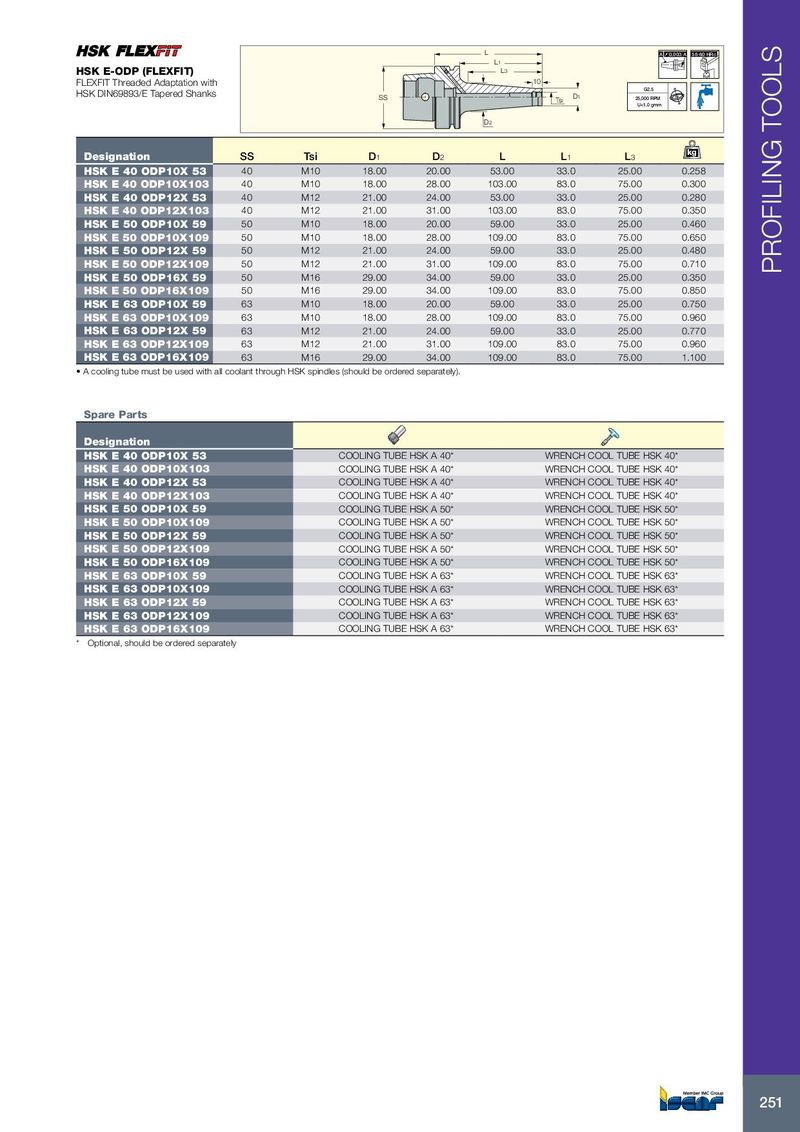 L A 0.003 A 58-60 HRc L 1 HSK E-ODP (FLEXFIT) L 3 FLEXFIT Threaded Adaptation with 10 G2.5 HSK DIN69893/E Tapered Shanks SS Tsi D 1 25,000 RPM U<1.0 gmm D 2 kg Designation SS Tsi D 1 D 2 L L 1 L 3 HSK E 40 ODP10X 53 40 M10 18.00 20.00 53.00 33.0 25.00 0.258 HSK E 40 ODP10X103 40 M10 18.00 28.00 103.00 83.0 75.00 0.300 HSK E 40 ODP12X 53 40 M12 21.00 24.00 53.00 33.0 25.00 0.280 HSK E 40 ODP12X103 40 M12 21.00 31.00 103.00 83.0 75.00 0.350 HSK E 50 ODP10X 59 50 M10 18.00 20.00 59.00 33.0 25.00 0.460 HSK E 50 ODP10X109 50 M10 18.00 28.00 109.00 83.0 75.00 0.650 HSK E 50 ODP12X 59 50 M12 21.00 24.00 59.00 33.0 25.00 0.480 HSK E 50 ODP12X109 50 M12 21.00 31.00 109.00 83.0 75.00 0.710 PROFILING TOOLS HSK E 50 ODP16X 59 50 M16 29.00 34.00 59.00 33.0 25.00 0.350 HSK E 50 ODP16X109 50 M16 29.00 34.00 109.00 83.0 75.00 0.850 HSK E 63 ODP10X 59 63 M10 18.00 20.00 59.00 33.0 25.00 0.750 HSK E 63 ODP10X109 63 M10 18.00 28.00 109.00 83.0 75.00 0.960 HSK E 63 ODP12X 59 63 M12 21.00 24.00 59.00 33.0 25.00 0.770 HSK E 63 ODP12X109 63 M12 21.00 31.00 109.00 83.0 75.00 0.960 HSK E 63 ODP16X109 63 M16 29.00 34.00 109.00 83.0 75.00 1.100 • A cooling tube must be used with all coolant through HSK spindles (should be ordered separately). Spare Parts Designation HSK E 40 ODP10X 53 COOLING TUBE HSK A 40* WRENCH COOL TUBE HSK 40* HSK E 40 ODP10X103 COOLING TUBE HSK A 40* WRENCH COOL TUBE HSK 40* HSK E 40 ODP12X 53 COOLING TUBE HSK A 40* WRENCH COOL TUBE HSK 40* HSK E 40 ODP12X103 COOLING TUBE HSK A 40* WRENCH COOL TUBE HSK 40* HSK E 50 ODP10X 59 COOLING TUBE HSK A 50* WRENCH COOL TUBE HSK 50* HSK E 50 ODP10X109 COOLING TUBE HSK A 50* WRENCH COOL TUBE HSK 50* HSK E 50 ODP12X 59 COOLING TUBE HSK A 50* WRENCH COOL TUBE HSK 50* HSK E 50 ODP12X109 COOLING TUBE HSK A 50* WRENCH COOL TUBE HSK 50* HSK E 50 ODP16X109 COOLING TUBE HSK A 50* WRENCH COOL TUBE HSK 50* HSK E 63 ODP10X 59 COOLING TUBE HSK A 63* WRENCH COOL TUBE HSK 63* HSK E 63 ODP10X109 COOLING TUBE HSK A 63* WRENCH COOL TUBE HSK 63* HSK E 63 ODP12X 59 COOLING TUBE HSK A 63* WRENCH COOL TUBE HSK 63* HSK E 63 ODP12X109 COOLING TUBE HSK A 63* WRENCH COOL TUBE HSK 63* HSK E 63 ODP16X109 COOLING TUBE HSK A 63* WRENCH COOL TUBE HSK 63* * Optional, should be ordered separately 251