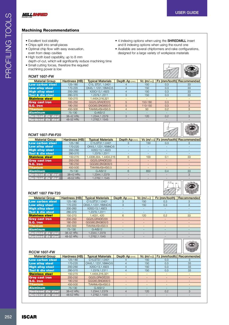 USER GUIDE Machining Recommendations • Excellent tool stability • 4 indexing options when using the SHREDMILL insert • Chips split into small pieces and 8 indexing options when using the round one • Optimal chip flow with easy evacuation, • Available are several chipformers and rake configurations, even from deep cavities designed for a large variety of workpiece materials • High tooth load capability, up to 8 mm depth-of-cut, which will significantly reduce machining time • Small cutting forces, therefore the required machining power is low 12˚ PROFILING TOOLS RCMT 1607-FW Material Group Hardness (HB) Typical Materials Depth Ap (mm) Vc (m/ min ) Fz (mm/tooth) Recommended Low carbon steel 125-180 C15, ST37, 1.0401 4 150 0.3 33 Low alloy steel 170-220 CK45,1.1231,16MnCr5 4 150 0.3 33 High alloy steel 200-260 X20Cr13,1.4923 4 150 0.3 33 Tool & die steel 280-370 1.2379,1.2311 3 150 0.3 33 Stainless steel 150-270 1.4404,316,321 - - - - Grey cast iron 200-250 GG25,GRADE220 5 150-180 0.3 3 S.G. iron 180-250 GGG60,SNG600/3 5 110-150 0.3 3 Titanium 450-500 TiAI4Mo4Sn4Si0.5 4 50 0.2 3 Aluminum 75-130 G-AISi12 - - - - Hardened die steel 38-42 HRc 1.2344,1.2379 3 120 0.2 3 Hardened die steel 48-52 HRc 1.2762,1.1545 - - - - 20˚ RCMT 1607-FW-F20 Material Group Hardness (HB) Typical Materials Depth Ap (mm) Vc (m/ min ) Fz (mm/tooth) Recommended Low carbon steel 125-180 C15,ST37,1.0401 3 150 0.3 3 Low alloy steel 170-220 CK45,1.1231,16MnCr5 - - - - High alloy steel 200-260 X20Cr13,1.4923 - - - - Tool & die steel 280-370 1.2379,1.2311 - - - - Stainless steel 150-270 1.4306,304, 1.4404,316 6 100 0.1 33 Grey cast iron 200-250 GG25,GRADE220 - - - - S.G. iron 180-250 GGG60,SNG600/3 - - - - Titanium 450-500 TiAI4Mo4Sn4Si0.5 - - - - Aluminum 75-130 G-AISi12 6 850 0.4 33 Hardened die steel 38-42 HRc 1.2344,1.2379 - - - 3 Hardened die steel 48-52 HRc 1.2762,1.1545 - - - - 0.15 20˚ 20˚ RCMT 1607 FW-T20 Material Group Hardness (HB) Typical Materials Depth Ap (mm) Vc (m/ min ) Fz (mm/tooth) Recommended Low carbon steel 125-180 C15,ST37,1.0401 3 150 0.3 3 Low alloy steel 170-220 CK45,1.1231,16MnCr5 3 150 0.3 3 High alloy steel 200-260 X20Cr13,1.4923 - - - - Tool & die steel 280-370 1.2379,1.2311 - - - - Stainless steel 150-270 1.4031, 420 6 120 0.2 33 Grey cast iron 200-250 GG25,GRADE220 - - - - S.G. iron 180-250 GGG60,SNG600/3 - - - - Titanium 450-500 TiAI4Mo4Sn4Si0.5 - - - - Aluminum 75-130 G-AISi12 - - - - Hardened die steel 38-42 HRc 1.2344,1.2379 - - - - Hardened die steel 48-52 HRc 1.2762,1.1545 - - - - RCCW 1607-FW Material Group Hardness (HB) Typical Materials Depth Ap (mm) Vc (m/ min ) Fz (mm/tooth) Recommended Low carbon steel 125-180 C15,ST37,1.0401 4 150 0.3 3 Low alloy steel 170-220 CK45,1.1231,16MnCr5 4 150 0.3 33 High alloy steel 200-260 X20Cr13,1.4923 4 150 0.3 33 Tool & die steel 280-370 1.2379,1.2311 4 150 0.3 33 Stainless steel 150-270 1.4404,316,321 - - - - Grey cast iron 200-250 GG25,GRADE220 - - - - S.G. iron 180-250 GGG60,SNG600/3 - - - - Titanium 450-500 TiAI4Mo4Sn4Si0.5 - - - - Aluminum 75-130 G-AISi12 - - - - Hardened die steel 38-42 HRc 1.2344,1.2379 4 120 0.2 3 Hardened die steel 48-52 HRc 1.2762,1.1545 - - - - 252 252 ISCAR ISCAR