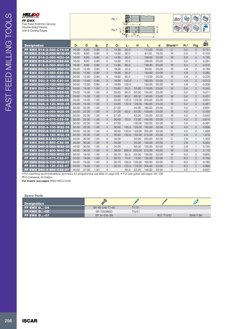 Fig. 1 FF EWX 17° Fast Feed Endmills Carrying H Rd° Double-Sided Inserts D with 6 Cutting Edges Fig. 2 D1 d ap D2 L1 L kg Designation D 1 D a p Z D 2 L 1 H L d Shank (1) R d ° Fig. FF EWX D16-2-030-C16-04 16.00 8.60 0.80 2 14.90 30.0 - 113.00 16.00 C 5.0 2 0.151 FF EWX D16-2-030-W16-04 16.00 8.60 0.80 2 14.90 30.0 - 81.00 16.00 W 5.0 2 0.103 FF EWX D16-2-050-W20-04 16.00 8.60 0.80 2 14.90 50.0 - 109.00 20.00 W 5.0 2 0.185 FF EWX D16-2-070-C20-04 16.00 8.60 0.80 2 14.90 70.0 - 159.00 20.00 C 5.0 2 0.281 FF EWX D16-2-080-W20-04 16.00 8.60 0.80 2 14.90 80.0 - 139.00 20.00 W 5.0 2 0.220 FF EWX D20-3-040-W20-04 20.00 12.60 0.80 3 18.90 40.0 - 93.00 20.00 W 4.8 2 0.189 FF EWX D20-3-050-C20-04 20.00 12.60 0.80 3 18.90 50.0 - 133.00 20.00 C 4.8 2 0.282 FF EWX D20-3-060-W20-04 20.00 12.60 0.80 3 18.90 60.0 - 113.00 20.00 W 4.8 2 0.226 FF EWX D20-3-100-C20-04 20.00 12.60 0.80 3 18.90 100.0 - 183.00 20.00 C 4.8 2 0.373 FF EWX D20-3-100-W20-04 20.00 12.60 0.80 3 18.90 100.0 - 153.00 20.00 W 4.8 2 0.308 FF EWX D25-3-050-W25-05 25.00 15.00 1.00 3 23.60 50.0 53.00 110.00 25.00 W 5.0 2 0.345 FF EWX D25-3-060-C25-05 25.00 15.00 1.00 3 23.60 60.0 63.00 145.00 25.00 C 5.0 2 0.471 FF EWX D25-3-080-W25-05 25.00 15.00 1.00 3 23.60 80.0 83.00 140.00 25.00 W 5.0 2 0.437 FF EWX D25-3-120-C25-05 25.00 15.00 1.00 3 23.60 120.0 123.00 205.00 25.00 C 5.0 2 0.654 FF EWX D25-3-120-W25-05 25.00 15.00 1.00 3 23.60 120.0 123.00 180.00 25.00 W 5.0 2 0.561 FF EWX D32-4-040-C25-05 32.00 22.00 1.00 4 27.00 - 40.00 180.00 25.00 C 4.0 1 0.634 FAST FEED MILLING TOOLS FF EWX D32-4-060-W25-05 32.00 22.00 1.00 4 27.00 60.0 63.00 120.00 25.00 W 4.0 1 0.435 FF EWX D32-4-060-W32-05 32.00 22.00 1.00 4 27.00 - 63.00 125.00 32.00 W 4.0 2 0.640 FF EWX D32-4-070-C32-05 32.00 22.00 1.00 4 30.60 70.0 73.00 155.00 32.00 C 4.0 2 0.814 FF EWX D32-4-100-W25-05 32.00 22.00 1.00 4 27.00 - 100.00 160.00 25.00 W 4.0 1 0.597 FF EWX D32-4-100-W32-05 32.00 22.00 1.00 4 30.60 100.0 103.00 165.00 32.00 W 4.0 2 0.836 FF EWX D32-4-120-C32-05 32.00 22.00 1.00 4 30.60 120.0 123.00 205.00 32.00 C 4.0 2 1.059 FF EWX D32-4-150-W32-05 32.00 22.00 1.00 4 30.60 150.0 153.00 215.00 32.00 W 4.0 2 1.079 FF EWX D40-5-L50-C32-05 40.00 30.00 1.00 5 34.00 - 50.00 250.00 32.00 C 2.8 1 1.403 FF EWX D40-5-S50-C32-05 40.00 30.00 1.00 5 34.00 - 50.00 150.00 32.00 C 2.8 1 0.854 FF EWX D40-5-060-W32-05 40.00 30.00 1.00 5 34.00 - 60.00 125.00 32.00 W 2.8 1 0.720 FF EWX D40-5-200-W40-05 40.00 30.00 1.00 5 38.60 200.0 203.00 275.00 40.00 W 2.8 2 2.170 FF EWX D32-3-060-W32-07 32.00 19.00 1.50 3 30.70 60.0 63.00 125.00 32.00 W 6.3 2 0.600 FF EWX D32-3-070-C32-07 32.00 19.00 1.50 3 30.70 70.0 73.00 155.00 32.00 C 6.3 2 0.760 FF EWX D32-3-100-W32-07 32.00 19.00 1.50 3 30.70 100.0 103.00 165.00 32.00 W 6.3 2 0.780 FF EWX D32-3-120-C32-07 32.00 19.00 1.50 3 30.70 120.0 123.00 205.00 32.00 C 6.3 2 0.990 FF EWX D40-4-S50-C32-07 40.00 27.00 1.50 4 - 50.0 52.20 150.00 32.00 C 4.2 1 0.842 • For machining recommendations and radius for programming, see table on page 446 • For user guide, see pages 461-468 (1) C-Cylindrical, W-Weldon For inserts, see pages: H600 WXCU (446) Spare Parts Designation FF EWX D...-04 SR M2.5X6-T7-60 T-7/51 FF EWX D...-05 SR 10508600 T-9/51 FF EWX D...-07 SR 34-535-SN BLD T15/S7 SW6-T-SH 256 ISCAR
