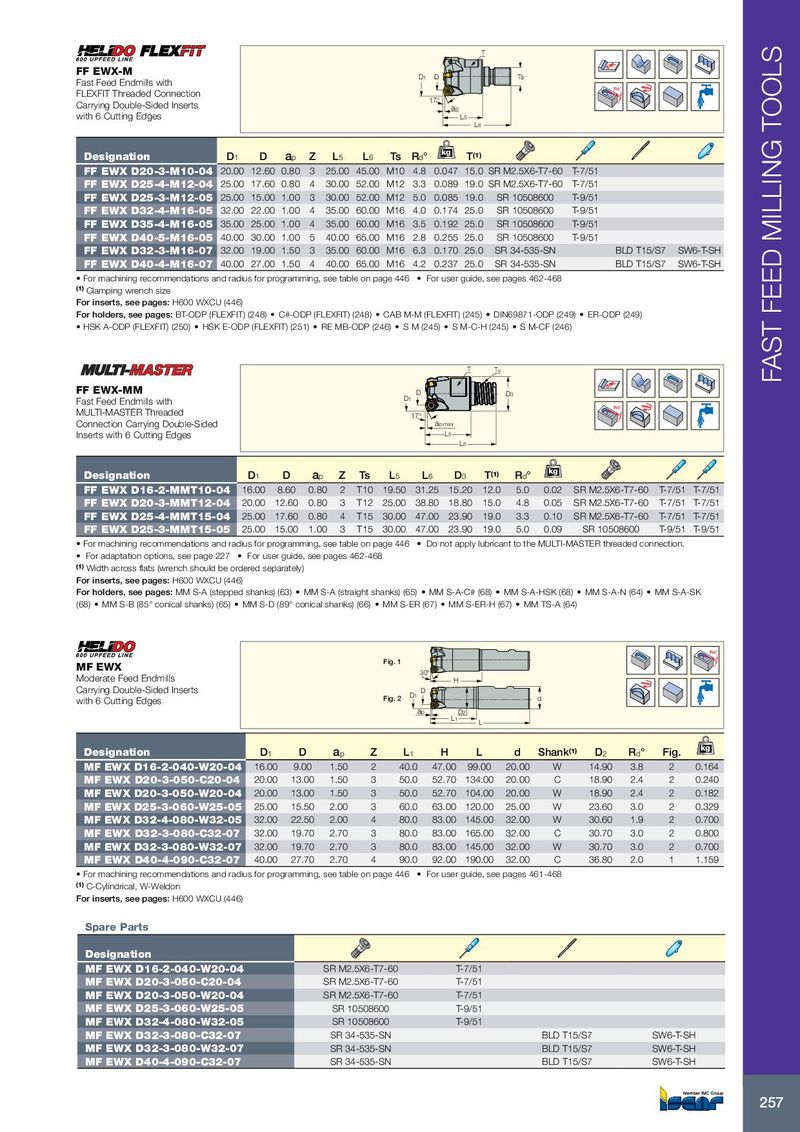 T FF EWX-M D1 D Ts Fast Feed Endmills with Rd° FLEXFIT Threaded Connection 17° Carrying Double-Sided Inserts ap with 6 Cutting Edges L5 L6 kg Designation D 1 D a p Z L 5 L 6 Ts R d ° T (1) FF EWX D20-3-M10-04 20.00 12.60 0.80 3 25.00 45.00 M10 4.8 0.047 15.0 SR M2.5X6-T7-60 T-7/51 FF EWX D25-4-M12-04 25.00 17.60 0.80 4 30.00 52.00 M12 3.3 0.089 19.0 SR M2.5X6-T7-60 T-7/51 FF EWX D25-3-M12-05 25.00 15.00 1.00 3 30.00 52.00 M12 5.0 0.085 19.0 SR 10508600 T-9/51 FF EWX D32-4-M16-05 32.00 22.00 1.00 4 35.00 60.00 M16 4.0 0.174 25.0 SR 10508600 T-9/51 FF EWX D35-4-M16-05 35.00 25.00 1.00 4 35.00 60.00 M16 3.5 0.192 25.0 SR 10508600 T-9/51 FF EWX D40-5-M16-05 40.00 30.00 1.00 5 40.00 65.00 M16 2.8 0.255 25.0 SR 10508600 T-9/51 FF EWX D32-3-M16-07 32.00 19.00 1.50 3 35.00 60.00 M16 6.3 0.170 25.0 SR 34-535-SN BLD T15/S7 SW6-T-SH FF EWX D40-4-M16-07 40.00 27.00 1.50 4 40.00 65.00 M16 4.2 0.237 25.0 SR 34-535-SN BLD T15/S7 SW6-T-SH • For machining recommendations and radius for programming, see table on page 446 • For user guide, see pages 462-468 (1) Clamping wrench size For inserts, see pages: H600 WXCU (446) For holders, see pages: BT-ODP (FLEXFIT) (248) • C#-ODP (FLEXFIT) (248) • CAB M-M (FLEXFIT) (245) • DIN69871-ODP (249) • ER-ODP (249) • HSK A-ODP (FLEXFIT) (250) • HSK E-ODP (FLEXFIT) (251) • RE MB-ODP (246) • S M (245) • S M-C-H (245) • S M-CF (246) T Ts FAST FEED MILLING TOOLS FF EWX-MM D D3 Fast Feed Endmills with D1 Rd° MULTI-MASTER Threaded 17° Connection Carrying Double-Sided ap max Inserts with 6 Cutting Edges L5 L6 kg Designation D 1 D a p Z Ts L 5 L 6 D 3 T (1) R d ° FF EWX D16-2-MMT10-04 16.00 8.60 0.80 2 T10 19.50 31.25 15.20 12.0 5.0 0.02 SR M2.5X6-T7-60 T-7/51 T-7/51 FF EWX D20-3-MMT12-04 20.00 12.60 0.80 3 T12 25.00 38.80 18.80 15.0 4.8 0.05 SR M2.5X6-T7-60 T-7/51 T-7/51 FF EWX D25-4-MMT15-04 25.00 17.60 0.80 4 T15 30.00 47.00 23.90 19.0 3.3 0.10 SR M2.5X6-T7-60 T-7/51 T-7/51 FF EWX D25-3-MMT15-05 25.00 15.00 1.00 3 T15 30.00 47.00 23.90 19.0 5.0 0.09 SR 10508600 T-9/51 T-9/51 • For machining recommendations and radius for programming, see table on page 446 • Do not apply lubricant to the MULTI-MASTER threaded connection. • For adaptation options, see page 227 • For user guide, see pages 462-468 (1) Width across flats (wrench should be ordered separately) For inserts, see pages: H600 WXCU (446) For holders, see pages: MM S-A (stepped shanks) (63) • MM S-A (straight shanks) (65) • MM S-A-C# (68) • MM S-A-HSK (68) • MM S-A-N (64) • MM S-A-SK (68) • MM S-B (85° conical shanks) (65) • MM S-D (89° conical shanks) (66) • MM S-ER (67) • MM S-ER-H (67) • MM TS-A (64) Rd° Fig. 1 MF EWX 30° Moderate Feed Endmills H Carrying Double-Sided Inserts D with 6 Cutting Edges Fig. 2 D1 d ap D2 L1 L kg Designation D 1 D a p Z L 1 H L d Shank (1) D 2 R d ° Fig. MF EWX D16-2-040-W20-04 16.00 9.00 1.50 2 40.0 47.00 99.00 20.00 W 14.90 3.8 2 0.164 MF EWX D20-3-050-C20-04 20.00 13.00 1.50 3 50.0 52.70 134.00 20.00 C 18.90 2.4 2 0.240 MF EWX D20-3-050-W20-04 20.00 13.00 1.50 3 50.0 52.70 104.00 20.00 W 18.90 2.4 2 0.182 MF EWX D25-3-060-W25-05 25.00 15.50 2.00 3 60.0 63.00 120.00 25.00 W 23.60 3.0 2 0.329 MF EWX D32-4-080-W32-05 32.00 22.50 2.00 4 80.0 83.00 145.00 32.00 W 30.60 1.9 2 0.700 MF EWX D32-3-080-C32-07 32.00 19.70 2.70 3 80.0 83.00 165.00 32.00 C 30.70 3.0 2 0.800 MF EWX D32-3-080-W32-07 32.00 19.70 2.70 3 80.0 83.00 145.00 32.00 W 30.70 3.0 2 0.700 MF EWX D40-4-090-C32-07 40.00 27.70 2.70 4 90.0 92.00 190.00 32.00 C 36.80 2.0 1 1.159 • For machining recommendations and radius for programming, see table on page 446 • For user guide, see pages 461-468 (1) C-Cylindrical, W-Weldon For inserts, see pages: H600 WXCU (446) Spare Parts Designation MF EWX D16-2-040-W20-04 SR M2.5X6-T7-60 T-7/51 MF EWX D20-3-050-C20-04 SR M2.5X6-T7-60 T-7/51 MF EWX D20-3-050-W20-04 SR M2.5X6-T7-60 T-7/51 MF EWX D25-3-060-W25-05 SR 10508600 T-9/51 MF EWX D32-4-080-W32-05 SR 10508600 T-9/51 MF EWX D32-3-080-C32-07 SR 34-535-SN BLD T15/S7 SW6-T-SH MF EWX D32-3-080-W32-07 SR 34-535-SN BLD T15/S7 SW6-T-SH MF EWX D40-4-090-C32-07 SR 34-535-SN BLD T15/S7 SW6-T-SH 257