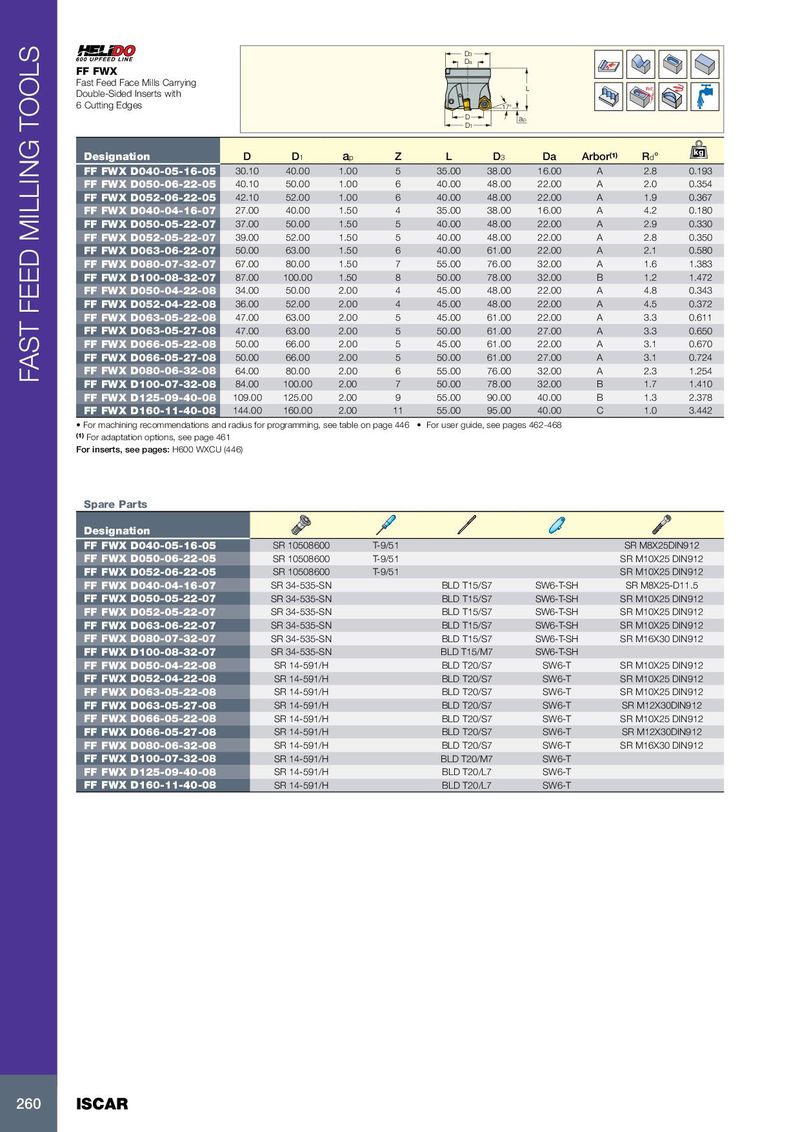 D3 Da FF FWX Fast Feed Face Mills Carrying L Rd° Double-Sided Inserts with 6 Cutting Edges 17° D ap D1 kg Designation D D 1 a p Z L D 3 Da Arbor (1) R d ° FF FWX D040-05-16-05 30.10 40.00 1.00 5 35.00 38.00 16.00 A 2.8 0.193 FF FWX D050-06-22-05 40.10 50.00 1.00 6 40.00 48.00 22.00 A 2.0 0.354 FF FWX D052-06-22-05 42.10 52.00 1.00 6 40.00 48.00 22.00 A 1.9 0.367 FF FWX D040-04-16-07 27.00 40.00 1.50 4 35.00 38.00 16.00 A 4.2 0.180 FF FWX D050-05-22-07 37.00 50.00 1.50 5 40.00 48.00 22.00 A 2.9 0.330 FF FWX D052-05-22-07 39.00 52.00 1.50 5 40.00 48.00 22.00 A 2.8 0.350 FF FWX D063-06-22-07 50.00 63.00 1.50 6 40.00 61.00 22.00 A 2.1 0.580 FF FWX D080-07-32-07 67.00 80.00 1.50 7 55.00 76.00 32.00 A 1.6 1.383 FF FWX D100-08-32-07 87.00 100.00 1.50 8 50.00 78.00 32.00 B 1.2 1.472 FF FWX D050-04-22-08 34.00 50.00 2.00 4 45.00 48.00 22.00 A 4.8 0.343 FF FWX D052-04-22-08 36.00 52.00 2.00 4 45.00 48.00 22.00 A 4.5 0.372 FF FWX D063-05-22-08 47.00 63.00 2.00 5 45.00 61.00 22.00 A 3.3 0.611 FF FWX D063-05-27-08 47.00 63.00 2.00 5 50.00 61.00 27.00 A 3.3 0.650 FF FWX D066-05-22-08 50.00 66.00 2.00 5 45.00 61.00 22.00 A 3.1 0.670 FF FWX D066-05-27-08 50.00 66.00 2.00 5 50.00 61.00 27.00 A 3.1 0.724 FF FWX D080-06-32-08 64.00 80.00 2.00 6 55.00 76.00 32.00 A 2.3 1.254 FAST FEED MILLING TOOLS FF FWX D100-07-32-08 84.00 100.00 2.00 7 50.00 78.00 32.00 B 1.7 1.410 FF FWX D125-09-40-08 109.00 125.00 2.00 9 55.00 90.00 40.00 B 1.3 2.378 FF FWX D160-11-40-08 144.00 160.00 2.00 11 55.00 95.00 40.00 C 1.0 3.442 • For machining recommendations and radius for programming, see table on page 446 • For user guide, see pages 462-468 (1) For adaptation options, see page 461 For inserts, see pages: H600 WXCU (446) Spare Parts Designation FF FWX D040-05-16-05 SR 10508600 T-9/51 SR M8X25DIN912 FF FWX D050-06-22-05 SR 10508600 T-9/51 SR M10X25 DIN912 FF FWX D052-06-22-05 SR 10508600 T-9/51 SR M10X25 DIN912 FF FWX D040-04-16-07 SR 34-535-SN BLD T15/S7 SW6-T-SH SR M8X25-D11.5 FF FWX D050-05-22-07 SR 34-535-SN BLD T15/S7 SW6-T-SH SR M10X25 DIN912 FF FWX D052-05-22-07 SR 34-535-SN BLD T15/S7 SW6-T-SH SR M10X25 DIN912 FF FWX D063-06-22-07 SR 34-535-SN BLD T15/S7 SW6-T-SH SR M10X25 DIN912 FF FWX D080-07-32-07 SR 34-535-SN BLD T15/S7 SW6-T-SH SR M16X30 DIN912 FF FWX D100-08-32-07 SR 34-535-SN BLD T15/M7 SW6-T-SH FF FWX D050-04-22-08 SR 14-591/H BLD T20/S7 SW6-T SR M10X25 DIN912 FF FWX D052-04-22-08 SR 14-591/H BLD T20/S7 SW6-T SR M10X25 DIN912 FF FWX D063-05-22-08 SR 14-591/H BLD T20/S7 SW6-T SR M10X25 DIN912 FF FWX D063-05-27-08 SR 14-591/H BLD T20/S7 SW6-T SR M12X30DIN912 FF FWX D066-05-22-08 SR 14-591/H BLD T20/S7 SW6-T SR M10X25 DIN912 FF FWX D066-05-27-08 SR 14-591/H BLD T20/S7 SW6-T SR M12X30DIN912 FF FWX D080-06-32-08 SR 14-591/H BLD T20/S7 SW6-T SR M16X30 DIN912 FF FWX D100-07-32-08 SR 14-591/H BLD T20/M7 SW6-T FF FWX D125-09-40-08 SR 14-591/H BLD T20/L7 SW6-T FF FWX D160-11-40-08 SR 14-591/H BLD T20/L7 SW6-T 260 ISCAR