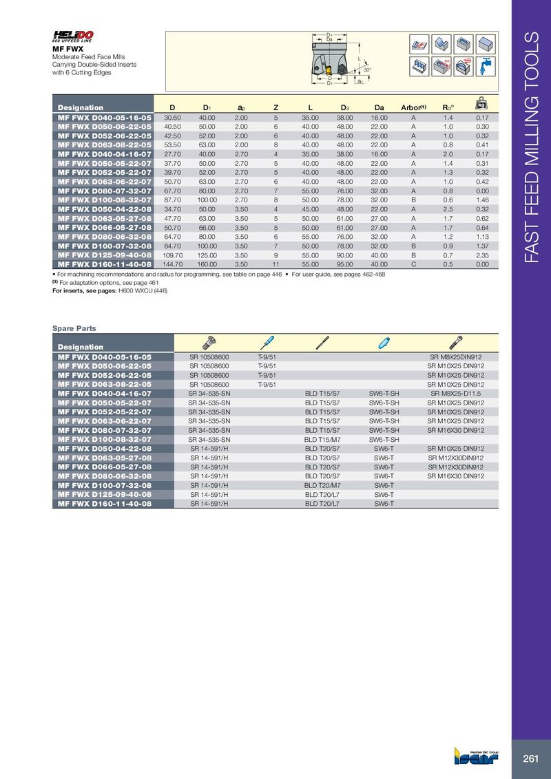 D3 Da MF FWX Moderate Feed Face Mills L Rd° Carrying Double-Sided Inserts 30° with 6 Cutting Edges D D1 ap kg Designation D D 1 a p Z L D 3 Da Arbor (1) R d ° MF FWX D040-05-16-05 30.60 40.00 2.00 5 35.00 38.00 16.00 A 1.4 0.17 MF FWX D050-06-22-05 40.50 50.00 2.00 6 40.00 48.00 22.00 A 1.0 0.30 MF FWX D052-06-22-05 42.50 52.00 2.00 6 40.00 48.00 22.00 A 1.0 0.32 MF FWX D063-08-22-05 53.50 63.00 2.00 8 40.00 48.00 22.00 A 0.8 0.41 MF FWX D040-04-16-07 27.70 40.00 2.70 4 35.00 38.00 16.00 A 2.0 0.17 MF FWX D050-05-22-07 37.70 50.00 2.70 5 40.00 48.00 22.00 A 1.4 0.31 MF FWX D052-05-22-07 39.70 52.00 2.70 5 40.00 48.00 22.00 A 1.3 0.32 MF FWX D063-06-22-07 50.70 63.00 2.70 6 40.00 48.00 22.00 A 1.0 0.42 MF FWX D080-07-32-07 67.70 80.00 2.70 7 55.00 76.00 32.00 A 0.8 0.00 MF FWX D100-08-32-07 87.70 100.00 2.70 8 50.00 78.00 32.00 B 0.6 1.46 MF FWX D050-04-22-08 34.70 50.00 3.50 4 45.00 48.00 22.00 A 2.5 0.32 MF FWX D063-05-27-08 47.70 63.00 3.50 5 50.00 61.00 27.00 A 1.7 0.62 MF FWX D066-05-27-08 50.70 66.00 3.50 5 50.00 61.00 27.00 A 1.7 0.64 MF FWX D080-06-32-08 64.70 80.00 3.50 6 55.00 76.00 32.00 A 1.2 1.13 MF FWX D100-07-32-08 84.70 100.00 3.50 7 50.00 78.00 32.00 B 0.9 1.37 MF FWX D125-09-40-08 109.70 125.00 3.50 9 55.00 90.00 40.00 B 0.7 2.35 FAST FEED MILLING TOOLS MF FWX D160-11-40-08 144.70 160.00 3.50 11 55.00 95.00 40.00 C 0.5 0.00 • For machining recommendations and radius for programming, see table on page 446 • For user guide, see pages 462-468 (1) For adaptation options, see page 461 For inserts, see pages: H600 WXCU (446) Spare Parts Designation MF FWX D040-05-16-05 SR 10508600 T-9/51 SR M8X25DIN912 MF FWX D050-06-22-05 SR 10508600 T-9/51 SR M10X25 DIN912 MF FWX D052-06-22-05 SR 10508600 T-9/51 SR M10X25 DIN912 MF FWX D063-08-22-05 SR 10508600 T-9/51 SR M10X25 DIN912 MF FWX D040-04-16-07 SR 34-535-SN BLD T15/S7 SW6-T-SH SR M8X25-D11.5 MF FWX D050-05-22-07 SR 34-535-SN BLD T15/S7 SW6-T-SH SR M10X25 DIN912 MF FWX D052-05-22-07 SR 34-535-SN BLD T15/S7 SW6-T-SH SR M10X25 DIN912 MF FWX D063-06-22-07 SR 34-535-SN BLD T15/S7 SW6-T-SH SR M10X25 DIN912 MF FWX D080-07-32-07 SR 34-535-SN BLD T15/S7 SW6-T-SH SR M16X30 DIN912 MF FWX D100-08-32-07 SR 34-535-SN BLD T15/M7 SW6-T-SH MF FWX D050-04-22-08 SR 14-591/H BLD T20/S7 SW6-T SR M10X25 DIN912 MF FWX D063-05-27-08 SR 14-591/H BLD T20/S7 SW6-T SR M12X30DIN912 MF FWX D066-05-27-08 SR 14-591/H BLD T20/S7 SW6-T SR M12X30DIN912 MF FWX D080-06-32-08 SR 14-591/H BLD T20/S7 SW6-T SR M16X30 DIN912 MF FWX D100-07-32-08 SR 14-591/H BLD T20/M7 SW6-T MF FWX D125-09-40-08 SR 14-591/H BLD T20/L7 SW6-T MF FWX D160-11-40-08 SR 14-591/H BLD T20/L7 SW6-T 261