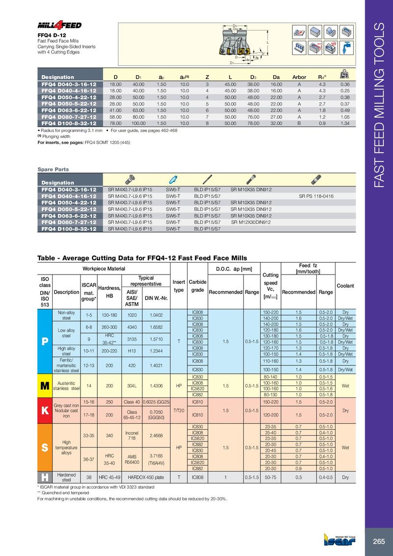 D3 Da FFQ4 D-12 Fast Feed Face Mills L Rd° Carrying Single-Sided Inserts with 4 Cutting Edges 9° D ap ae D1 kg Designation D D 1 a p a e (1) Z L D 3 Da Arbor R d ° FFQ4 D040-3-16-12 18.00 40.00 1.50 10.0 3 45.00 38.00 16.00 A 4.3 0.36 FFQ4 D040-4-16-12 18.00 40.00 1.50 10.0 4 45.00 38.00 16.00 A 4.3 0.25 FFQ4 D050-4-22-12 28.00 50.00 1.50 10.0 4 50.00 48.00 22.00 A 2.7 0.38 FFQ4 D050-5-22-12 28.00 50.00 1.50 10.0 5 50.00 48.00 22.00 A 2.7 0.37 FFQ4 D063-6-22-12 41.00 63.00 1.50 10.0 6 50.00 48.00 22.00 A 1.8 0.49 FFQ4 D080-7-27-12 58.00 80.00 1.50 10.0 7 50.00 76.00 27.00 A 1.2 1.05 FFQ4 D100-8-32-12 78.00 100.00 1.50 10.0 8 50.00 78.00 32.00 B 0.9 1.34 • Radius for programming 3.1 mm • For user guide, see pages 462-468 (1) Plunging width For inserts, see pages: FFQ4 SOMT 1205 (445) Spare Parts Designation FAST FEED MILLING TOOLS FFQ4 D040-3-16-12 SR M4X0.7-L9.6 IP15 SW6-T BLD IP15/S7 SR M10X35 DIN912 FFQ4 D040-4-16-12 SR M4X0.7-L9.6 IP15 SW6-T BLD IP15/S7 SR PS 118-0416 FFQ4 D050-4-22-12 SR M4X0.7-L9.6 IP15 SW6-T BLD IP15/S7 SR M10X35 DIN912 FFQ4 D050-5-22-12 SR M4X0.7-L9.6 IP15 SW6-T BLD IP15/S7 SR M10X35 DIN912 FFQ4 D063-6-22-12 SR M4X0.7-L9.6 IP15 SW6-T BLD IP15/S7 SR M10X35 DIN912 FFQ4 D080-7-27-12 SR M4X0.7-L9.6 IP15 SW6-T BLD IP15/S7 SR M12X30DIN912 FFQ4 D100-8-32-12 SR M4X0.7-L9.6 IP15 SW6-T BLD IP15/S7 Table - Average Cutting Data for FFQ4-12 Fast Feed Face Mills Feed fz Workpiece Material D.O.C. ap [mm] [mm/tooth] Cutting ISO Typical Insert Carbide speed class ISCAR representstive Coolant Hardness, type grade Vc, DIN/ Description mat. AISI/ Recommended Range Recommended Range HB [m/ min ] ISO group* SAE/ DIN W.-Nr. 513 ASTM Non-alloy IC808 150-220 1.5 0.5-2.0 Dry 1-5 130-180 1020 1.0402 steel IC830 140-200 1.6 0.5-2.0 Dry/Wet IC808 140-200 1.5 0.5-2.0 Dry 6-8 260-300 4340 1.6582 Low alloy IC830 120-180 1.6 0.5-2.0 Dry/Wet steel HRC IC808 130-180 1.5 0.5-1.8 Dry 9 3135 1.5710 P 35-42** T IC830 1.5 0.5-1.5 120-160 1.5 0.5-1.8 Dry/Wet High alloy IC808 120-170 1.3 0.5-1.8 Dry 10-11 200-220 H13 1.2344 steel IC830 100-150 1.4 0.5-1.8 Dry/Wet Ferritic/ IC808 110-160 1.3 0.5-1.8 Dry martensitic 12-13 200 420 1.4021 stainless steel IC830 100-150 1.4 0.5-1.8 Dry/Wet IC830 80-140 1.0 0.5-1.5 Austenitic IC808 100-160 1.0 0.5-1.5 14 200 304L 1.4306 HP 1.5 0.5-1.5 Wet M stainless steel IC5820 100-160 1.0 0.5-1.6 IC882 80-130 1.0 0.5-1.8 15-16 250 Class 40 0.6025 (GG25) IC810 150-220 1.5 0.5-2.0 Grey cast iron Nodular cast K Class 0.7050 T/T20 1.5 0.5-1.5 Dry iron 17-18 200 IC810 120-200 1.5 0.5-2.0 65-45-12 (GGG50) IC830 23-35 0.7 0.5-1.0 Inconel IC808 25-40 0.7 0.4-1.0 33-35 340 2.4668 718 IC5820 23-35 0.7 0.5-1.0 High IC882 20-30 0.7 0.5-1.0 temperature HP 1.5 0.5-1.5 Wet S IC830 20-45 0.7 0.5-1.0 alloys HRC AMS 3.7165 IC808 20-30 0.7 0.4-1.0 36-37 35-40 R56400 (Ti6Al4V) IC5820 20-30 0.7 0.5-1.0 IC882 20-30 0.9 0.5-1.0 Hardened 38 HRC 45-49 HARDOX 450 plate T IC808 1 0.5-1.5 50-75 0.5 0.4-0.5 Dry H steel * ISCAR material group in accordance with VDI 3323 standard ** Quenched and tempered For machining in unstable conditions, the recommended cutting data should be reduced by 20-30%. 265