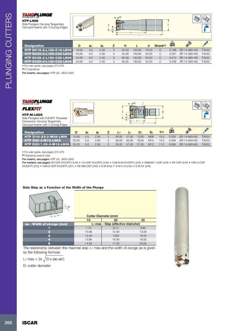 ap HTP-LN06 Side Plungers Carrying Tangentially D d Clamped Inserts with 4 Cutting Edges ae H L Designation D a e a p Z H L d Shank (1) kg HTP D016-2-L120-C16-LN06 16.00 4.5 2.50 2 32.00 120.00 16.00 C 0.166 SR 14-560-HG T-8/53 HTP D020-3-L150-C20-LN06 20.00 5.0 2.50 3 40.00 150.00 20.00 C 0.331 SR 14-560-HG T-8/53 HTP D025-3-L150-C25-LN06 25.00 5.0 2.50 3 50.00 150.00 25.00 C 0.513 SR 14-560-HG T-8/53 HTP D025-4-L130-C25-LN06 25.00 5.0 2.50 4 50.00 130.00 25.00 C 0.439 SR 14-560-HG T-8/53 • For user guide, see pages 272-276 (1) C-Cylindrical For inserts, see pages: HTP LN.. 0604 (456) PLUNGING CUTTERS ap T D Ts D3 HTP-M-LN06 ae Side Plungers with FLEXFIT Threaded Connection Carrying Tangentially L5 L6 Clamped Inserts with 4 Cutting Edges kg Designation D a e a p Z L 5 L 6 D 3 Ts T (1) HTP D16/.62-2-M08-LN06 15.95 4.5 2.50 2 30.00 47.50 13.00 M08 10.0 0.030 SR 14-560-HG T-8/53 HTP D20-3-M10-LN06 20.00 5.0 2.50 3 30.00 50.00 18.00 M10 15.0 0.058 SR 14-560-HG T-8/53 HTP D25/1.00-3-M12-LN06 25.20 5.0 2.50 3 35.00 57.00 21.00 M12 17.0 0.095 SR 14-560-HG T-8/53 • For user guide, see pages 272-276 (1) Clamping wrench size For inserts, see pages: HTP LN.. 0604 (456) For holders, see pages: BT-ODP (FLEXFIT) (248) • C#-ODP (FLEXFIT) (248) • CAB M-M (FLEXFIT) (245) • DIN69871-ODP (249) • ER-ODP (249) • HSK A-ODP (FLEXFIT) (250) • HSK E-ODP (FLEXFIT) (251) • RE MB-ODP (246) • S M (245) • S M-C-H (245) • S M-CF (246) Side Step as a Function of the Width of the Plunge ae L1 Cutter Diameter (mm) 16 20 25 ae - Width of plunge (mm) L1 max - Step (effective diameter) 1 7.75 8.72 9.80 2 10.58 12.00 13.56 3 12.49 1428 16.25 4 13.86 16.00 18.33 5 14.83 17.32 20.00 The relationship between the maximal step L1 max and the width of plunge ae is given by the following formula: L1 max = 2x D x (ae-ae 2 ) D: cutter diameter 268 ISCAR