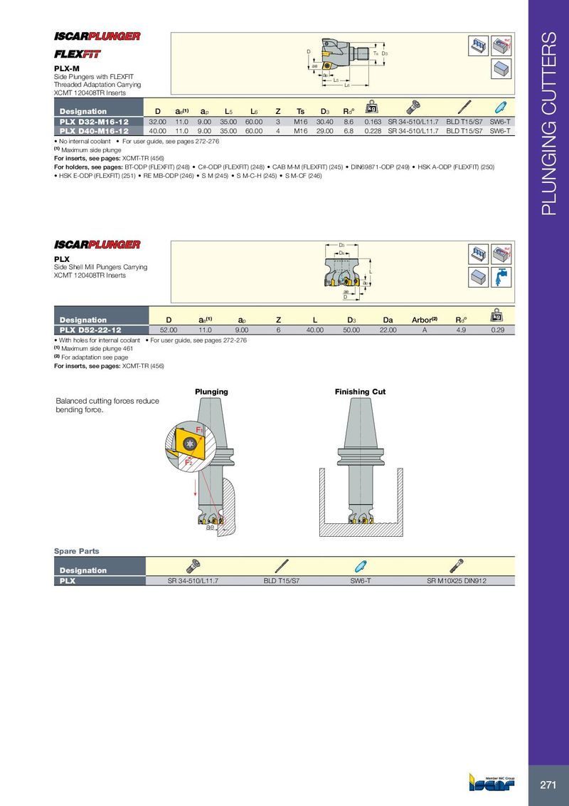 Rd° D Ts D3 ae PLX-M Side Plungers with FLEXFIT ap L5 Threaded Adaptation Carrying L6 XCMT 120408TR Inserts kg Designation D a e (1) a p L 5 L 6 Z Ts D 3 R d ° PLX D32-M16-12 32.00 11.0 9.00 35.00 60.00 3 M16 30.40 8.6 0.163 SR 34-510/L11.7 BLD T15/S7 SW6-T PLX D40-M16-12 40.00 11.0 9.00 35.00 60.00 4 M16 29.00 6.8 0.228 SR 34-510/L11.7 BLD T15/S7 SW6-T • No internal coolant • For user guide, see pages 272-276 (1) Maximum side plunge For inserts, see pages: XCMT-TR (456) For holders, see pages: BT-ODP (FLEXFIT) (248) • C#-ODP (FLEXFIT) (248) • CAB M-M (FLEXFIT) (245) • DIN69871-ODP (249) • HSK A-ODP (FLEXFIT) (250) • HSK E-ODP (FLEXFIT) (251) • RE MB-ODP (246) • S M (245) • S M-C-H (245) • S M-CF (246) PLUNGING CUTTERS D 3 Rd° Da PLX Side Shell Mill Plungers Carrying L XCMT 120408TR Inserts ap ae D Designation D a e (1) a p Z L D 3 Da Arbor (2) kg R d ° PLX D52-22-12 52.00 11.0 9.00 6 40.00 50.00 22.00 A 4.9 0.29 • With holes for internal coolant • For user guide, see pages 272-276 (1) Maximum side plunge 461 (2) For adaptation see page For inserts, see pages: XCMT-TR (456) Plunging Finishing Cut Balanced cutting forces reduce bending force. F 1 F 2 ae Spare Parts Designation PLX SR 34-510/L11.7 BLD T15/S7 SW6-T SR M10X25 DIN912 271