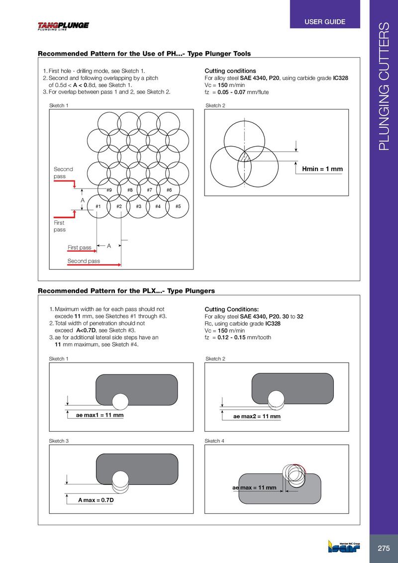 USER GUIDE Recommended Pattern for the Use of PH...- Type Plunger Tools 1. First hole - drilling mode, see Sketch 1. Cutting conditions 2. Second and following overlapping by a pitch For alloy steel SAE 4340, P20, using carbide grade IC328 of 0.5d < A < 0.8d, see Sketch 1. Vc = 150 m/min 3. For overlap between pass 1 and 2, see Sketch 2. fz = 0.05 - 0.07 mm/flute Sketch 1 Sketch 2 PLUNGING CUTTERS Second Hmin = 1 mm pass #9 #8 #7 #6 A #1 #2 #3 #4 #5 First pass First pass A Second pass Recommended Pattern for the PLX...- Type Plungers 1. Maximum width ae for each pass should not Cutting Conditions: excede 11 mm, see Sketches #1 through #3. For alloy steel SAE 4340, P20. 30 to 32 2. Total width of penetration should not Rc, using carbide grade IC328 exceed A<0.7D, see Sketch #3. Vc = 150 m/min 3. ae for additional lateral side steps have an fz = 0.12 - 0.15 mm/tooth 11 mm maximum, see Sketch #4. Sketch 1 Sketch 2 ae max1 = 11 mm ae max2 = 11 mm Sketch 3 Sketch 4 Dt Di ae max = 11 mm A max = 0.7D 275 275