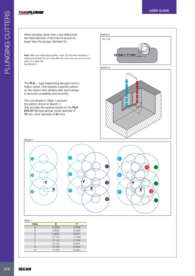 USER GUIDE When plunging starts from a pre-drilled hole, Sketch 5 the initial diameter of the hole Di should be Di > Dt Dt Di larger than the plunger diameter Dt. Note: After each axial plunge stroke, move 45º from the horizontal, a ae max = 11 mm distance of at least 0.5 mm. Only after this move can you move up and away for a rapid exit. See Sketch 6. Sketch 6 PLUNGING CUTTERS 0.5 mm min The PLH...- type (trepanning) plungers have a hollow center. This requires a specific pattern so the column that remains after each plunge is removed completely and smoothly. The coordinates in Table 1 produce the pattern shown in Sketch 7. This provides the optimal results for the PLH 45 ϒ D75-27-13 type plunger (outer diameter of 75 mm, inner diameter of 24 mm). Sketch 7 C C C F H F B B B Y Y E Y E X X A X A A G D D Table 1 Hole X Y A 0.0000 0.0000 B 0.0000 43.300 C 0.0000 86.601 D 37.125 -21.650 E 37.125 21.650 F 37.125 64.951 G 24.750 0.0000 H 12.375 64.951 276 276 ISCAR ISCAR