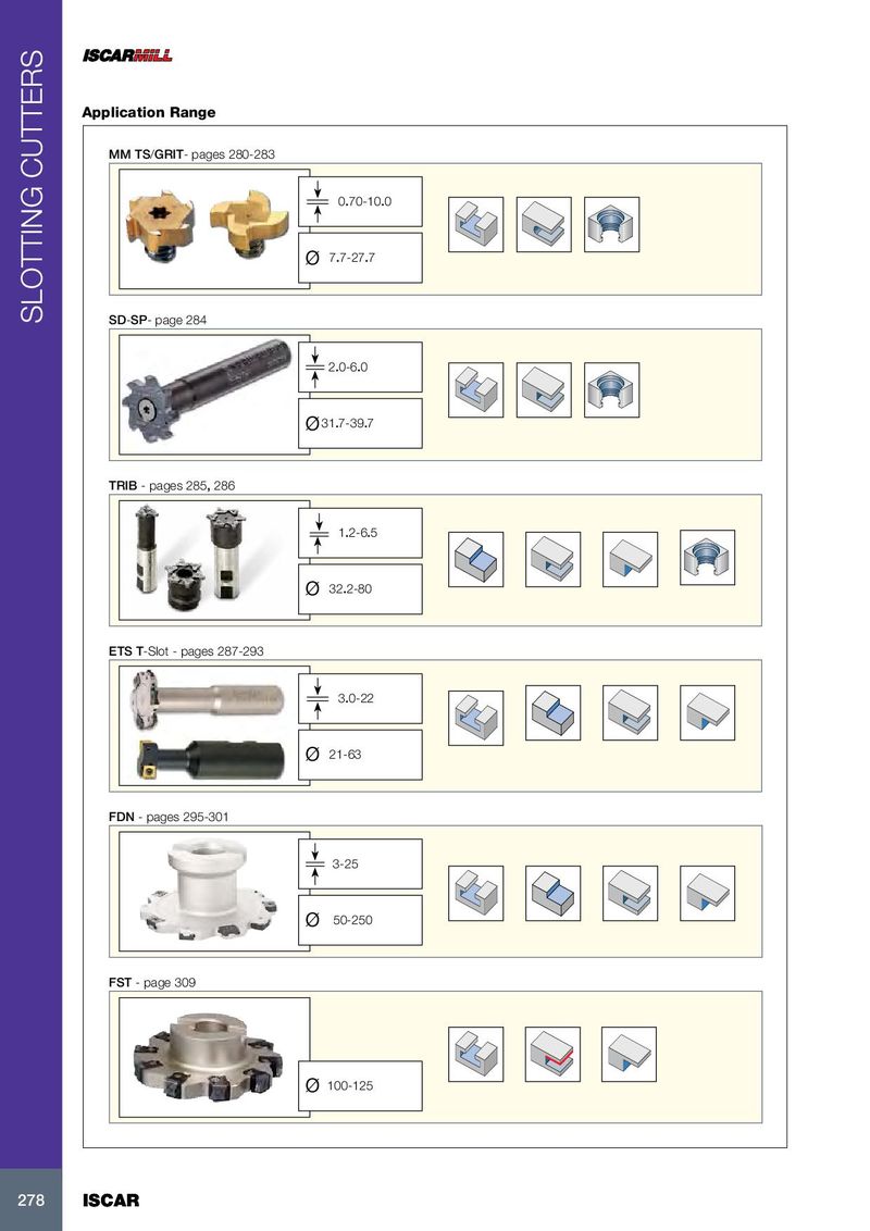 Application Range MM TS/GRIT- pages 280-283 0.70-10.0 ø 7.7-27.7 SLOTTING CUTTERS SD-SP- page 284 2.0-6.0 ø 31.7-39.7 TRIB - pages 285, 286 1.2-6.5 ø 32.2-80 ETS T-Slot - pages 287-293 3.0-22 ø 21-63 FDN - pages 295-301 3-25 ø 50-250 FST - page 309 12-16 ø 100-125 278 278 ISCAR ISCAR