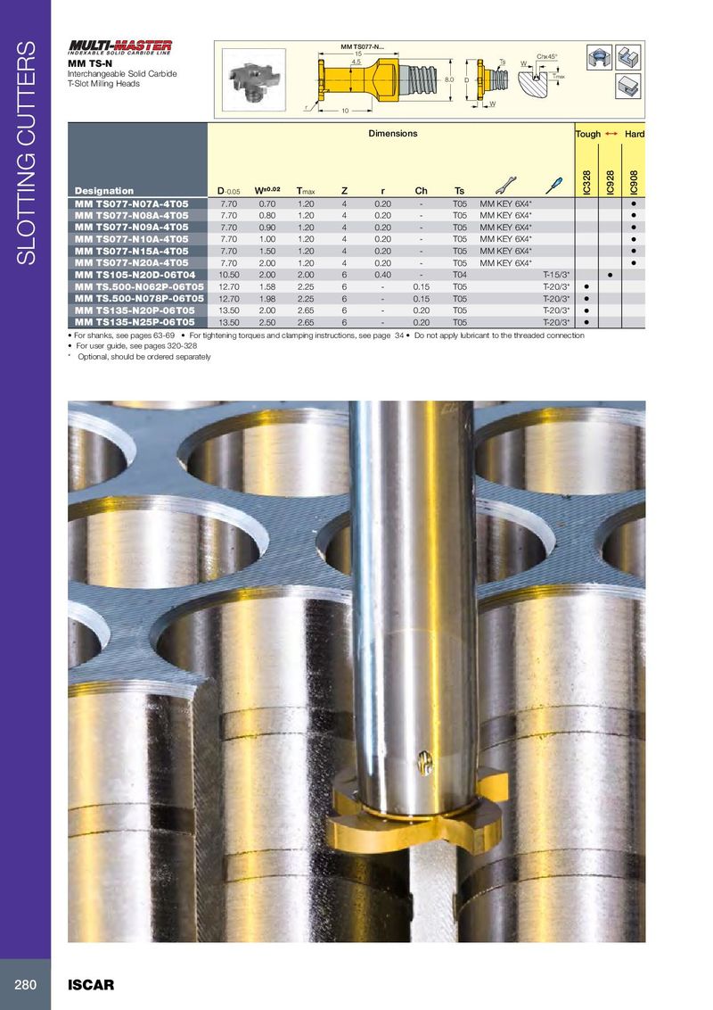 MM TS077-N... 15 Chx45° MM TS-N 4.5 Ts W Interchangeable Solid Carbide 8.0 Tmax D T-Slot Milling Heads r W 10 Dimensions Tough 1 Hard Designation D -0.05 W ±0.02 T max Z r Ch Ts IC328 IC928 IC908 MM TS077-N07A-4T05 7.70 0.70 1.20 4 0.20 - T05 MM KEY 6X4* • MM TS077-N08A-4T05 7.70 0.80 1.20 4 0.20 - T05 MM KEY 6X4* • MM TS077-N09A-4T05 7.70 0.90 1.20 4 0.20 - T05 MM KEY 6X4* • MM TS077-N10A-4T05 7.70 1.00 1.20 4 0.20 - T05 MM KEY 6X4* • MM TS077-N15A-4T05 7.70 1.50 1.20 4 0.20 - T05 MM KEY 6X4* • SLOTTING CUTTERS MM TS077-N20A-4T05 7.70 2.00 1.20 4 0.20 - T05 MM KEY 6X4* • MM TS105-N20D-06T04 10.50 2.00 2.00 6 0.40 - T04 T-15/3* • MM TS.500-N062P-06T05 12.70 1.58 2.25 6 - 0.15 T05 T-20/3* • MM TS.500-N078P-06T05 12.70 1.98 2.25 6 - 0.15 T05 T-20/3* • MM TS135-N20P-06T05 13.50 2.00 2.65 6 - 0.20 T05 T-20/3* • MM TS135-N25P-06T05 13.50 2.50 2.65 6 - 0.20 T05 T-20/3* • • For shanks, see pages 63-69 • For tightening torques and clamping instructions, see page 34 • Do not apply lubricant to the threaded connection • For user guide, see pages 320-328 * Optional, should be ordered separately 280 ISCAR