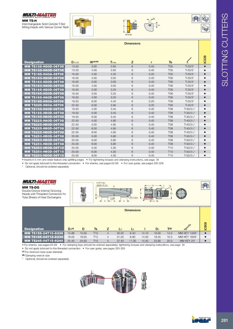 W MM TS-H Ts r Interchangeable Solid Carbide T-Slot D Tmax Milling Heads with Various Corner Radii W Dimensions Designation D -0.05 W ±0.02 T max Z r Ts IC328 MM TS135-H30D-06T05 13.50 3.00 2.65 6 0.40 T05 T-20/3* • MM TS135-H40D-06T05 13.50 4.00 2.65 6 0.40 T05 T-20/3* • MM TS165-H40A-06T05 16.50 4.00 4.25 6 0.20 T05 T-20/3* • MM TS160-H20D-06T06 16.00 2.00 3.00 6 0.40 T06 T-20/3* • MM TS160-H30D-06T06 16.00 3.00 3.00 6 0.40 T06 T-25/3* • MM TS160-H40D-06T06 16.00 4.00 3.00 6 0.40 T06 T-25/3* • SLOTTING CUTTERS MM TS165-H20D-06T06 16.50 2.00 3.25 6 0.40 T06 T-20/3* • MM TS165-H30D-06T06 16.50 3.00 3.25 6 0.40 T06 T-25/3* • MM TS165-H40D-06T06 16.50 4.00 3.25 6 0.40 T06 T-25/3* • MM TS195-H60A-06T06 19.50 6.00 4.45 6 0.20 T06 T-25/3* • MM TS225-H60A-06T06 22.50 6.00 5.95 6 0.20 T06 T-25/3* • MM TS195-H40D-06T08 19.50 4.00 3.45 6 0.40 T08 T-30/3 L* • MM TS195-H50D-06T08 19.50 5.00 3.45 6 0.40 T08 T-30/3 L* • MM TS195-H60D-06T08 19.50 6.00 3.45 6 0.40 T08 T-30/3 L* • MM TS225-H40D-06T08 22.50 4.00 4.90 6 0.40 T08 T-40/3 L* • MM TS225-H50D-06T08 22.50 5.00 4.95 6 0.40 T08 T-40/3 L* • MM TS225-H60D-06T08 22.50 6.00 4.95 6 0.40 T08 T-40/3 L* • MM TS225-H80D-06T08 22.50 8.00 4.95 6 0.40 T08 T-40/3 L* • MM TS250-H50D-06T08 25.00 5.00 5.90 6 0.40 T08 T-50/3 L* • MM TS250-H60D-06T08 25.00 6.00 5.90 6 0.40 T08 T-50/3 L* • MM TS250-H80D-06T08 25.00 8.00 5.90 6 0.40 T08 T-50/3 L* • MM TS250-H50D-06T10 25.00 5.00 4.30 6 0.40 T10 T-50/3 L* • MM TS250-H60D-06T10 25.00 6.00 4.30 6 0.40 T10 T-50/3 L* • MM TS250-H80D-06T10 25.00 8.00 4.30 6 0.40 T10 T-50/3 L* • • Inserts in 5 mm and wider feature chip splitting edges • For tightening torques and clamping instructions, see page 34 • Do not apply lubricant to the threaded connection • For shanks, see pages 63-69 • For user guide, see pages 320-328 * Optional, should be ordered separately 0.45 max. depth of cut A L5 T Ts MM TS-DG l Double-Groove Internal Grooving Heads with Threaded Connection for D D2 Tube Sheets of Heat Exchangers R0.3 Typx4 0.6 3 6 3 A L3 Dimensions Designation D 4 (1) D Ts Z L 5 L 3 l D 2 T (2) IC908 MM TS155-04T10-8238 15.88 15.50 T10 4 30.20 8.40 14.10 16.00 13.0 MM KEY 13X8* • MM TS185-04T12-8239 19.05 18.50 T12 4 31.20 8.80 14.50 18.45 16.0 MM KEY 16X9* • MM TS245-04T15-8240 25.40 24.50 T15 4 37.40 11.00 14.40 23.90 20.0 MM KEY 20* • • For shanks, see pages 63-69 • For clamping keys (should be ordered separately), tightening torques and clamping instructions, see page 34 • Do not apply lubricant to the threaded connection • For user guide, see pages 320-328 (1) For minimum tube outer diameter (2) Clamping wrench size * Optional, should be ordered separately 281