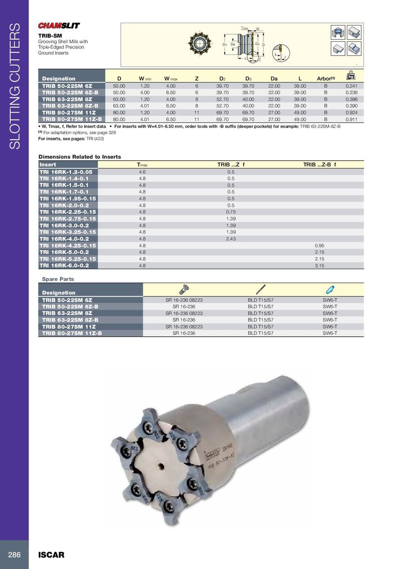 Tmax W TRIB-SM d D Grooving Shell Mills with D 3 Da D2 D Triple-Edged Precision Ground Inserts H L L f f . Designation D W min W max Z D 2 D 3 Da L Arbor (1) kg TRIB 50-22SM 6Z 50.00 1.20 4.00 6 39.70 39.70 22.00 39.00 B 0.241 TRIB 50-22SM 6Z-B 50.00 4.00 6.50 6 39.70 39.70 22.00 39.00 B 0.236 TRIB 63-22SM 8Z 63.00 1.20 4.00 8 52.70 40.00 22.00 39.00 B 0.396 TRIB 63-22SM 8Z-B 63.00 4.01 6.50 8 52.70 40.00 22.00 39.00 B 0.390 TRIB 80-27SM 11Z 80.00 1.20 4.00 11 69.70 69.70 27.00 49.00 B 0.924 TRIB 80-27SM 11Z-B 80.00 4.01 6.50 11 69.70 69.70 27.00 49.00 B 0.911 • W, Tmax, f, Refer to insert data • For inserts with W=4.01-6.50 mm, order tools with -B suffix (deeper pockets) for example: TRIB 63-22SM-8Z-B (1) For adaptation options, see page 328 For inserts, see pages: TRI (422) SLOTTING CUTTERS Dimensions Related to Inserts Insert T max TRIB ...Z f TRIB ...Z-B f TRI 16RK-1.2-0.05 4.6 0.5 TRI 16RK-1.4-0.1 4.8 0.5 TRI 16RK-1.5-0.1 4.8 0.5 TRI 16RK-1.7-0.1 4.8 0.5 TRI 16RK-1.95-0.15 4.8 0.5 TRI 16RK-2.0-0.2 4.8 0.5 TRI 16RK-2.25-0.15 4.8 0.75 TRI 16RK-2.75-0.15 4.8 1.39 TRI 16RK-3.0-0.2 4.8 1.39 TRI 16RK-3.25-0.15 4.8 1.39 TRI 16RK-4.0-0.2 4.8 2.43 TRI 16RK-4.25-0.15 4.8 0.95 TRI 16RK-5.0-0.2 4.8 2.15 TRI 16RK-5.25-0.15 4.8 2.15 TRI 16RK-6.0-0.2 4.8 3.15 Spare Parts Designation TRIB 50-22SM 6Z SR 16-236 08223 BLD T15/S7 SW6-T TRIB 50-22SM 6Z-B SR 16-236 BLD T15/S7 SW6-T TRIB 63-22SM 8Z SR 16-236 08223 BLD T15/S7 SW6-T TRIB 63-22SM 8Z-B SR 16-236 BLD T15/S7 SW6-T TRIB 80-27SM 11Z SR 16-236 08223 BLD T15/S7 SW6-T TRIB 80-27SM 11Z-B SR 16-236 BLD T15/S7 SW6-T 286 ISCAR