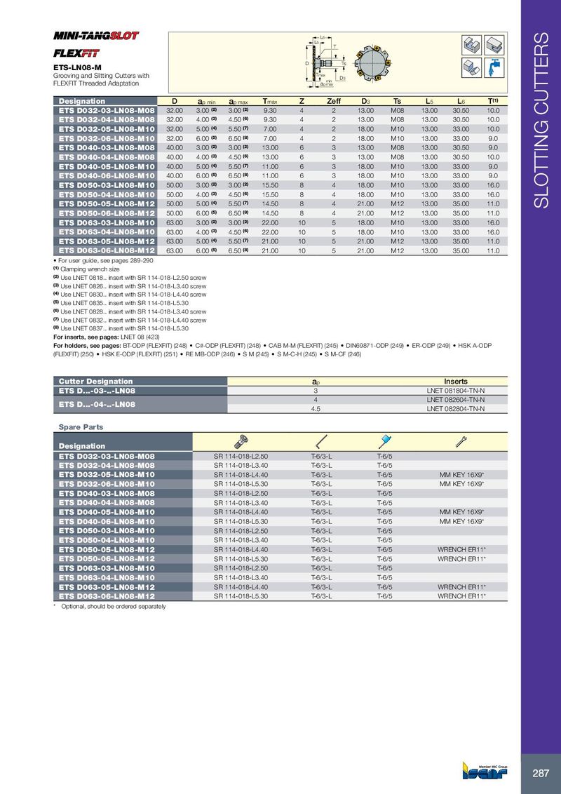 L6 L5 T D Ts ETS-LN08-M Grooving and Slitting Cutters with Tmax min D3 FLEXFIT Threaded Adaptation ap max Designation D a p min a p max T max Z Zeff D 3 Ts L 5 L 6 T (1) ETS D032-03-LN08-M08 32.00 3.00 (2) 3.00 (2) 9.30 4 2 13.00 M08 13.00 30.50 10.0 ETS D032-04-LN08-M08 32.00 4.00 (3) 4.50 (6) 9.30 4 2 13.00 M08 13.00 30.50 10.0 ETS D032-05-LN08-M10 32.00 5.00 (4) 5.50 (7) 7.00 4 2 18.00 M10 13.00 33.00 10.0 ETS D032-06-LN08-M10 32.00 6.00 (5) 6.50 (8) 7.00 4 2 18.00 M10 13.00 33.00 9.0 ETS D040-03-LN08-M08 40.00 3.00 (2) 3.00 (2) 13.00 6 3 13.00 M08 13.00 30.50 9.0 ETS D040-04-LN08-M08 40.00 4.00 (3) 4.50 (6) 13.00 6 3 13.00 M08 13.00 30.50 10.0 ETS D040-05-LN08-M10 40.00 5.00 (4) 5.50 (7) 11.00 6 3 18.00 M10 13.00 33.00 9.0 ETS D040-06-LN08-M10 40.00 6.00 (5) 6.50 (8) 11.00 6 3 18.00 M10 13.00 33.00 9.0 ETS D050-03-LN08-M10 50.00 3.00 (2) 3.00 (2) 15.50 8 4 18.00 M10 13.00 33.00 16.0 ETS D050-04-LN08-M10 50.00 4.00 (3) 4.50 (6) 15.50 8 4 18.00 M10 13.00 33.00 16.0 ETS D050-05-LN08-M12 50.00 5.00 (4) 5.50 (7) 14.50 8 4 21.00 M12 13.00 35.00 11.0 SLOTTING CUTTERS ETS D050-06-LN08-M12 50.00 6.00 (5) 6.50 (8) 14.50 8 4 21.00 M12 13.00 35.00 11.0 ETS D063-03-LN08-M10 63.00 3.00 (2) 3.00 (2) 22.00 10 5 18.00 M10 13.00 33.00 16.0 ETS D063-04-LN08-M10 63.00 4.00 (3) 4.50 (6) 22.00 10 5 18.00 M10 13.00 33.00 16.0 ETS D063-05-LN08-M12 63.00 5.00 (4) 5.50 (7) 21.00 10 5 21.00 M12 13.00 35.00 11.0 ETS D063-06-LN08-M12 63.00 6.00 (5) 6.50 (8) 21.00 10 5 21.00 M12 13.00 35.00 11.0 • For user guide, see pages 289-290 (1) Clamping wrench size (2) Use LNET 0818.. insert with SR 114-018-L2.50 screw (3) Use LNET 0826.. insert with SR 114-018-L3.40 screw (4) Use LNET 0830.. insert with SR 114-018-L4.40 screw (5) Use LNET 0835.. insert with SR 114-018-L5.30 (6) Use LNET 0828.. insert with SR 114-018-L3.40 screw (7) Use LNET 0832.. insert with SR 114-018-L4.40 screw (8) Use LNET 0837.. insert with SR 114-018-L5.30 For inserts, see pages: LNET 08 (423) For holders, see pages: BT-ODP (FLEXFIT) (248) • C#-ODP (FLEXFIT) (248) • CAB M-M (FLEXFIT) (245) • DIN69871-ODP (249) • ER-ODP (249) • HSK A-ODP (FLEXFIT) (250) • HSK E-ODP (FLEXFIT) (251) • RE MB-ODP (246) • S M (245) • S M-C-H (245) • S M-CF (246) Cutter Designation a p Inserts ETS D...-03-..-LN08 3 LNET 081804-TN-N 4 LNET 082604-TN-N ETS D...-04-..-LN08 4.5 LNET 082804-TN-N Spare Parts Designation ETS D032-03-LN08-M08 SR 114-018-L2.50 T-6/3-L T-6/5 ETS D032-04-LN08-M08 SR 114-018-L3.40 T-6/3-L T-6/5 ETS D032-05-LN08-M10 SR 114-018-L4.40 T-6/3-L T-6/5 MM KEY 16X9* ETS D032-06-LN08-M10 SR 114-018-L5.30 T-6/3-L T-6/5 MM KEY 16X9* ETS D040-03-LN08-M08 SR 114-018-L2.50 T-6/3-L T-6/5 ETS D040-04-LN08-M08 SR 114-018-L3.40 T-6/3-L T-6/5 ETS D040-05-LN08-M10 SR 114-018-L4.40 T-6/3-L T-6/5 MM KEY 16X9* ETS D040-06-LN08-M10 SR 114-018-L5.30 T-6/3-L T-6/5 MM KEY 16X9* ETS D050-03-LN08-M10 SR 114-018-L2.50 T-6/3-L T-6/5 ETS D050-04-LN08-M10 SR 114-018-L3.40 T-6/3-L T-6/5 ETS D050-05-LN08-M12 SR 114-018-L4.40 T-6/3-L T-6/5 WRENCH ER11* ETS D050-06-LN08-M12 SR 114-018-L5.30 T-6/3-L T-6/5 WRENCH ER11* ETS D063-03-LN08-M10 SR 114-018-L2.50 T-6/3-L T-6/5 ETS D063-04-LN08-M10 SR 114-018-L3.40 T-6/3-L T-6/5 ETS D063-05-LN08-M12 SR 114-018-L4.40 T-6/3-L T-6/5 WRENCH ER11* ETS D063-06-LN08-M12 SR 114-018-L5.30 T-6/3-L T-6/5 WRENCH ER11* * Optional, should be ordered separately 287