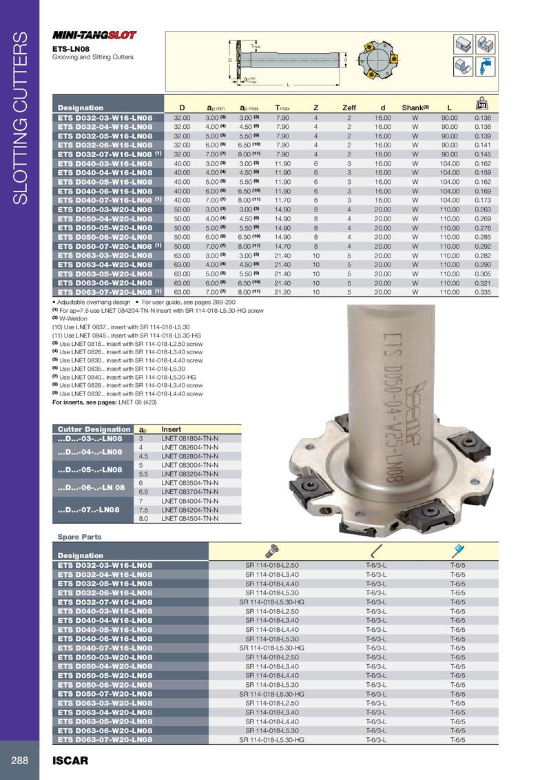 Tmax ETS-LN08 Grooving and Slitting Cutters D d ap min max L kg Designation D a p min a p max T max Z Zeff d Shank (2) L ETS D032-03-W16-LN08 32.00 3.00 (3) 3.00 (3) 7.90 4 2 16.00 W 90.00 0.136 ETS D032-04-W16-LN08 32.00 4.00 (4) 4.50 (8) 7.90 4 2 16.00 W 90.00 0.136 ETS D032-05-W16-LN08 32.00 5.00 (5) 5.50 (9) 7.90 4 2 16.00 W 90.00 0.139 ETS D032-06-W16-LN08 32.00 6.00 (6) 6.50 (10) 7.90 4 2 16.00 W 90.00 0.141 ETS D032-07-W16-LN08 (1) 32.00 7.00 (7) 8.00 (11) 7.90 4 2 16.00 W 90.00 0.145 ETS D040-03-W16-LN08 40.00 3.00 (3) 3.00 (3) 11.90 6 3 16.00 W 104.00 0.162 ETS D040-04-W16-LN08 40.00 4.00 (4) 4.50 (8) 11.90 6 3 16.00 W 104.00 0.159 ETS D040-05-W16-LN08 40.00 5.00 (5) 5.50 (9) 11.90 6 3 16.00 W 104.00 0.162 ETS D040-06-W16-LN08 40.00 6.00 (6) 6.50 (10) 11.90 6 3 16.00 W 104.00 0.169 SLOTTING CUTTERS ETS D040-07-W16-LN08 (1) 40.00 7.00 (7) 8.00 (11) 11.70 6 3 16.00 W 104.00 0.173 ETS D050-03-W20-LN08 50.00 3.00 (3) 3.00 (3) 14.90 8 4 20.00 W 110.00 0.263 ETS D050-04-W20-LN08 50.00 4.00 (4) 4.50 (8) 14.90 8 4 20.00 W 110.00 0.269 ETS D050-05-W20-LN08 50.00 5.00 (5) 5.50 (9) 14.90 8 4 20.00 W 110.00 0.276 ETS D050-06-W20-LN08 50.00 6.00 (6) 6.50 (10) 14.90 8 4 20.00 W 110.00 0.285 ETS D050-07-W20-LN08 (1) 50.00 7.00 (7) 8.00 (11) 14.70 8 4 20.00 W 110.00 0.292 ETS D063-03-W20-LN08 63.00 3.00 (3) 3.00 (3) 21.40 10 5 20.00 W 110.00 0.282 ETS D063-04-W20-LN08 63.00 4.00 (4) 4.50 (8) 21.40 10 5 20.00 W 110.00 0.290 ETS D063-05-W20-LN08 63.00 5.00 (5) 5.50 (9) 21.40 10 5 20.00 W 110.00 0.305 ETS D063-06-W20-LN08 63.00 6.00 (6) 6.50 (10) 21.40 10 5 20.00 W 110.00 0.321 ETS D063-07-W20-LN08 (1) 63.00 7.00 (7) 8.00 (11) 21.20 10 5 20.00 W 110.00 0.335 • Adjustable overhang design • For user guide, see pages 289-290 (1) For ap=7.5 use LNET 084204-TN-N insert with SR 114-018-L5.30-HG screw (2) W-Weldon (10) Use LNET 0837.. insert with SR 114-018-L5.30 (11) Use LNET 0845.. insert with SR 114-018-L5.30-HG (3) Use LNET 0818.. insert with SR 114-018-L2.50 screw (4) Use LNET 0826.. insert with SR 114-018-L3.40 screw (5) Use LNET 0830.. insert with SR 114-018-L4.40 screw (6) Use LNET 0835.. insert with SR 114-018-L5.30 (7) Use LNET 0840.. insert with SR 114-018-L5.30-HG (8) Use LNET 0828.. insert with SR 114-018-L3.40 screw (9) Use LNET 0832.. insert with SR 114-018-L4.40 screw For inserts, see pages: LNET 08 (423) Cutter Designation a p Insert ...D...-03-..-LN08 3 LNET 081804-TN-N 4 LNET 082604-TN-N ...D...-04-..-LN08 4.5 LNET 082804-TN-N 5 LNET 083004-TN-N ...D...-05-..-LN08 5.5 LNET 083204-TN-N 6 LNET 083504-TN-N ...D...-06-..-LN 08 6.5 LNET 083704-TN-N 7 LNET 084004-TN-N ...D...-07..-LN08 7.5 LNET 084204-TN-N 8.0 LNET 084504-TN-N Spare Parts Designation ETS D032-03-W16-LN08 SR 114-018-L2.50 T-6/3-L T-6/5 ETS D032-04-W16-LN08 SR 114-018-L3.40 T-6/3-L T-6/5 ETS D032-05-W16-LN08 SR 114-018-L4.40 T-6/3-L T-6/5 ETS D032-06-W16-LN08 SR 114-018-L5.30 T-6/3-L T-6/5 ETS D032-07-W16-LN08 SR 114-018-L5.30-HG T-6/3-L T-6/5 ETS D040-03-W16-LN08 SR 114-018-L2.50 T-6/3-L T-6/5 ETS D040-04-W16-LN08 SR 114-018-L3.40 T-6/3-L T-6/5 ETS D040-05-W16-LN08 SR 114-018-L4.40 T-6/3-L T-6/5 ETS D040-06-W16-LN08 SR 114-018-L5.30 T-6/3-L T-6/5 ETS D040-07-W16-LN08 SR 114-018-L5.30-HG T-6/3-L T-6/5 ETS D050-03-W20-LN08 SR 114-018-L2.50 T-6/3-L T-6/5 ETS D050-04-W20-LN08 SR 114-018-L3.40 T-6/3-L T-6/5 ETS D050-05-W20-LN08 SR 114-018-L4.40 T-6/3-L T-6/5 ETS D050-06-W20-LN08 SR 114-018-L5.30 T-6/3-L T-6/5 ETS D050-07-W20-LN08 SR 114-018-L5.30-HG T-6/3-L T-6/5 ETS D063-03-W20-LN08 SR 114-018-L2.50 T-6/3-L T-6/5 ETS D063-04-W20-LN08 SR 114-018-L3.40 T-6/3-L T-6/5 ETS D063-05-W20-LN08 SR 114-018-L4.40 T-6/3-L T-6/5 ETS D063-06-W20-LN08 SR 114-018-L5.30 T-6/3-L T-6/5 ETS D063-07-W20-LN08 SR 114-018-L5.30-HG T-6/3-L T-6/5 288 ISCAR