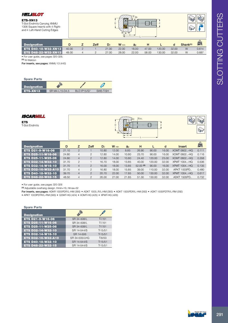 W D2 ETS-XN13 T-Slot Endmills Carrying XNMU D d 1306 Square Inserts with 4 Right- and 4 Left-Hand Cutting Edges ap H L kg Designation D Z Zeff D 2 W min a p H L d Shank (1) ETS D40-18-W32-XN13 40.00 2 1 21.00 22.00 18.00 47.00 120.00 32.00 W 0.614 ETS D48-22-W32-XN13 48.00 4 2 27.00 28.00 22.00 58.00 130.00 32.00 W 0.687 • For user guide, see pages 320-328. (1) W-Weldon For inserts, see pages: XNMU 13 (443) Spare Parts SLOTTING CUTTERS Designation ETS-XN13 SR M4-L15-D4.5 BLD IP15/S7 SW6-T-SH D2 Wmin ETS T-Slot Endmills D d ap H L kg Designation D Z Zeff D 2 W min a p H L d Insert ETS D21-9-W16-06 21.10 2 1 10.80 12.00 8.85 26.90 90.00 16.00 XOMT 0602..-HQ 0.111 ETS D25-11-W16-06 24.80 4 2 12.80 14.00 10.80 23.70 90.00 16.00 XOMT 0602..-HQ 0.116 ETS D25-11-W25-06 24.80 4 2 12.80 14.00 10.80 24.40 120.00 25.00 XOMT 0602..-HQ 0.358 ETS D32-14-W32-10 31.70 2 1 16.70 18.00 13.85 40.00 120.00 32.00 XPMT 1004..-HQ 0.536 ETS D32-14-W16-10 31.70 4 2 16.00 18.00 13.85 52.00 (1) 90.00 16.00 XPMT 1004..-HQ 0.135 ETS D32-16-W32-A10 31.70 4 2 16.80 18.00 15.85 39.00 110.00 32.00 APKT 1003PD.. 0.480 ETS D40-18-W32-10 39.70 4 2 20.70 22.00 17.85 50.00 130.00 32.00 XPMT 1004..-HQ 0.617 ETS D48-22-W32-15 48.50 4 2 26.00 27.00 21.85 51.30 130.00 32.00 ADKT 1505PD.. 0.732 • For user guide, see pages 320-328 (1) Adjustable overhang design. Hmin=19, Hmax=52 For inserts, see pages: ADKR 1505PDR/L-HM (390) • ADKT 1505..R/L-HM (393) • ADKT 1505PDR/L-HM (392) • ADKT 1505PDTR/L-RM (392) • APKT 1003PDTR/L-RM (385) • QOMT-HQ (424) • XOMT-HQ (425) • XPMT-HQ (426) Spare Parts Designation ETS D21-9-W16-06 SR 34-508/L T-7/51 ETS D25-11-W16-06 SR 34-508/L T-7/51 ETS D25-11-W25-06 SR 34-508/L T-7/51 ETS D32-14-W32-10 SR 14-544/S T-15/51 ETS D32-14-W16-10 SR 14-506 T-15/51 ETS D32-16-W32-A10 SR 34-505/LHG T-8/53 ETS D40-18-W32-10 SR 14-544/S T-15/51 ETS D48-22-W32-15 SR 14-544/S T-15/51 291