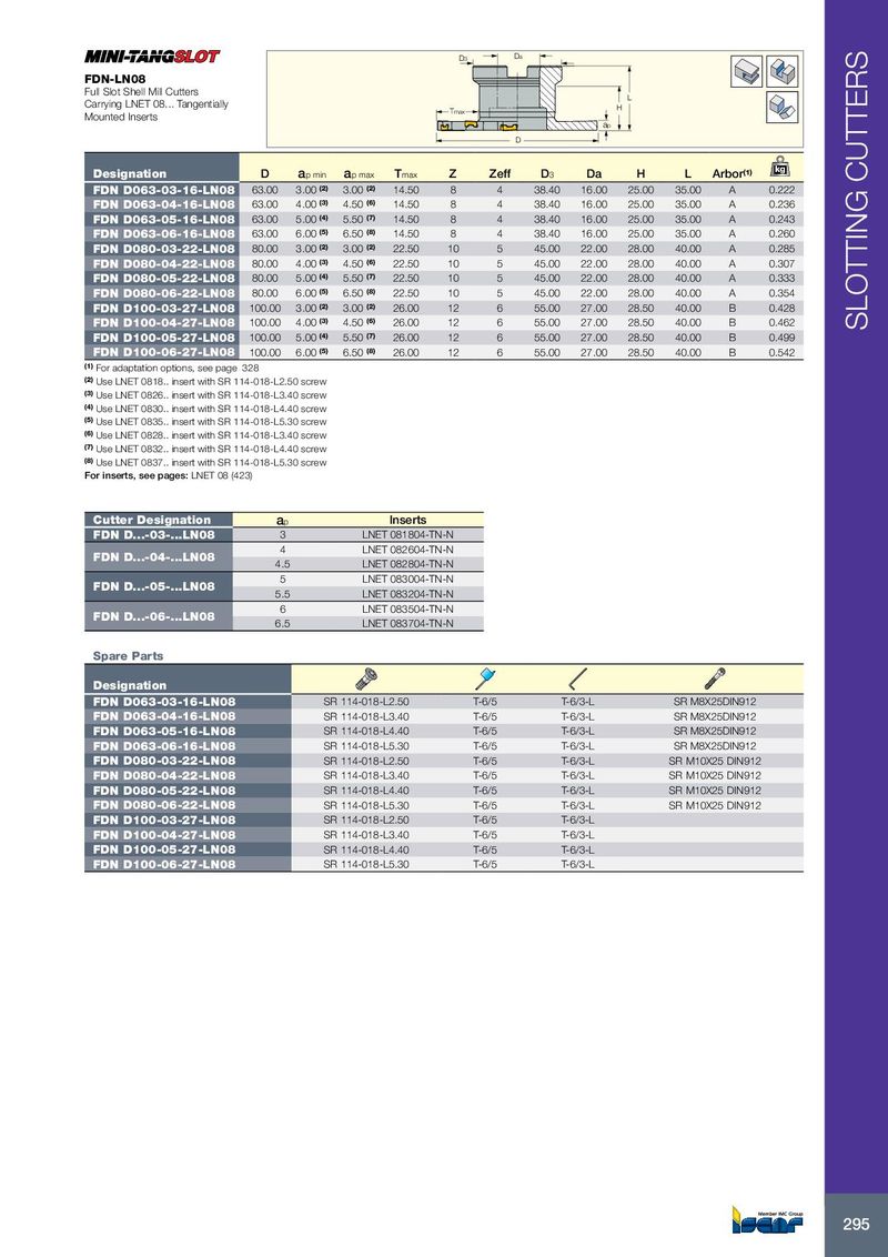 D3 Da FDN-LN08 Full Slot Shell Mill Cutters L Carrying LNET 08... Tangentially Tmax H Mounted Inserts ap D kg Designation D a p min a p max T max Z Zeff D 3 Da H L Arbor (1) FDN D063-03-16-LN08 63.00 3.00 (2) 3.00 (2) 14.50 8 4 38.40 16.00 25.00 35.00 A 0.222 FDN D063-04-16-LN08 63.00 4.00 (3) 4.50 (6) 14.50 8 4 38.40 16.00 25.00 35.00 A 0.236 FDN D063-05-16-LN08 63.00 5.00 (4) 5.50 (7) 14.50 8 4 38.40 16.00 25.00 35.00 A 0.243 FDN D063-06-16-LN08 63.00 6.00 (5) 6.50 (8) 14.50 8 4 38.40 16.00 25.00 35.00 A 0.260 FDN D080-03-22-LN08 80.00 3.00 (2) 3.00 (2) 22.50 10 5 45.00 22.00 28.00 40.00 A 0.285 FDN D080-04-22-LN08 80.00 4.00 (3) 4.50 (6) 22.50 10 5 45.00 22.00 28.00 40.00 A 0.307 FDN D080-05-22-LN08 80.00 5.00 (4) 5.50 (7) 22.50 10 5 45.00 22.00 28.00 40.00 A 0.333 FDN D080-06-22-LN08 80.00 6.00 (5) 6.50 (8) 22.50 10 5 45.00 22.00 28.00 40.00 A 0.354 FDN D100-03-27-LN08 100.00 3.00 (2) 3.00 (2) 26.00 12 6 55.00 27.00 28.50 40.00 B 0.428 FDN D100-04-27-LN08 100.00 4.00 (3) 4.50 (6) 26.00 12 6 55.00 27.00 28.50 40.00 B 0.462 SLOTTING CUTTERS FDN D100-05-27-LN08 100.00 5.00 (4) 5.50 (7) 26.00 12 6 55.00 27.00 28.50 40.00 B 0.499 FDN D100-06-27-LN08 100.00 6.00 (5) 6.50 (8) 26.00 12 6 55.00 27.00 28.50 40.00 B 0.542 (1) For adaptation options, see page 328 (2) Use LNET 0818.. insert with SR 114-018-L2.50 screw (3) Use LNET 0826.. insert with SR 114-018-L3.40 screw (4) Use LNET 0830.. insert with SR 114-018-L4.40 screw (5) Use LNET 0835.. insert with SR 114-018-L5.30 screw (6) Use LNET 0828.. insert with SR 114-018-L3.40 screw (7) Use LNET 0832.. insert with SR 114-018-L4.40 screw (8) Use LNET 0837.. insert with SR 114-018-L5.30 screw For inserts, see pages: LNET 08 (423) Cutter Designation a p Inserts FDN D...-03-...LN08 3 LNET 081804-TN-N 4 LNET 082604-TN-N FDN D...-04-...LN08 4.5 LNET 082804-TN-N 5 LNET 083004-TN-N FDN D...-05-...LN08 5.5 LNET 083204-TN-N 6 LNET 083504-TN-N FDN D...-06-...LN08 6.5 LNET 083704-TN-N Spare Parts Designation FDN D063-03-16-LN08 SR 114-018-L2.50 T-6/5 T-6/3-L SR M8X25DIN912 FDN D063-04-16-LN08 SR 114-018-L3.40 T-6/5 T-6/3-L SR M8X25DIN912 FDN D063-05-16-LN08 SR 114-018-L4.40 T-6/5 T-6/3-L SR M8X25DIN912 FDN D063-06-16-LN08 SR 114-018-L5.30 T-6/5 T-6/3-L SR M8X25DIN912 FDN D080-03-22-LN08 SR 114-018-L2.50 T-6/5 T-6/3-L SR M10X25 DIN912 FDN D080-04-22-LN08 SR 114-018-L3.40 T-6/5 T-6/3-L SR M10X25 DIN912 FDN D080-05-22-LN08 SR 114-018-L4.40 T-6/5 T-6/3-L SR M10X25 DIN912 FDN D080-06-22-LN08 SR 114-018-L5.30 T-6/5 T-6/3-L SR M10X25 DIN912 FDN D100-03-27-LN08 SR 114-018-L2.50 T-6/5 T-6/3-L FDN D100-04-27-LN08 SR 114-018-L3.40 T-6/5 T-6/3-L FDN D100-05-27-LN08 SR 114-018-L4.40 T-6/5 T-6/3-L FDN D100-06-27-LN08 SR 114-018-L5.30 T-6/5 T-6/3-L 295