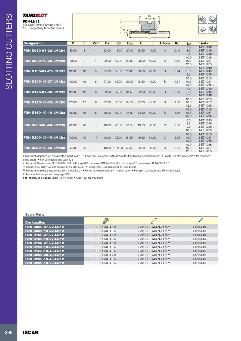 D 3 Da FDN-LN12 Full Slot Cutters Carrying LNET 12... Tangentially Mounted Inserts L H Tmax ap D Designation D Z Zeff Da D3 T max H L Arbor (4) Kg ap Inserts 7.0 LNET 1240.. FDN D080-07-22-LN12 (1) 80.00 8 4 22.00 45.00 22.00 28.20 40.00 A 0.40 8.0 LNET 1245... 8.5 LNET 1248.. 10.0 LNET 1255.. FDN D080-10-22-LN12 (2) 80.00 8 4 22.00 45.00 22.00 28.20 40.00 A 0.40 10.5 LNET 1257.. 12.0 LNET 1265... 7.0 LNET 1240.. FDN D100-07-27-LN12 (1) 100.00 10 5 27.00 55.00 25.00 28.50 40.00 B 0.44 8.0 LNET 1245.. 8.5 LNET 1248... 10.0 LNET 1255.. FDN D100-10-27-LN12 (2) 100.00 10 5 27.00 55.00 25.00 28.50 40.00 B 0.61 10.5 LNET 1257.. 12.0 LNET 1265... SLOTTING CUTTERS 7.0 LNET 1240.. FDN D125-07-32-LN12 (1) 125.00 12 6 32.00 65.00 34.50 32.00 45.00 B 0.60 8.0 LNET 1245.. 8.5 LNET 1248... 10.0 LNET 1255.. FDN D125-10-32-LN12 (2) 125.00 12 6 32.00 65.00 34.50 32.00 45.00 B 1.30 10.5 LNET 1257.. 12.0 LNET 1265... 10.0 LNET 1255.. FDN D160-10-40-LN12 (2) 160.00 16 8 40.00 80.00 44.00 33.50 50.00 B 1.76 10.5 LNET 1257.. 12.0 LNET 1265... 8.0 LNET 1245.. 8.5 LNET 1248.. FDN D200-08-40-LN12 (3) 200.00 20 10 40.00 92.00 51.50 49.50 50.00 C 2.63 9.0 LNET 1250... 10.0 LNET 1255.. 10.0 LNET 1255.. FDN D200-10-40-LN12 (2) 200.00 20 10 40.00 92.00 51.50 49.50 50.00 C 2.95 10.5 LNET 1257.. 12.0 LNET 1265... 10.0 LNET 1255.. FDN D250-10-60-LN12 (2) 250.00 26 13 40.00 132.00 56.50 62.50 63.00 C 5.91 10.5 LNET 1257.. 12.0 LNET 1265... • Slot width depends on the selected insert width • Each tool is supplied with screws for the thinnest specified insert • Verify use of correct screw for the insert being used • For user guide, see 320-328 (1) For ap=7.0 use screw SR 14-500-L5.9 • For ap=8.0 use screw SR 14-500-L6.5 • For ap=8.5 use screw SR 14-500-L7.0 (2) For ap=10.0 and 10.5 use screw SR 14-500-L8.5 • For ap=12.0 use screw SR 14-500-L10.0 (3) For ap=8.0 and 8.5 use screw SR 14-500-L7.0 • For ap=9.0 use screw SR 14-500-L8.0 • For ap=10.0 use screw SR 14-500-L8.5 (4) For adaptation options, see page 328 For inserts, see pages: LNET 12-TN (423) • LNET 12-TN-MM (424) Spare Parts Designation FDN D080-07-22-LN12 SR 14-500-L5.9 RATCHET WRENCH KEY T-15/51-BE FDN D080-10-22-LN12 SR 14-500-L8.5 RATCHET WRENCH KEY T-15/51-BE FDN D100-07-27-LN12 SR 14-500-L5.9 RATCHET WRENCH KEY T-15/51-BE FDN D100-10-27-LN12 SR 14-500-L8.5 RATCHET WRENCH KEY T-15/51-BE FDN D125-07-32-LN12 SR 14-500-L5.9 RATCHET WRENCH KEY T-15/51-BE FDN D125-10-32-LN12 SR 14-500-L8.5 RATCHET WRENCH KEY T-15/51-BE FDN D160-10-40-LN12 SR 14-500-L8.5 RATCHET WRENCH KEY T-15/51-BE FDN D200-08-40-LN12 SR 14-500-L7.0 RATCHET WRENCH KEY T-15/51-BE FDN D200-10-40-LN12 SR 14-500-L8.5 RATCHET WRENCH KEY T-15/51-BE FDN D250-10-60-LN12 SR 14-500-L8.5 RATCHET WRENCH KEY T-15/51-BE 296 ISCAR