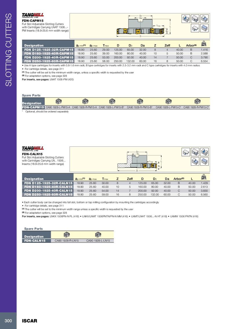 D3 Da FDN-CAPM15 Full Slot Adjustable Slotting Cutters Tmax with Cartridges Carrying LNAT 1506...- L PM Inserts (18.9-25.6 mm width range) ap D kg Designation a p min (1) a p max T max D D 3 Da Z Zeff L Arbor (2) FDN D125-1925-32R-CAPM15 18.90 25.60 29.00 125.00 65.00 32.00 8 4 40.00 B 1.416 FDN D160-1925-40R-CAPM15 18.90 25.60 39.00 160.00 80.00 40.00 10 5 50.00 B 2.588 FDN D200-1925-40R-CAPM15 18.90 25.60 53.00 200.00 92.00 40.00 14 7 50.00 C 3.790 FDN D250-1925-60R-CAPM15 18.90 25.60 58.00 250.00 132.00 60.00 16 8 50.00 C 6.554 • Use A type cartridges for inserts with 0.8-1.6 mm radii, B type cartridges for inserts with 2.5-3.2 mm radii and C type cartridges for inserts with 4.0 mm radius • For cartridge details, see page 311 (1) The cutter will be set to the minimum width range, unless a specific width is requested by the user (2) For adaptation options, see page 328 For inserts, see pages: LNAT 1506-PM (420) SLOTTING CUTTERS Spare Parts Designation FDN-CAPM15 CA90 1928-L-PM15-A CA90 1928-R-PM15-A CA90 1928-L-PM15-B* CA90 1928-R-PM15-B* CA90 1928-L-PM15-C* CA90 1928-R-PM15-C* * Optional, should be ordered separately D 3 FDN-CALN15 Da Full Slot Adjustable Slotting Cutters with Cartridges Carrying LN.. 1506... Tmax L Inserts (18.9-25.6 mm width range) ap D Designation a p min (1) a p max T max Z Zeff D D 3 Da Arbor (2) kg L FDN D125-1925-32R-CALN15 18.90 25.60 30.00 8 4 125.00 65.00 32.00 B 40.00 1.429 FDN D160-1925-40R-CALN15 18.90 25.60 40.00 10 5 160.00 80.00 40.00 B 50.00 2.613 FDN D200-1925-40R-CALN15 18.90 25.60 54.00 14 7 200.00 92.00 40.00 C 50.00 3.830 FDN D250-1925-60R-CALN15 18.90 25.60 59.00 16 8 250.00 132.00 60.00 C 50.00 6.560 • Each cutter body can be changed into full slot, bottom or top milling configuration by mounting the cartridges accordingly • For cartridge details, see page 311 (1) The cutter will be set to the minimum width range unless a specific width is requested by the user (2) For adaptation options, see page 328 For inserts, see pages: LNKX 1506PN-N PL (416) • LNKX/LNMT 1506PNTN/PN-N MM (416) • LNMT/LNHT 1506...-N HT (418) • LNMW 1506 PNTN (416) Spare Parts Designation FDN-CALN15 CA90 1928-R-LN15 CA90 1928-L-LN15 300 ISCAR