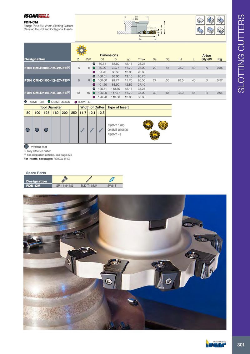 D3 Da FDN-CM Flange Type Full Width Slotting Cutters Tmax L Carrying Round and Octagonal Inserts H ap D D1 Dimensions Arbor Designation Z Zeff D1 D ap Tmax Da D3 H L Style (1) Kg 80.51 68.60 12.15 23.25 FDN CM-D080-12-22-FE (1) 6 6 80.00 72.77 11.70 23.00 22 45 28.2 40 A 0.35 81.20 68.50 12.85 23.60 100.51 88.60 12.15 26.75 FDN CM-D100-12-27-FE (1) 8 8 100.00 92.77 11.70 26.50 27 55 28.5 40 B 0.57 101.20 88.50 12.85 27.10 125.51 113.60 12.15 35.25 FDN CM-D125-12-32-FE (1) 10 10 125.00 117.77 11.70 35.00 32 65 32.0 45 B 0.94 SLOTTING CUTTERS 126.20 113.50 12.85 35.60 R90MT 1205 O45MT 050505 R90MT 43 Tool Diameter Width of Cutter Type of Insert 80 100 125 160 200 250 11.7 12.1 12.8 R90MT 1205 O45MT 050505 R90MT 43 Without seat (1) Fully effective cutter (2) For adaptation options, see page 328 For inserts, see pages: R90CW (449) Spare Parts Designation FDN-CM SR 14-544/S BLD T15/M7 SW6-T 301