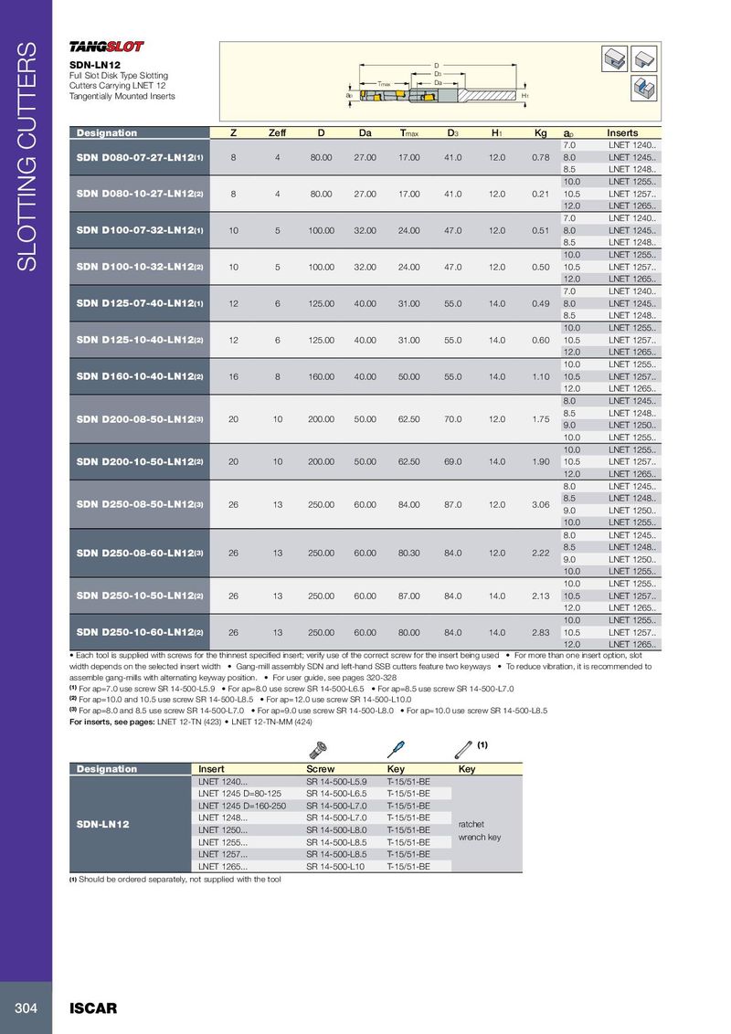 SDN-LN12 D Full Slot Disk Type Slotting D 3 Cutters Carrying LNET 12 Tmax Da Tangentially Mounted Inserts ap H1 Designation Z Zeff D Da T max D 3 H 1 Kg a p Inserts 7.0 LNET 1240.. SDN D080-07-27-LN12 (1) 8 4 80.00 27.00 17.00 41.0 12.0 0.78 8.0 LNET 1245.. 8.5 LNET 1248.. 10.0 LNET 1255.. SDN D080-10-27-LN12 (2) 8 4 80.00 27.00 17.00 41.0 12.0 0.21 10.5 LNET 1257.. 12.0 LNET 1265.. 7.0 LNET 1240.. SDN D100-07-32-LN12 (1) 10 5 100.00 32.00 24.00 47.0 12.0 0.51 8.0 LNET 1245.. 8.5 LNET 1248.. 10.0 LNET 1255.. SLOTTING CUTTERS SDN D100-10-32-LN12 (2) 10 5 100.00 32.00 24.00 47.0 12.0 0.50 10.5 LNET 1257.. 12.0 LNET 1265.. 7.0 LNET 1240.. SDN D125-07-40-LN12 (1) 12 6 125.00 40.00 31.00 55.0 14.0 0.49 8.0 LNET 1245.. 8.5 LNET 1248.. 10.0 LNET 1255.. SDN D125-10-40-LN12 (2) 12 6 125.00 40.00 31.00 55.0 14.0 0.60 10.5 LNET 1257.. 12.0 LNET 1265.. 10.0 LNET 1255.. SDN D160-10-40-LN12 (2) 16 8 160.00 40.00 50.00 55.0 14.0 1.10 10.5 LNET 1257.. 12.0 LNET 1265.. 8.0 LNET 1245.. 8.5 LNET 1248.. SDN D200-08-50-LN12 (3) 20 10 200.00 50.00 62.50 70.0 12.0 1.75 9.0 LNET 1250.. 10.0 LNET 1255.. 10.0 LNET 1255.. SDN D200-10-50-LN12 (2) 20 10 200.00 50.00 62.50 69.0 14.0 1.90 10.5 LNET 1257.. 12.0 LNET 1265.. 8.0 LNET 1245.. 8.5 LNET 1248.. SDN D250-08-50-LN12 (3) 26 13 250.00 60.00 84.00 87.0 12.0 3.06 9.0 LNET 1250.. 10.0 LNET 1255.. 8.0 LNET 1245.. 8.5 LNET 1248.. SDN D250-08-60-LN12 (3) 26 13 250.00 60.00 80.30 84.0 12.0 2.22 9.0 LNET 1250.. 10.0 LNET 1255.. 10.0 LNET 1255.. SDN D250-10-50-LN12 (2) 26 13 250.00 60.00 87.00 84.0 14.0 2.13 10.5 LNET 1257.. 12.0 LNET 1265.. 10.0 LNET 1255.. SDN D250-10-60-LN12 (2) 26 13 250.00 60.00 80.00 84.0 14.0 2.83 10.5 LNET 1257.. 12.0 LNET 1265.. • Each tool is supplied with screws for the thinnest specified insert; verify use of the correct screw for the insert being used • For more than one insert option, slot width depends on the selected insert width • Gang-mill assembly SDN and left-hand SSB cutters feature two keyways • To reduce vibration, it is recommended to assemble gang-mills with alternating keyway position. • For user guide, see pages 320-328 (1) For ap=7.0 use screw SR 14-500-L5.9 • For ap=8.0 use screw SR 14-500-L6.5 • For ap=8.5 use screw SR 14-500-L7.0 (2) For ap=10.0 and 10.5 use screw SR 14-500-L8.5 • For ap=12.0 use screw SR 14-500-L10.0 (3) For ap=8.0 and 8.5 use screw SR 14-500-L7.0 • For ap=9.0 use screw SR 14-500-L8.0 • For ap=10.0 use screw SR 14-500-L8.5 For inserts, see pages: LNET 12-TN (423) • LNET 12-TN-MM (424) (1) Designation Insert Screw Key Key LNET 1240... SR 14-500-L5.9 T-15/51-BE LNET 1245 D=80-125 SR 14-500-L6.5 T-15/51-BE LNET 1245 D=160-250 SR 14-500-L7.0 T-15/51-BE LNET 1248... SR 14-500-L7.0 T-15/51-BE SDN-LN12 ratchet LNET 1250... SR 14-500-L8.0 T-15/51-BE wrench key LNET 1255... SR 14-500-L8.5 T-15/51-BE LNET 1257... SR 14-500-L8.5 T-15/51-BE LNET 1265... SR 14-500-L10 T-15/51-BE (1) Should be ordered separately, not supplied with the tool 304 ISCAR