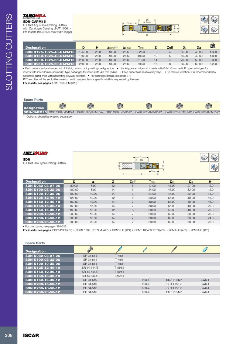 D3 SDN-CAPM15 Tmax Da Full Slot Adjustable Slotting Cutters with Cartridges Carrying LNAT 1506...- ap H1 PM Inserts (18.9-25.6 mm width range) D Designation D H 1 a p min (1) kg a p max T max Z Zeff D 3 Da SDN D125-1925-40-CAPM15 125.00 26.0 18.90 25.60 32.50 8 4 56.00 40.00 1.300 SDN D160-1925-40-CAPM15 160.00 26.0 18.90 25.60 48.50 10 5 56.00 40.00 1.888 SDN D200-1925-50-CAPM15 200.00 26.0 18.90 25.60 61.50 14 7 70.00 50.00 3.300 SDN D250-1925-60-CAPM15 250.00 26.0 18.90 25.60 79.00 16 8 85.00 60.00 5.200 • Each cutter can be changed into full slot, bottom or top milling configuration • Use A type cartridges for inserts with 0.8-1.6 mm radii, B type cartridges for inserts with 2.5-3.2 mm radii and C type cartridges for insertswith 4.0 mm radius • Each cutter features two keyways. • To reduce vibration, it is recommended to assemble gang-mills with alternating keyway position. • For cartridge details, see page 311 (1) The cutter will be set to the minimum width range unless a specific width is requested by the user For inserts, see pages: LNAT 1506-PM (420) SLOTTING CUTTERS Spare Parts Designation SDN-CAPM15 CA90 1928-L-PM15-A CA90 1928-R-PM15-A CA90 1928-L-PM15-B* CA90 1928-R-PM15-B* CA90 1928-L-PM15-C* CA90 1928-R-PM15-C* * Optional, should be ordered separately D 3 SDN Da Full Slot Disk Type Slotting Cutters H1 ap Tmax D Designation D a p Z Zeff T max D 3 Da H 1 SDN D080-08-27-06 80.00 8.00 12 6 17.00 41.00 27.00 12.0 SDN D100-08-32-06 100.00 8.00 14 7 24.00 47.00 32.00 12.0 SDN D100-10-32-06 100.00 10.00 14 7 24.00 47.00 32.00 14.0 SDN D125-12-40-10 125.00 12.00 12 6 33.00 55.00 40.00 16.0 SDN D160-12-40-10 160.00 12.00 14 7 50.00 55.00 40.00 16.0 SDN D160-16-40-10 160.00 16.00 14 7 50.00 55.00 40.00 20.0 SDN D160-16-40-12 160.00 16.00 12 6 50.00 55.00 40.00 20.0 SDN D200-16-50-12 200.00 16.00 14 7 63.00 69.00 50.00 20.0 SDN D200-18-50-12 200.00 18.00 14 7 50.00 69.00 50.00 24.0 SDN D200-20-50-12 200.00 20.00 14 7 63.00 69.00 50.00 26.0 • For user guide, see pages 320-328 For inserts, see pages: QDCT-PDN (427) • QDMT 1205..PDTN-M (427) • QOMT-HQ (424) • QPMT 100408PDTN (425) • XOMT-HQ (425) • XPMT-HQ (426) Spare Parts Designation SDN D080-08-27-06 SR 34-514 T-7/51 SDN D100-08-32-06 SR 34-514 T-7/51 SDN D100-10-32-06 SR 34-514 T-7/51 SDN D125-12-40-10 SR 14-544/S T-15/51 SDN D160-12-40-10 SR 14-544/S T-15/51 SDN D160-16-40-10 SR 14-544/S T-15/51 SDN D160-16-40-12 SR 34-510 PN 3-4 BLD T15/M7 SW6-T SDN D200-16-50-12 SR 34-510 PN 3-4 BLD T15/L7 SW6-T SDN D200-18-50-12 SR 34-510 PN 3-4 BLD T15/L7 SW6-T SDN D200-20-50-12 SR 34-510 PN 3-4 BLD T15/M7 SW6-T 308 ISCAR