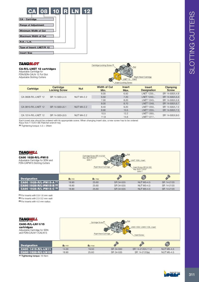 CA 08 10 R LN 12 CA - Cartridge Range of Adjustment Minimum Width of Cut Maximum Width of Cut R.H. / L.H. Type of Insert: LNET/R 12 Insert Size Cartridge Locking Screw (1) Nut CA-R/L-LNET 12 cartridges Adjustable Cartridge for SLOTTING CUTTERS FDN/SDN-CALN 12 Full Slot Adjustable Slotting Cutters Right-Hand Cartridge LNET 12... Insert Insert Locking Screw Cartridge Width of Cut Insert Insert Clamping Cartridge Nut Locking Screw Min. Max. Designation Screw 6.00 6.50 LNET 1235... SR 14-500/L4.9 CA 0608-R/L-LNET 12 SR 14-500-L4.5 NUT M4-2.2 6.50 7.20 LNET 1240... SR 14-500/L5.3 7.00 8.20 LNET 1245.. SR 14-500/L5.9 8.00 8.70 LNET 1248.. SR 14-500/L6.7 CA 0810-R/L-LNET 12 SR 14-500-L6.1 NUT M4-2.2 8.40 9.20 LNET 1250.. SR 14-500/L7.0 8.90 10.5 LNET 1255.. SR 14-500/L7.5 10.5 12.2 LNET 1265.. CA 1014-R/L-LNET 12 SR 14-500-L8.5 NUT M4-2.2 SR 14-500/L9.0 11.9 14.6 LNET 1277.. Each insert size should be ordered with its appropriate screw. When changing insert size, a new screw has to be ordered Keys:Torx T-15/51-BE Ratchet wrench key (1) Tightening torque: 4.5 ÷ 5Nxm Nut Cartridge Screw-SR 14-2120 CA90 1928-R/L-PM15 Key: BLD IP25/S7 Adjustable Cartridge for SDN and SW6-T LNAT 1506...Insert FDN-CAPM15 Slotting Cutters Right Hand Cartridge Insert Screw-SR 34-535 Key: BLD T15/S7 SW6-T Designation a p min a p max CA90 1928-R/L-PM15-A (1) 18.90 25.60 SR 34-535 NUT M5-4.5 SR 14-2120 CA90 1928-R/L-PM15-B (2) 18.90 25.60 SR 34-535 NUT M5-4.5 SR 14-2120 CA90 1928-R/L-PM15-C (3) 18.90 25.60 SR 34-535 NUT M5-4.5 SR 14-2120 (1) For inserts with 0.8-1.6 mm radii (2) For inserts with 2.5-3.2 mm radii (3) For inserts with 4.0 mm radius Cartridge Screw (1) Nut CA90-R/L-LN11/15 cartridges LNKX 1506 / LNKX 1106...Insert Adjustable Cartridge for SDN and FDN-CALN11/CALN15 Right Hand Cartridge Insert Screw Designation a p min a p max CA90 1419-R/L-LN11 14.00 19.50 SR 34-550 SR 14-2120/L11.2 NUT M5-4.5 CA90 1928-R/L-LN15 18.90 25.60 SR 34-535 SR 14-2120(a) NUT M5-4.5 (a) Tightening torque: 16 Nxm 311