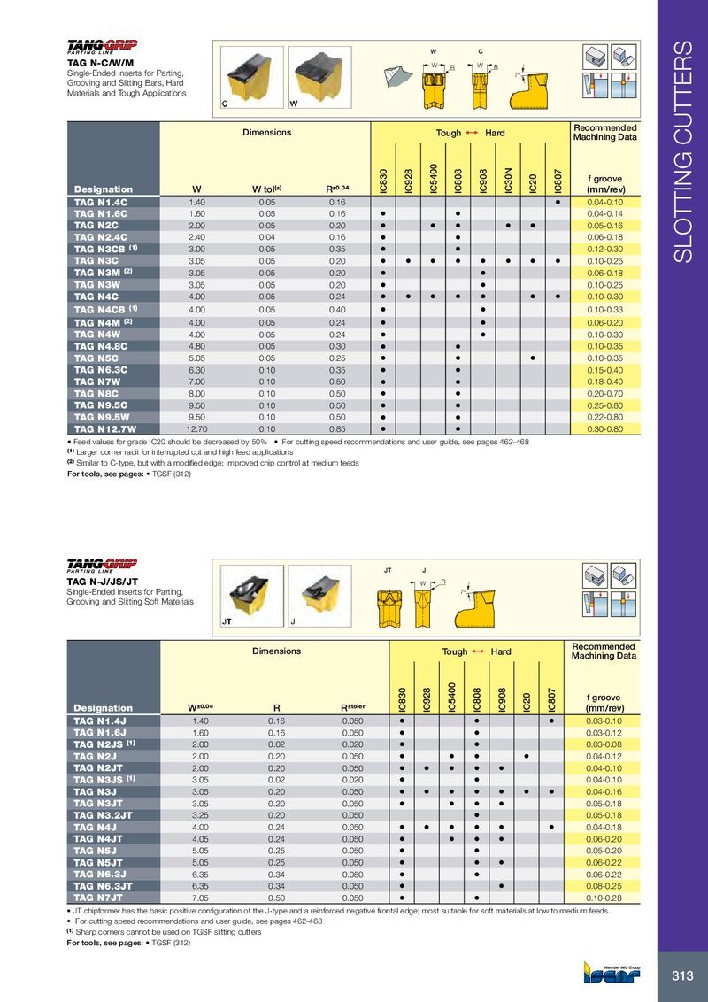 W C TAG N-C/W/M W R W R Single-Ended Inserts for Parting, 7º Grooving and Slitting Bars, Hard Materials and Tough Applications Recommended Dimensions Tough 1 Hard Machining Data f groove Designation W W tol (±) R ±0.04 IC830 IC928 IC5400 IC808 IC908 IC30N IC20 IC807 (mm/rev) TAG N1.4C 1.40 0.05 0.16 • 0.04-0.10 TAG N1.6C 1.60 0.05 0.16 • • 0.04-0.14 TAG N2C 2.00 0.05 0.20 • • • • • 0.05-0.16 TAG N2.4C 2.40 0.04 0.16 • • 0.06-0.18 TAG N3CB (1) 3.00 0.05 0.35 • • 0.12-0.30 TAG N3C 3.05 0.05 0.20 • • • • • • • • 0.10-0.25 SLOTTING CUTTERS TAG N3M (2) 3.05 0.05 0.20 • • 0.06-0.18 TAG N3W 3.05 0.05 0.20 • • 0.10-0.25 TAG N4C 4.00 0.05 0.24 • • • • • • • 0.10-0.30 TAG N4CB (1) 4.00 0.05 0.40 • • 0.10-0.33 TAG N4M (2) 4.00 0.05 0.24 • • 0.06-0.20 TAG N4W 4.00 0.05 0.24 • • 0.10-0.30 TAG N4.8C 4.80 0.05 0.30 • • 0.10-0.35 TAG N5C 5.05 0.05 0.25 • • • 0.10-0.35 TAG N6.3C 6.30 0.10 0.35 • • 0.15-0.40 TAG N7W 7.00 0.10 0.50 • • 0.18-0.40 TAG N8C 8.00 0.10 0.50 • • 0.20-0.70 TAG N9.5C 9.50 0.10 0.50 • • 0.25-0.80 TAG N9.5W 9.50 0.10 0.50 • • 0.22-0.80 TAG N12.7W 12.70 0.10 0.85 • • 0.30-0.80 • Feed values for grade IC20 should be decreased by 50% • For cutting speed recommendations and user guide, see pages 462-468 (1) Larger corner radii for interrupted cut and high feed applications (2) Similar to C-type, but with a modified edge; Improved chip control at medium feeds For tools, see pages: • TGSF (312) JT J TAG N-J/JS/JT W R Single-Ended Inserts for Parting, 7º Grooving and Slitting Soft Materials Recommended Dimensions Tough 1 Hard Machining Data f groove Designation W ±0.04 R R ±toler IC830 IC928 IC5400 IC808 IC908 IC20 IC807 (mm/rev) TAG N1.4J 1.40 0.16 0.050 • • • 0.03-0.10 TAG N1.6J 1.60 0.16 0.050 • • 0.03-0.12 TAG N2JS (1) 2.00 0.02 0.020 • • 0.03-0.08 TAG N2J 2.00 0.20 0.050 • • • • 0.04-0.12 TAG N2JT 2.00 0.20 0.050 • • • • • 0.04-0.10 TAG N3JS (1) 3.05 0.02 0.020 • • 0.04-0.10 TAG N3J 3.05 0.20 0.050 • • • • • • • 0.04-0.16 TAG N3JT 3.05 0.20 0.050 • • • • 0.05-0.18 TAG N3.2JT 3.25 0.20 0.050 • 0.05-0.18 TAG N4J 4.00 0.24 0.050 • • • • • • 0.04-0.18 TAG N4JT 4.05 0.24 0.050 • • • • 0.06-0.20 TAG N5J 5.05 0.25 0.050 • • 0.05-0.20 TAG N5JT 5.05 0.25 0.050 • • • 0.06-0.22 TAG N6.3J 6.35 0.34 0.050 • • 0.06-0.22 TAG N6.3JT 6.35 0.34 0.050 • • 0.08-0.25 TAG N7JT 7.05 0.50 0.050 • • 0.10-0.28 • JT chipformer has the basic positive configuration of the J-type and a reinforced negative frontal edge; most suitable for soft materials at low to medium feeds. • For cutting speed recommendations and user guide, see pages 462-468 (1) Sharp corners cannot be used on TGSF slitting cutters For tools, see pages: • TGSF (312) 313