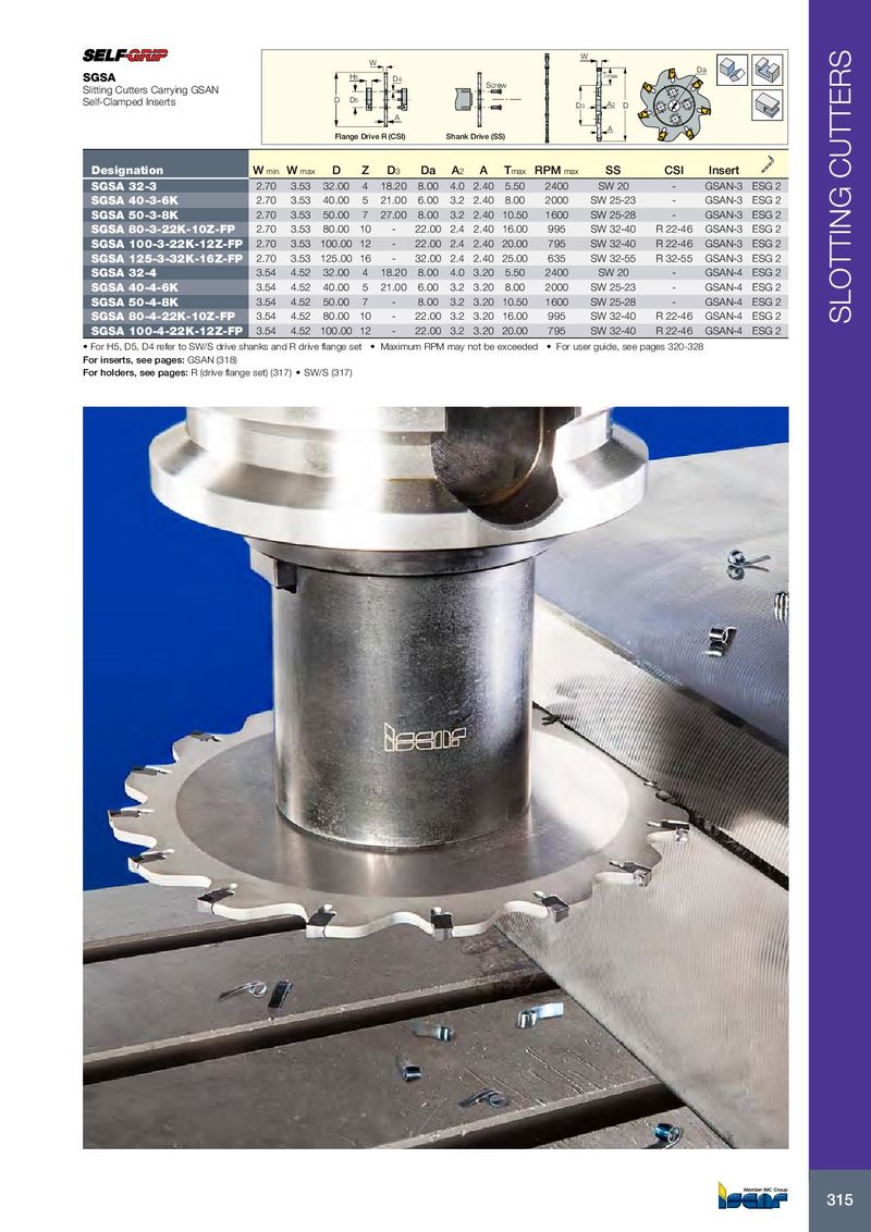 W W Da SGSA H 5 D 4 Tmax Screw Slitting Cutters Carrying GSAN Self-Clamped Inserts D D 5 D 3 A 2 D A A Flange Drive R (CSI) Shank Drive (SS) Designation W min W max D Z D 3 Da A 2 A T max RPM max SS CSI Insert SGSA 32-3 2.70 3.53 32.00 4 18.20 8.00 4.0 2.40 5.50 2400 SW 20 - GSAN-3 ESG 2 SGSA 40-3-6K 2.70 3.53 40.00 5 21.00 6.00 3.2 2.40 8.00 2000 SW 25-23 - GSAN-3 ESG 2 SGSA 50-3-8K 2.70 3.53 50.00 7 27.00 8.00 3.2 2.40 10.50 1600 SW 25-28 - GSAN-3 ESG 2 SGSA 80-3-22K-10Z-FP 2.70 3.53 80.00 10 - 22.00 2.4 2.40 16.00 995 SW 32-40 R 22-46 GSAN-3 ESG 2 SGSA 100-3-22K-12Z-FP 2.70 3.53 100.00 12 - 22.00 2.4 2.40 20.00 795 SW 32-40 R 22-46 GSAN-3 ESG 2 SGSA 125-3-32K-16Z-FP 2.70 3.53 125.00 16 - 32.00 2.4 2.40 25.00 635 SW 32-55 R 32-55 GSAN-3 ESG 2 SGSA 32-4 3.54 4.52 32.00 4 18.20 8.00 4.0 3.20 5.50 2400 SW 20 - GSAN-4 ESG 2 SGSA 40-4-6K 3.54 4.52 40.00 5 21.00 6.00 3.2 3.20 8.00 2000 SW 25-23 - GSAN-4 ESG 2 SGSA 50-4-8K 3.54 4.52 50.00 7 - 8.00 3.2 3.20 10.50 1600 SW 25-28 - GSAN-4 ESG 2 SGSA 80-4-22K-10Z-FP 3.54 4.52 80.00 10 - 22.00 3.2 3.20 16.00 995 SW 32-40 R 22-46 GSAN-4 ESG 2 SLOTTING CUTTERS SGSA 100-4-22K-12Z-FP 3.54 4.52 100.00 12 - 22.00 3.2 3.20 20.00 795 SW 32-40 R 22-46 GSAN-4 ESG 2 • For H5, D5, D4 refer to SW/S drive shanks and R drive flange set • Maximum RPM may not be exceeded • For user guide, see pages 320-328 For inserts, see pages: GSAN (318) For holders, see pages: R (drive flange set) (317) • SW/S (317) 315