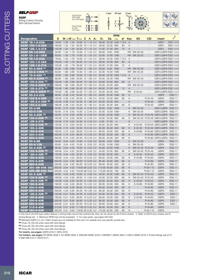 D 3 A type KR type K type Drive Shank W Da SGSF SW/S (SS) a° for K+KR types Slitting Cutters Carrying Self-Clamped Inserts D 3 A 2 D Drive Flange R (CSI) D 3 A Tmax for K type RPM Designation D W min W max T max Z A A 2 D 3 Da max a° Key SS CSI Insert SGSF 76-1.4-22A 76.00 1.34 1.34 18.00 8 1.10 2.4 39.00 22.00 1050 112.5 A - - GSFU ESG 1.4-2 SGSF 100-1.4-22A 100.00 1.34 1.34 25.00 10 1.10 2.4 49.00 22.00 800 90 A - - GSFU ESG 1.4-2 SGSF 125-1.4-27A 125.00 1.34 1.34 25.00 12 1.10 2.4 74.00 27.00 640 75 A - - GSFU ESG 1.4-2 SGSF 50-1.6-8KR 50.00 1.50 1.79 10.00 5 1.24 2.4 28.00 8.00 1600 KR SW 25-28 - GSFU,GSFN ESG 1.4-2 SGSF 63-1.6-10KR 63.00 1.50 1.79 14.00 6 1.24 2.4 32.00 10.00 1260 KR SW 25-32 - GSFU,GSFN ESG 1.4-2 SGSF 76-1.6-22A 76.00 1.50 1.79 18.00 8 1.24 2.4 39.00 22.00 1050 112.5 A - - GSFU,GSFN ESG 1.4-2 SGSF 100-1.6-22A 100.00 1.50 1.79 30.00 10 1.24 2.4 39.00 22.00 800 90 A - - GSFU,GSFN ESG 1.4-2 SGSF 125-1.6-27A 125.00 1.50 1.79 29.00 12 1.24 2.4 60.00 27.00 640 75 A - - GSFU,GSFN ESG 1.4-2 SGSF 50-2-8KR (1) 50.00 1.80 2.69 10.00 5 1.60 2.4 28.00 8.00 1600 KR SW 25-28 - GSFU,GSFN ESG 1.4-2 SLOTTING CUTTERS SGSF 63-2-10KR (1) 63.00 1.80 2.69 15.00 6 1.60 2.4 32.00 10.00 1260 KR SW 25-32 - GSFU,GSFN ESG 1.4-2 SGSF 76-2-22A (1) 76.00 1.80 2.69 18.00 8 1.60 2.4 39.00 22.00 1050 112.5 A - - GSFU,GSFN ESG 1.4-2 SGSF 80-2-22KR (1) 80.00 1.80 2.69 20.00 8 1.60 2.4 40.00 22.00 1000 KR SW 32-40 - GSFU,GSFN ESG 1.4-2 SGSF 100-2-22A (1) 100.00 1.80 2.69 30.00 10 1.60 2.4 39.00 22.00 800 90 A - - GSFU,GSFN ESG 1.4-2 SGSF 100-2-22KR (1) 100.00 1.80 2.69 29.00 10 1.60 2.4 40.00 22.00 800 KR SW 32-40 - GSFU,GSFN ESG 1.4-2 SGSF 125-2-27A (1) 125.00 1.80 2.69 32.00 12 1.60 2.4 60.00 27.00 640 75 A - - GSFU,GSFN ESG 1.4-2 SGSF 125-2-32KR (1) 125.00 1.80 2.69 34.00 12 1.60 2.4 55.00 32.00 640 KR S 32-55 - GSFU,GSFN ESG 1.4-2 SGSF 80-2.4-22A 80.00 2.38 2.42 20.00 6 1.90 2.4 39.00 22.00 1000 90 A - - GSFN ESG 11 SGSF 100-2.4-22K 100.00 2.38 2.42 26.00 6 1.90 2.4 46.00 22.00 800 90 K - R 22-46 GSFN ESG 11 SGSF 125-2.4-32K (2) 125.00 2.38 2.42 34.00 8 1.90 2.4 55.00 32.00 640 K - R 32-55 GSFN ESG 11 SGSF 160-2.4-32K 160.00 2.38 2.42 52.00 10 1.90 2.4 55.00 32.00 500 90 K - R 32-55 GSFN ESG 11 SGSF 50-3-8K 50.00 2.70 3.53 10.00 4 2.40 2.4 28.00 8.00 1600 K SW 25-28 - GSFU,GSFN ESG 11 SGSF 63-3-10K 63.00 2.70 3.53 15.00 5 2.40 2.4 32.00 10.00 1260 K SW 25-32 - GSFU,GSFN ESG 11 SGSF 80-3-22K (3) 80.00 2.70 3.53 19.00 6 2.40 2.4 40.00 22.00 1000 K SW 32-40 R 22-46 GSFU,GSFN ESG 11 SGSF 100-3-22K (4) 100.00 2.70 3.53 29.00 6 2.40 2.4 40.00 22.00 800 90 K SW 32-40 R 22-46 GSFU,GSFN ESG 11 SGSF 125-3-27K 125.00 2.70 3.53 34.00 8 2.40 2.4 0.00 27.00 0 K - - GSFU,GSFN ESG 11 SGSF 125-3-32K (2) 125.00 2.70 3.53 34.00 8 2.40 2.4 55.00 32.00 640 K S 32-55 R 32-55 GSFU,GSFN ESG 11 SGSF 160-3-32K 160.00 2.70 3.53 52.00 10 2.40 2.4 55.00 32.00 500 90 K S 32-55 R 32-55 GSFU,GSFN ESG 11 SGSF 160-3-40K 160.00 2.70 3.53 39.00 10 2.40 2.4 80.00 40.00 500 90 K S 40-80 R 40-80 GSFU,GSFN ESG 11 SGSF 200-3-40K 200.00 2.70 3.54 59.00 14 2.40 2.4 80.00 40.00 400 90 K - R 40-80 GSFU,GSFN ESG 11 SGSF 250-3-40K 250.00 2.70 3.53 84.00 18 2.40 2.4 80.00 40.00 320 90 K - R 40-80 GSFU,GSFN ESG 11 SGSF 50-4-8K 50.00 3.54 4.52 10.00 4 3.20 3.2 28.00 8.00 1600 K SW 25-28 - GSFN ESG 11 SGSF 63-4-10K 63.00 3.54 4.52 15.00 5 3.20 3.2 32.00 10.00 1260 K SW 25-32 - GSFN ESG 11 SGSF 80-4-22K (3) 80.00 3.54 4.52 19.00 6 3.20 3.2 40.00 22.00 1000 K SW 32-40 R 22-46 GSFN ESG 11 SGSF 100-4-22K (4) 100.00 3.54 4.52 26.00 6 3.20 3.2 40.00 22.00 800 90 K SW 32-40 R 22-46 GSFN ESG 11 SGSF 125-4-32K (2) 125.00 3.54 4.52 34.00 8 3.20 3.2 55.00 32.00 640 K S 32-55 R 32-55 GSFN ESG 11 SGSF 160-4-40K 160.00 3.54 4.52 39.00 10 3.20 3.2 80.00 40.00 500 90 K S 40-80 R 40-80 GSFN ESG 11 SGSF 200-4-40K 200.00 3.54 4.52 59.00 14 3.20 3.2 80.00 40.00 400 90 K - R 40-80 GSFN ESG 11 SGSF 250-4-40K 250.00 3.54 4.52 84.00 18 3.20 3.2 80.00 40.00 320 90 K - R 40-80 GSFN ESG 11 SGSF 350-4M-50K-38Z 350.00 3.54 4.52 119.00 38 3.20 3.2 110.00 50.00 230 90 K - R 50-110 GSFN ESG 11 SGSF 425-4M-50K-38Z 425.00 3.54 4.52 140.00 38 3.20 3.2 110.00 50.00 190 90 K - R 50-110 GSFN ESG 11 SGSF 80-5-22K (3) 80.00 4.53 5.50 19.00 6 4.00 4.0 40.00 22.00 1000 90 K SW 32-40 R 22-46 GSFN ESG 11 SGSF 100-5-22K (4) 100.00 4.53 5.50 29.00 6 4.00 5.0 40.00 22.00 800 90 K SW 32-40 R 22-46 GSFN ESG 11 SGSF 125-5-32K (2) 125.00 4.53 5.50 34.00 8 4.00 4.0 55.00 32.00 640 90 K S 32-55 R 32-55 GSFN ESG 11 SGSF 160-5-40K 160.00 4.53 5.50 39.00 10 4.00 4.0 80.00 40.00 500 90 K S 40-80 R 40-80 GSFN ESG 11 SGSF 200-5-40K 200.00 4.53 5.50 59.00 14 4.00 4.0 80.00 40.00 400 90 K - R 40-80 GSFN ESG 11 SGSF 250-5-40K 250.00 4.53 5.50 84.00 18 4.00 4.0 80.00 40.00 320 90 K - R 40-80 GSFN ESG 11 SGSF 125-6-32K (2) 125.00 5.51 6.50 34.00 8 5.20 5.2 55.00 32.00 640 90 K S 32-55 R 32-55 GSFN ESG 1 SGSF 160-6-40K 160.00 5.51 6.50 39.00 10 5.20 5.2 80.00 40.00 500 90 K S 40-80 R 40-80 GSFN ESG 1 SGSF 200-6-40K 200.00 5.51 6.50 59.00 14 5.20 5.2 80.00 40.00 400 90 K - R 40-80 GSFN ESG 1 SGSF 250-6-40K 250.00 5.51 6.50 84.00 18 5.20 5.2 80.00 40.00 320 90 K - R 40-80 GSFN ESG 1 SGSF 315-6-40K 315.00 5.51 6.50 117.00 22 5.20 5.2 80.00 40.00 250 90 K - R 40-80 GSFN SGSF 350-6-50K 350.00 5.51 6.50 119.00 26 5.20 5.2 110.00 50.00 230 90 K - R 50-110 GSFN • Only the K and KR type cutters feature 4 driving holes around the central hole; they can be driven by the R drive shanks • Refer to SW/S drive shanks and R driving flange set • Maximum RPM may not be exceeded • For user guide, see pages 320-328 (1) Standard GSFN 2.4 mm (.095") inserts are not suitable for this tool. For suitable tool, see specific pocket size (2) Tmax=16, D3=46 when used with drive flange (3) Tmax=26, D3=46 when used with drive flange (4) Tmax=26, D3=46 when used with drive flange. For inserts, see pages: GSFN (319) • GSFU (319) For holders, see pages: BT-SEMC (908) • C#-SEMC (890) • DIN2080-SEMC (916) • DIN69871-SEMC (856) 