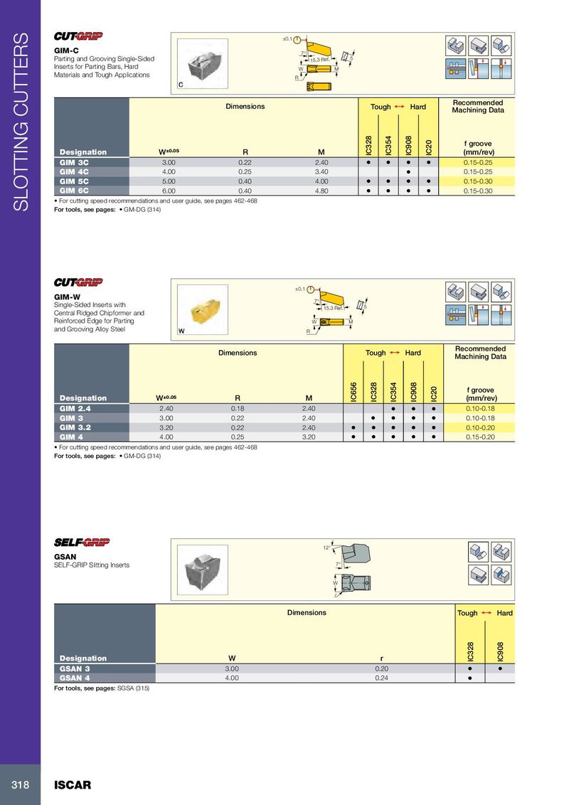 ±0.1 GIM-C 7° Parting and Grooving Single-Sided 15.3 Ref. 5 Inserts for Parting Bars, Hard W M Materials and Tough Applications R Recommended Dimensions Tough 1 Hard Machining Data f groove Designation W ±0.05 R M IC328 IC354 IC908 IC20 (mm/rev) GIM 3C 3.00 0.22 2.40 • • • • 0.15-0.25 GIM 4C 4.00 0.25 3.40 • 0.15-0.25 GIM 5C 5.00 0.40 4.00 • • • • 0.15-0.30 GIM 6C 6.00 0.40 4.80 • • • • 0.15-0.30 • For cutting speed recommendations and user guide, see pages 462-468 SLOTTING CUTTERS For tools, see pages: • GM-DG (314) ±0.1 GIM-W 7° Single-Sided Inserts with 15.3 Ref. 5 Central Ridged Chipformer and Reinforced Edge for Parting W M and Grooving Alloy Steel R Recommended Dimensions Tough 1 Hard Machining Data f groove Designation W ±0.05 R M IC656 IC328 IC354 IC908 IC20 (mm/rev) GIM 2.4 2.40 0.18 2.40 • • • 0.10-0.18 GIM 3 3.00 0.22 2.40 • • • • 0.10-0.18 GIM 3.2 3.20 0.22 2.40 • • • • • 0.10-0.20 GIM 4 4.00 0.25 3.20 • • • • • 0.15-0.20 • For cutting speed recommendations and user guide, see pages 462-468 For tools, see pages: • GM-DG (314) 12° GSAN SELF-GRIP Slitting Inserts 7° W r Dimensions Tough 1 Hard Designation W r IC328 IC908 GSAN 3 3.00 0.20 • • GSAN 4 4.00 0.24 • For tools, see pages: SGSA (315) 318 ISCAR