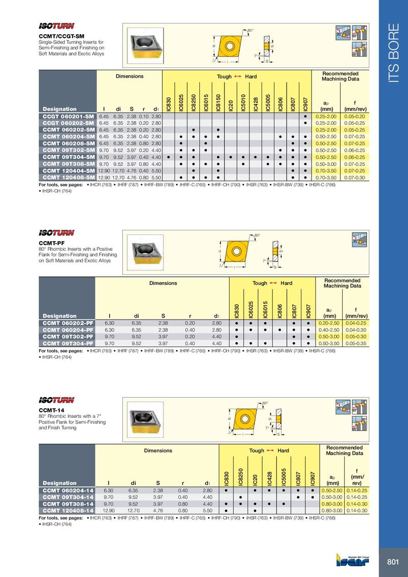 97° 80° 95º CCMT/CCGT-SM 93° Single-Sided Turning Inserts for di d 1 95° Semi-Finishing and Finishing on Soft Materials and Exotic Alloys 7° 95° r l S Recommended Dimensions Tough 1 Hard Machining Data ITS BORE a p f Designation l di S r d 1 IC830 IC6025 IC8250 IC6015 IC8150 IC20 IC5010 IC428 IC5005 IC806 IC807 IC907 (mm) (mm/rev) CCGT 060201-SM 6.45 6.35 2.38 0.10 2.80 • 0.25-2.00 0.05-0.20 CCGT 060202-SM 6.45 6.35 2.38 0.20 2.80 • 0.25-2.00 0.05-0.25 CCMT 060202-SM 6.45 6.35 2.38 0.20 2.80 • • 0.25-2.00 0.05-0.25 CCMT 060204-SM 6.45 6.35 2.38 0.40 2.80 • • • • • • • 0.50-2.50 0.07-0.25 CCMT 060208-SM 6.45 6.35 2.38 0.80 2.80 • • • • 0.50-2.50 0.07-0.25 CCMT 09T302-SM 9.70 9.52 3.97 0.20 4.40 • • • • • • 0.50-2.50 0.06-0.25 CCMT 09T304-SM 9.70 9.52 3.97 0.40 4.40 • • • • • • • • • • • 0.50-2.50 0.06-0.25 CCMT 09T308-SM 9.70 9.52 3.97 0.80 4.40 • • • • • • • • • 0.50-3.00 0.07-0.25 CCMT 120404-SM 12.90 12.70 4.76 0.40 5.50 • • • • 0.70-3.50 0.07-0.25 CCMT 120408-SM 12.90 12.70 4.76 0.80 5.50 • • • • • • 0.70-3.50 0.07-0.30 For tools, see pages: • IHCR (763) • IHRF (787) • IHRF-BW (789) • IHRF-C (765) • IHRF-CH (790) • IHSR (763) • IHSR-BW (739) • IHSR-C (766) • IHSR-CH (764) 80° 95º CCMT-PF 80° Rhombic Inserts with a Positive d d 1 Flank for Semi-Finishing and Finishing on Soft Materials and Exotic Alloys 7° r l S Recommended Dimensions Tough 1 Hard Machining Data a p f Designation l di S r d 1 IC830 IC6025 IC6015 IC806 IC807 IC907 (mm) (mm/rev) CCMT 060202-PF 6.30 6.35 2.38 0.20 2.80 • • • • • 0.20-2.50 0.04-0.25 CCMT 060204-PF 6.30 6.35 2.38 0.40 2.80 • • • • • • 0.40-2.50 0.04-0.30 CCMT 09T302-PF 9.70 9.52 3.97 0.20 4.40 • • • 0.50-3.00 0.05-0.30 CCMT 09T304-PF 9.70 9.52 3.97 0.40 4.40 • • • • • 0.50-3.50 0.05-0.35 For tools, see pages: • IHCR (763) • IHRF (787) • IHRF-BW (789) • IHRF-C (765) • IHRF-CH (790) • IHSR (763) • IHSR-BW (739) • IHSR-C (766) • IHSR-CH (764) 80° 97° 95º CCMT-14 93° 80° Rhombic Inserts with a 7° di d 1 95° Positive Flank for Semi-Finishing and Finish Turning 7° 95° r l S Recommended Dimensions Tough 1 Hard Machining Data f a p (mm/ Designation l di S r d 1 IC830 IC8250 IC20 IC428 IC5005 IC807 IC907 (mm) rev) CCMT 060204-14 6.30 6.35 2.38 0.40 2.80 • • • • • • 0.50-2.50 0.14-0.25 CCMT 09T304-14 9.70 9.52 3.97 0.40 4.40 • • • 0.50-3.00 0.14-0.25 CCMT 09T308-14 9.70 9.52 3.97 0.80 4.40 • • • • • 0.80-3.00 0.14-0.30 CCMT 120408-14 12.90 12.70 4.76 0.80 5.50 • • 0.80-3.00 0.14-0.30 For tools, see pages: • IHCR (763) • IHRF (787) • IHRF-BW (789) • IHRF-C (765) • IHRF-CH (790) • IHSR (763) • IHSR-BW (739) • IHSR-C (766) • IHSR-CH (764) 801