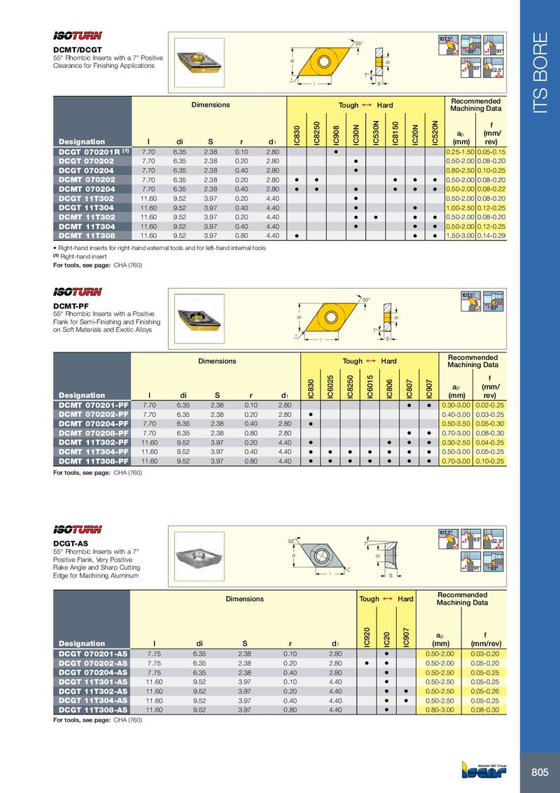 107.5° 55° DCMT/DCGT 93º 91° 55° Rhombic Inserts with a 7° Positive di d 1 Clearance for Finishing Applications 93° 62.5° 7° r l S Recommended Dimensions Tough 1 Hard Machining Data ITS BORE f a p (mm/ Designation l di S r d 1 IC830 IC8250 IC908 IC30N IC530N IC8150 IC20N IC520N (mm) rev) DCGT 070201R (1) 7.70 6.35 2.38 0.10 2.80 • 0.25-1.50 0.05-0.15 DCGT 070202 7.70 6.35 2.38 0.20 2.80 • 0.50-2.00 0.08-0.20 DCGT 070204 7.70 6.35 2.38 0.40 2.80 • 0.80-2.50 0.10-0.25 DCMT 070202 7.70 6.35 2.38 0.20 2.80 • • • • • 0.50-2.00 0.08-0.20 DCMT 070204 7.70 6.35 2.38 0.40 2.80 • • • • • • 0.50-2.00 0.08-0.22 DCGT 11T302 11.60 9.52 3.97 0.20 4.40 • 0.50-2.00 0.08-0.20 DCGT 11T304 11.60 9.52 3.97 0.40 4.40 • • 1.00-2.50 0.12-0.25 DCMT 11T302 11.60 9.52 3.97 0.20 4.40 • • • • 0.50-2.00 0.08-0.20 DCMT 11T304 11.60 9.52 3.97 0.40 4.40 • • • 0.50-2.00 0.12-0.25 DCMT 11T308 11.60 9.52 3.97 0.80 4.40 • • • 1.50-3.00 0.14-0.29 • Right-hand inserts for right-hand external tools and for left-hand internal tools (1) Right-hand insert For tools, see page: CHA (760) 107.5° 55° DCMT-PF 93º 55° Rhombic Inserts with a Positive di d 1 Flank for Semi-Finishing and Finishing on Soft Materials and Exotic Alloys 7° r l S Recommended Dimensions Tough 1 Hard Machining Data f a p (mm/ Designation l di S r d 1 IC830 IC6025 IC8250 IC6015 IC806 IC807 IC907 (mm) rev) DCMT 070201-PF 7.70 6.35 2.38 0.10 2.80 • • 0.30-3.00 0.02-0.25 DCMT 070202-PF 7.70 6.35 2.38 0.20 2.80 • 0.40-3.00 0.03-0.25 DCMT 070204-PF 7.70 6.35 2.38 0.40 2.80 • 0.50-3.50 0.05-0.30 DCMT 070208-PF 7.70 6.35 2.38 0.80 2.80 • • 0.70-3.00 0.08-0.30 DCMT 11T302-PF 11.60 9.52 3.97 0.20 4.40 • • • • 0.30-2.50 0.04-0.25 DCMT 11T304-PF 11.60 9.52 3.97 0.40 4.40 • • • • • • • 0.50-3.00 0.05-0.25 DCMT 11T308-PF 11.60 9.52 3.97 0.80 4.40 • • • • • • • 0.70-3.00 0.10-0.25 For tools, see page: CHA (760) 107.5° 55˚ 93° 7˚ 62.5° DCGT-AS 55° Rhombic Inserts with a 7° d d 1 Positive Flank, Very Positive Rake Angle and Sharp Cutting r 91° 93º Edge for Machining Aluminum l S Recommended Dimensions Tough 1 Hard Machining Data a p f Designation l di S r d 1 IC920 IC20 IC907 (mm) (mm/rev) DCGT 070201-AS 7.75 6.35 2.38 0.10 2.80 • 0.50-2.00 0.03-0.20 DCGT 070202-AS 7.75 6.35 2.38 0.20 2.80 • • 0.50-2.00 0.05-0.20 DCGT 070204-AS 7.75 6.35 2.38 0.40 2.80 • 0.50-2.50 0.05-0.25 DCGT 11T301-AS 11.60 9.52 3.97 0.10 4.40 • 0.50-2.50 0.05-0.25 DCGT 11T302-AS 11.60 9.52 3.97 0.20 4.40 • • 0.50-2.50 0.05-0.26 DCGT 11T304-AS 11.60 9.52 3.97 0.40 4.40 • • 0.50-2.50 0.05-0.25 DCGT 11T308-AS 11.60 9.52 3.97 0.80 4.40 • 0.80-3.00 0.08-0.30 For tools, see page: CHA (760) 805