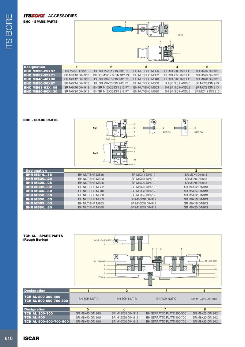 ACCESSORIES BHC - SPARE PARTS 4 0 1 2 4 3 BHC 5 1 2 ITS BORE 3 Designation 1 2 3 4 5 BHC MB25-25X57 SR M4X8 DIN 913 BH SR M4X11 DIN 912 PT BH NUT-BHC MB25 BH SR 2.0 HANDLE SR M4X5 DIN 913 BHC MB32-32X71 SR M5X10 DIN 913 BH SR M5X12.5 DIN 912 PT BH NUT-BHC MB32 BH SR 2.5 HANDLE SR M5X5 DIN 913 BHC MB40-40X90 SR M6X12 DIN 913 BH SR M6X16 DIN 912 PT BH NUT-BHC MB40 BH SR 3.0 HANDLE SR M6X6 DIN 913 BHC MB50-50X87 SR M6X14 DIN 913 BH SR M8X20 DIN 912 PT BH NUT-BHC MB50 BH SR 3.0 HANDLE SR M6X8 DIN 913 BHC MB63-63X109 SR M6X16 DIN 913 BH SR M10X26 DIN 912 PT BH NUT-BHC MB63 BH SR 3.0 HANDLE SR M6X8 DIN 913 BHC MB80-80X130 SR M6X20 DIN 913 BH SR M12X30 DIN 912 PT BH NUT-BHC MB80 BH SR 3.0 HANDLE SR M6X12 DIN 913 BHR - SPARE PARTS 3 fig.1 2 2 2 1 IHFR CH IHRF BW S.... BHR 3 2 fig.2 IH 1 Designation 1 2 3 BHR MB16…16 BH NUT BHR MB16 SR M3X14 DIN912 SR M3X4 DIN913 BHR MB20…20 BH NUT BHR MB20 SR M4X15 DIN912 SR M3X5 DIN913 BHR MB25…25 BH NUT BHR MB25 SR M4X20 DIN912 SR M3X8 DIN913 BHR MB32…32 BH NUT BHR MB32 SR M5X25 DIN912 SR M4X12 DIN913 BHR MB40…50 BH NUT BHR MB40 SR M6X30 DIN912 SR M5X14 DIN913 BHR MB50…50 BH NUT BHR MB50 SR M8X35 DIN912 SR M5X12 DIN913 BHR MB50…63 BH NUT BHR MB63 SR M10X40 DIN912 SR M6X16 DIN913 BHR MB63…63 BH NUT BHR MB63 SR M10X40 DIN912 SR M6X16 DIN913 BHR MB80…80 BH NUT BHR MB80 SR M12X45 DIN912 SR M8X25 DIN913 TCH AL - SPARE PARTS (Rough Boring) IHSR 161-800 BW 4 5 4 3 4 IH...160-800 IH...160-800 4 7 1 8 6 1 TCH AL 2 Designation 1 2 3 4 TCH AL 200-300-400 BH TCH NUT A BH TCH NUT B BH TCH NUT C SR M12X40 DIN 912 TCH AL 500-600-700-800 Designation 5 6 7 8 TCH AL 200-300 SR M8X40 DIN 915 SR M12X35 DIN 912 BH SERRATED PLATE 200-300 SR M8X25 DIN 912 TCH AL 400 SR M8X40 DIN 915 SR M12X35 DIN 912 BH SERRATED PLATE 400-700 SR M8X20 DIN 912 TCH AL 500-600-700-800 SR M8X40 DIN 915 SR M16X50 DIN 912 BH SERRATED PLATE 400-700 SR M8X25 DIN 912 816 ISCAR