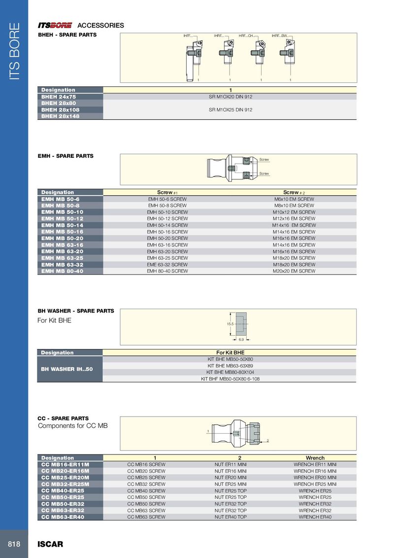ACCESSORIES BHEH - SPARE PARTS IHFF... IHRF... HRF...CH.. IHRF...BW.. ITS BORE 1 1 1 1 Designation 1 BHEH 24x75 SR M1OX20 DIN 912 BHEH 28x80 BHEH 28x108 SR M1OX25 DIN 912 BHEH 28x148 EMH - SPARE PARTS Screw Screw Designation Screw #1 Screw # 2 EMH MB 50-6 EMH 50-6 SCREW M6x10 EM SCREW EMH MB 50-8 EMH 50-8 SCREW M8x10 EM SCREW EMH MB 50-10 EMH 50-10 SCREW M10x12 EM SCREW EMH MB 50-12 EMH 50-12 SCREW M12x16 EM SCREW EMH MB 50-14 EMH 50-14 SCREW M14x16 EM SCREW EMH MB 50-16 EMH 50-16 SCREW M14x16 EM SCREW EMH MB 50-20 EMH 50-20 SCREW M16x16 EM SCREW EMH MB 63-16 EMH 63-16 SCREW M14x16 EM SCREW EMH MB 63-20 EMH 63-20 SCREW M16x16 EM SCREW EMH MB 63-25 EMH 63-25 SCREW M18x20 EM SCREW EMH MB 63-32 EME 63-32 SCREW M18x20 EM SCREW EMH MB 80-40 EMH 80-40 SCREW M20x20 EM SCREW BH WASHER - SPARE PARTS For Kit BHE 15.5 6.9 Designation For Kit BHE KIT BHE MB50-50X80 KIT BHE MB63-63X89 BH WASHER IH..50 KIT BHE MB80-80X104 KIT BHF MB50-50X80 6-108 CC - SPARE PARTS Components for CC MB 1 2 Designation 1 2 Wrench CC MB16-ER11M CC MB16 SCREW NUT ER11 MINI WRENCH ER11 MINI CC MB20-ER16M CC MB20 SCREW NUT ER16 MINI WRENCH ER16 MINI CC MB25-ER20M CC MB25 SCREW NUT ER20 MINI WRENCH ER20 MINI CC MB32-ER25M CC MB32 SCREW NUT ER25 MINI WRENCH ER25 MINI CC MB40-ER25 CC MB40 SCREW NUT ER25 TOP WRENCH ER25 CC MB50-ER25 CC MB50 SCREW NUT ER25 TOP WRENCH ER25 CC MB50-ER32 CC MB50 SCREW NUT ER32 TOP WRENCH ER32 CC MB63-ER32 CC MB63 SCREW NUT ER32 TOP WRENCH ER32 CC MB63-ER40 CC MB63 SCREW NUT ER40 TOP WRENCH ER40 818 ISCAR