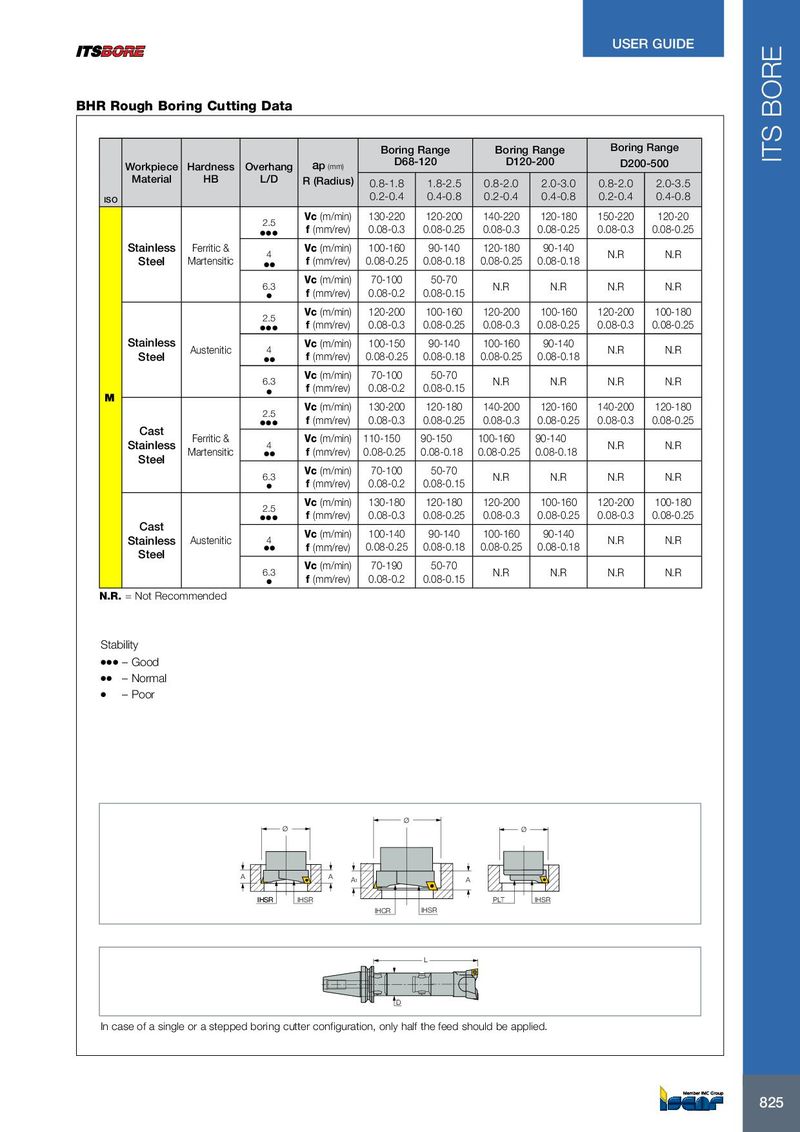 USER GUIDE BHR Rough Boring Cutting Data Boring Range Boring Range Boring Range ITS BORE Workpiece Hardness Overhang ap (mm) D68-120 D120-200 D200-500 Material HB L/D R (Radius) 0.8-1.8 1.8-2.5 0.8-2.0 2.0-3.0 0.8-2.0 2.0-3.5 ISO 0.2-0.4 0.4-0.8 0.2-0.4 0.4-0.8 0.2-0.4 0.4-0.8 Vc (m/min) 130-220 120-200 140-220 120-180 150-220 120-20 2.5 ● ● ● f (mm/rev) 0.08-0.3 0.08-0.25 0.08-0.3 0.08-0.25 0.08-0.3 0.08-0.25 Stainless Ferritic & Vc (m/min) 100-160 90-140 120-180 90-140 4 N.R N.R Steel Martensitic ● ● f (mm/rev) 0.08-0.25 0.08-0.18 0.08-0.25 0.08-0.18 Vc (m/min) 70-100 50-70 6.3 N.R N.R N.R N.R ● f (mm/rev) 0.08-0.2 0.08-0.15 Vc (m/min) 120-200 100-160 120-200 100-160 120-200 100-180 2.5 ● ● ● f (mm/rev) 0.08-0.3 0.08-0.25 0.08-0.3 0.08-0.25 0.08-0.3 0.08-0.25 Stainless Vc (m/min) 100-150 90-140 100-160 90-140 Austenitic 4 N.R N.R Steel ● ● f (mm/rev) 0.08-0.25 0.08-0.18 0.08-0.25 0.08-0.18 Vc (m/min) 70-100 50-70 6.3 N.R N.R N.R N.R ● f (mm/rev) 0.08-0.2 0.08-0.15 M Vc (m/min) 130-200 120-180 140-200 120-160 140-200 120-180 2.5 ● ● ● f (mm/rev) 0.08-0.3 0.08-0.25 0.08-0.3 0.08-0.25 0.08-0.3 0.08-0.25 Cast Ferritic & Vc (m/min) 110-150 90-150 100-160 90-140 Stainless 4 N.R N.R Martensitic ● ● f (mm/rev) 0.08-0.25 0.08-0.18 0.08-0.25 0.08-0.18 Steel Vc (m/min) 70-100 50-70 6.3 N.R N.R N.R N.R ● f (mm/rev) 0.08-0.2 0.08-0.15 Vc (m/min) 130-180 120-180 120-200 100-160 120-200 100-180 2.5 ● ● ● f (mm/rev) 0.08-0.3 0.08-0.25 0.08-0.3 0.08-0.25 0.08-0.3 0.08-0.25 Cast Vc (m/min) 100-140 90-140 100-160 90-140 Stainless Austenitic 4 N.R N.R ● ● f (mm/rev) 0.08-0.25 0.08-0.18 0.08-0.25 0.08-0.18 Steel Vc (m/min) 70-190 50-70 6.3 N.R N.R N.R N.R ● f (mm/rev) 0.08-0.2 0.08-0.15 N.R. = Not Recommended Stability ● ● ● – Good ● ● – Normal ● – Poor Ø Ø Ø A A A1 A IHSR IHSR IHSR PLT IHSR IHCR IHSR L D In case of a single or a stepped boring cutter configuration, only half the feed should be applied. 825 825