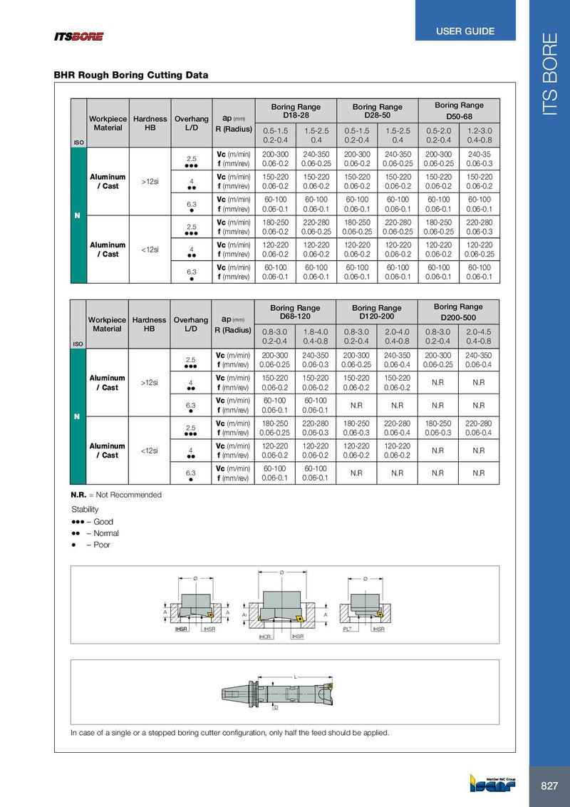 USER GUIDE BHR Rough Boring Cutting Data Boring Range Boring Range Boring Range D28-50 ITS BORE Workpiece Hardness Overhang ap (mm) D18-28 D50-68 Material HB L/D R (Radius) 0.5-1.5 1.5-2.5 0.5-1.5 1.5-2.5 0.5-2.0 1.2-3.0 ISO 0.2-0.4 0.4 0.2-0.4 0.4 0.2-0.4 0.4-0.8 Vc (m/min) 200-300 240-350 200-300 240-350 200-300 240-35 2.5 ● ● ● f (mm/rev) 0.06-0.2 0.06-0.25 0.06-0.2 0.06-0.25 0.06-0.25 0.06-0.3 Aluminum Vc (m/min) 150-220 150-220 150-220 150-220 150-220 150-220 >12si 4 / Cast ● ● f (mm/rev) 0.06-0.2 0.06-0.2 0.06-0.2 0.06-0.2 0.06-0.2 0.06-0.2 Vc (m/min) 60-100 60-100 60-100 60-100 60-100 60-100 6.3 ● f (mm/rev) 0.06-0.1 0.06-0.1 0.06-0.1 0.06-0.1 0.06-0.1 0.06-0.1 N Vc (m/min) 180-250 220-280 180-250 220-280 180-250 220-280 2.5 ● ● ● f (mm/rev) 0.06-0.2 0.06-0.25 0.06-0.25 0.06-0.25 0.06-0.25 0.06-0.3 Aluminum Vc (m/min) 120-220 120-220 120-220 120-220 120-220 120-220 <12si 4 / Cast ● ● f (mm/rev) 0.06-0.2 0.06-0.2 0.06-0.2 0.06-0.2 0.06-0.2 0.06-0.25 Vc (m/min) 60-100 60-100 60-100 60-100 60-100 60-100 6.3 ● f (mm/rev) 0.06-0.1 0.06-0.1 0.06-0.1 0.06-0.1 0.06-0.1 0.06-0.1 Boring Range Boring Range Boring Range D68-120 D120-200 Workpiece Hardness Overhang ap (mm) D200-500 Material HB L/D R (Radius) 0.8-3.0 1.8-4.0 0.8-3.0 2.0-4.0 0.8-3.0 2.0-4.5 ISO 0.2-0.4 0.4-0.8 0.2-0.4 0.4-0.8 0.2-0.4 0.4-0.8 Vc (m/min) 200-300 240-350 200-300 240-350 200-300 240-350 2.5 ● ● ● f (mm/rev) 0.06-0.25 0.06-0.3 0.06-0.25 0.06-0.4 0.06-0.25 0.06-0.4 Aluminum Vc (m/min) 150-220 150-220 150-220 150-220 >12si 4 N.R N.R / Cast ● ● f (mm/rev) 0.06-0.2 0.06-0.2 0.06-0.2 0.06-0.2 Vc (m/min) 60-100 60-100 6.3 N.R N.R N.R N.R ● f (mm/rev) 0.06-0.1 0.06-0.1 N Vc (m/min) 180-250 220-280 180-250 220-280 180-250 220-280 2.5 ● ● ● f (mm/rev) 0.06-0.25 0.06-0.3 0.06-0.3 0.06-0.4 0.06-0.3 0.06-0.4 Aluminum Vc (m/min) 120-220 120-220 120-220 120-220 <12si 4 N.R N.R / Cast ● ● f (mm/rev) 0.06-0.2 0.06-0.2 0.06-0.2 0.06-0.2 Vc (m/min) 60-100 60-100 6.3 N.R N.R N.R N.R ● f (mm/rev) 0.06-0.1 0.06-0.1 N.R. = Not Recommended Stability ● ● ● – Good ● ● – Normal ● – Poor Ø Ø Ø A A A1 A IHSR IHSR IHSR PLT IHSR IHCR IHSR L D In case of a single or a stepped boring cutter configuration, only half the feed should be applied. 827 827