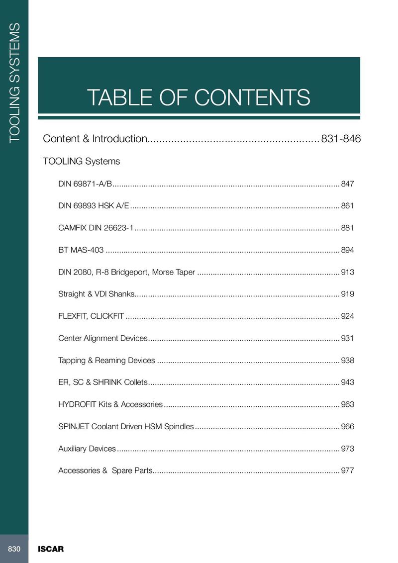TABLE OF CONTENTS TOOLING SYSTEMS Content & Introduction .......................................................... 831-846 TOOLING Systems DIN 69871-A/B ...................................................................................................... 847 DIN 69893 HSK A/E .............................................................................................. 861 CAMFIX DIN 26623-1 ............................................................................................ 881 BT MAS-403 ......................................................................................................... 894 DIN 2080, R-8 Bridgeport, Morse Taper ................................................................ 913 Straight & VDI Shanks............................................................................................ 919 FLEXFIT, CLICKFIT ................................................................................................ 924 Center Alignment Devices ...................................................................................... 931 Tapping & Reaming Devices .................................................................................. 938 ER, SC & SHRINK Collets ...................................................................................... 943 HYDROFIT Kits & Accessories ............................................................................... 963 SPINJET Coolant Driven HSM Spindles ................................................................. 966 Auxiliary Devices .................................................................................................... 973 Accessories & Spare Parts.................................................................................... 977 830 ISCAR