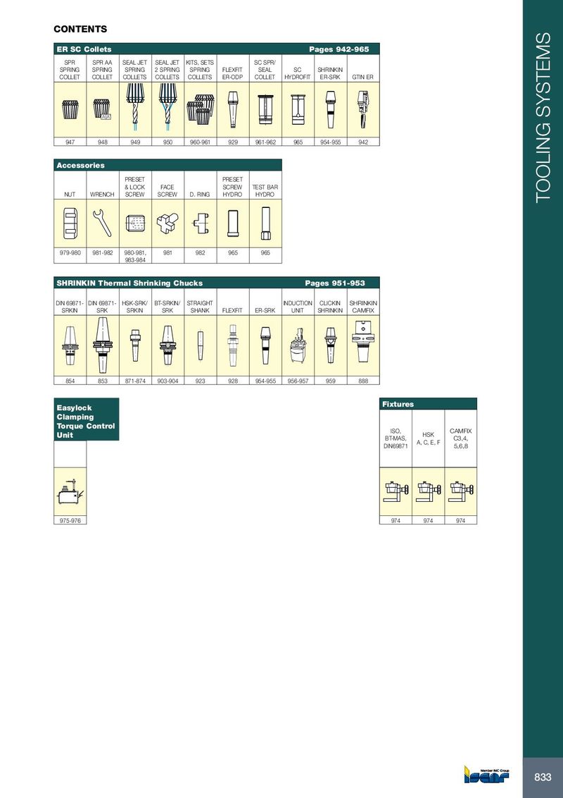 CONTENTS ER SC Collets Pages 942-965 SPR SPR AA SEAL JET SEAL JET KITS, SETS SC SPR/ SPRING SPRING SPRING 2 SPRING SPRING FLEXFIT SEAL SC SHRINKIN COLLET COLLET COLLETS COLLETS COLLETS ER-ODP COLLET HYDROFIT ER-SRK GTIN ER A A 947 948 949 950 960-961 929 961-962 965 954-955 942 Accessories PRESET PRESET & LOCK FACE SCREW TEST BAR NUT WRENCH SCREW SCREW D. RING HYDRO HYDRO TOOLING SYSTEMS 979-980 981-982 980-981, 981 982 965 965 983-984 SHRINKIN Thermal Shrinking Chucks Pages 951-953 DIN 69871- DIN 69871- HSK-SRK/ BT-SRKIN/ STRAIGHT INDUCTION CLICKIN SHRINKIN SRKIN SRK SRKIN SRK SHANK FLEXFIT ER-SRK UNIT SHRINKIN CAMFIX 854 853 871-874 903-904 923 928 954-955 956-957 959 888 Fixtures Easylock Clamping Torque Control ISO, CAMFIX Unit HSK BT-MAS, C3,4, A, C, E, F DIN69871 5,6,8 975-976 974 974 974 833 833