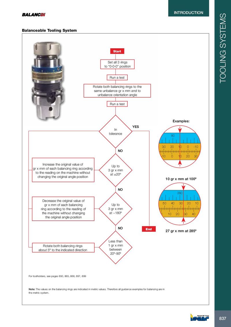 INTRODUCTION INTRODUCTION Balanceable Tooling System Start Set all 3 rings to “0-0-0” position Run a test TOOLING SYSTEMS Rotate both balancing rings to the same unbalance gr x mm and to unbalance orientation angle Run a test Examples: YES In tolerance 80 30 20 10 0 -10 NO -10 0 10 20 30 Increase the original value of Up to gr x mm of each balancing ring according 3 gr x mm to the reading on the machine without at ±20º changing the original angle position 10 gr x mm at 100º NO 280 Decrease the original value of 50 40 30 20 10 gr x mm of each balancing Up to ring according to the reading of 3 gr x mm the machine without changing at ~180º 0 10 20 30 40 the original angle position NO End 27 gr x mm at 285º Less than Rotate both balancing rings 1 gr x mm about 5º to the indicated direction between 20º-90º For toolholders, see pages 850, 865, 866, 897, 899 Note: The values on the balancing rings are indicated in metric values. Therefore all guidance examples for balancing are in the metric system. 837 837
