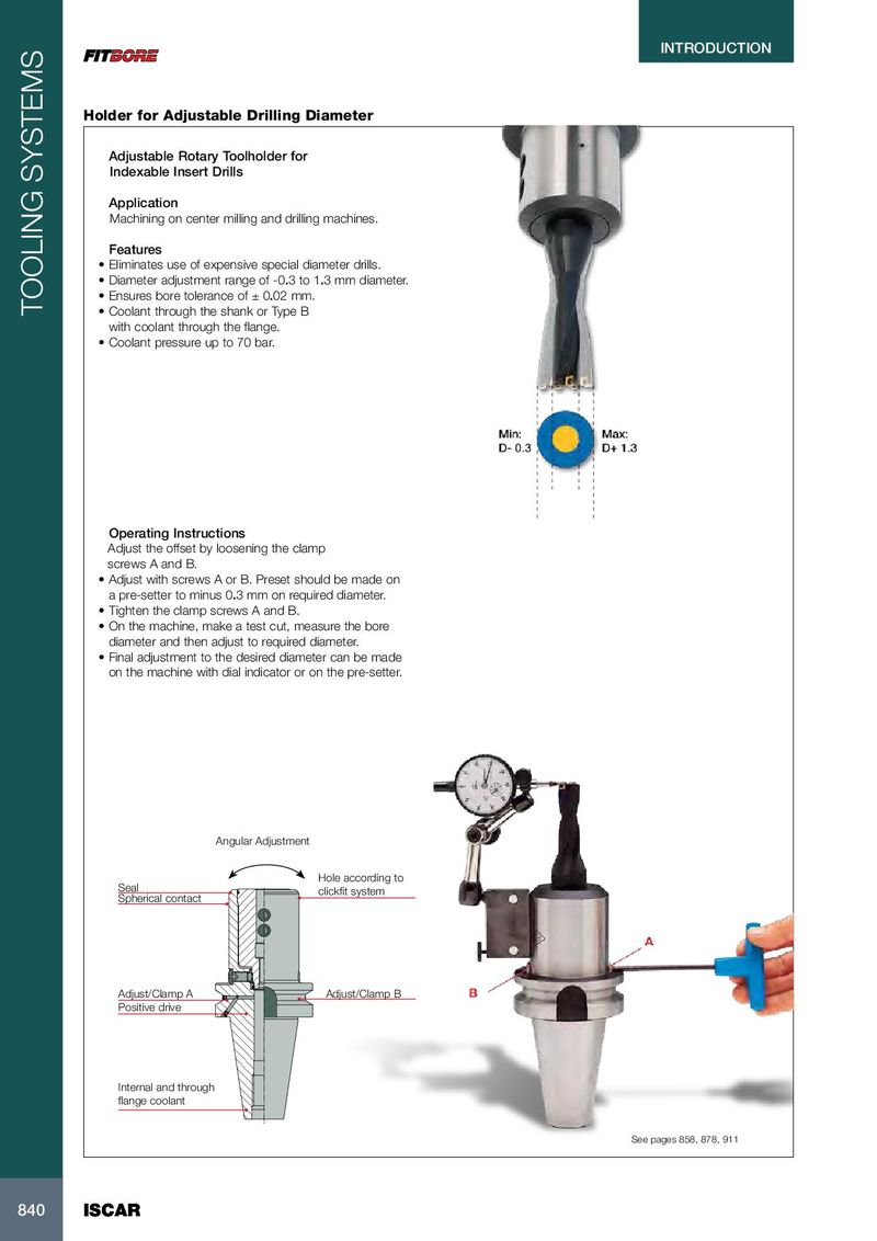 INTRODUCTION INTRODUCTION Holder for Adjustable Drilling Diameter Adjustable Rotary Toolholder for Indexable Insert Drills Application Machining on center milling and drilling machines. Features • Eliminates use of expensive special diameter drills. • Diameter adjustment range of -0.3 to 1.3 mm diameter. • Ensures bore tolerance of ± 0.02 mm. TOOLING SYSTEMS • Coolant through the shank or Type B with coolant through the flange. • Coolant pressure up to 70 bar. Operating Instructions Adjust the offset by loosening the clamp screws A and B. • Adjust with screws A or B. Preset should be made on a pre-setter to minus 0.3 mm on required diameter. • Tighten the clamp screws A and B. • On the machine, make a test cut, measure the bore diameter and then adjust to required diameter. • Final adjustment to the desired diameter can be made on the machine with dial indicator or on the pre-setter. Angular Adjustment Hole according to Seal clickfit system Spherical contact Adjust/Clamp A Adjust/Clamp B Positive drive Internal and through flange coolant See pages 858, 878, 911 840 840 ISCAR ISCAR