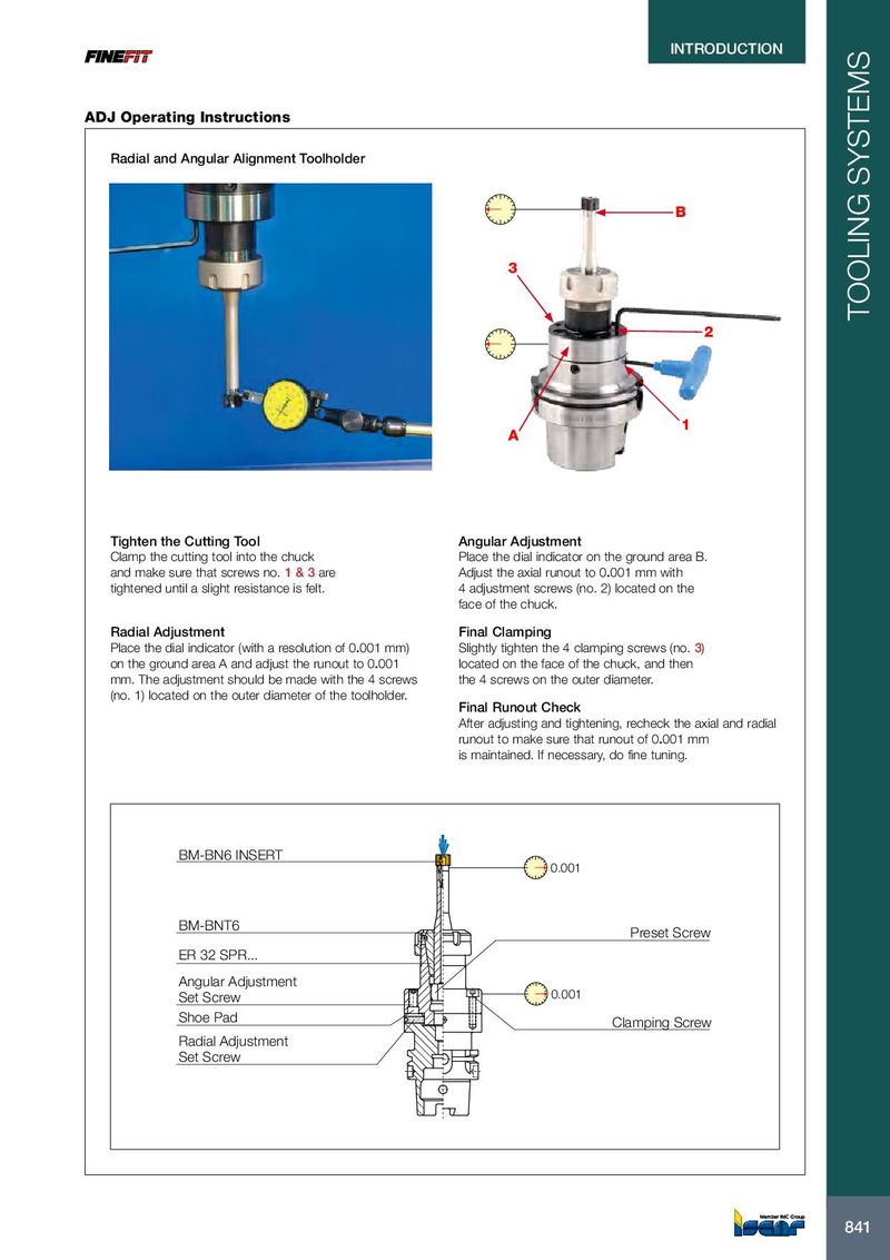 INTRODUCTION INTRODUCTION ADJ Operating Instructions Radial and Angular Alignment Toolholder B 3 TOOLING SYSTEMS 2 1 A Tighten the Cutting Tool Angular Adjustment Clamp the cutting tool into the chuck Place the dial indicator on the ground area B. and make sure that screws no. 1 & 3 are Adjust the axial runout to 0.001 mm with tightened until a slight resistance is felt. 4 adjustment screws (no. 2) located on the face of the chuck. Radial Adjustment Final Clamping Place the dial indicator (with a resolution of 0.001 mm) Slightly tighten the 4 clamping screws (no. 3) on the ground area A and adjust the runout to 0.001 located on the face of the chuck, and then mm. The adjustment should be made with the 4 screws the 4 screws on the outer diameter. (no. 1) located on the outer diameter of the toolholder. Final Runout Check After adjusting and tightening, recheck the axial and radial runout to make sure that runout of 0.001 mm is maintained. If necessary, do fine tuning. BM-BN6 INSERT 0.001 BM-BNT6 Preset Screw ER 32 SPR... Angular Adjustment Set Screw 0.001 Shoe Pad Clamping Screw Radial Adjustment Set Screw 841 841