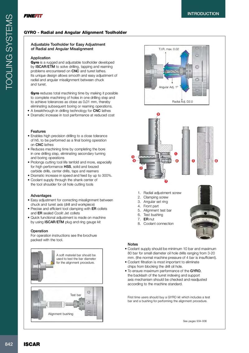 INTRODUCTION GYRO - Radial and Angular Alignment Toolholder Adjustable Toolholder for Easy Adjustment of Radial and Angular Misalignment T.I.R. max. 0.02 Application Gyro is a rugged and adjustable toolholder developed by ISCAR/ETM to solve drilling, tapping and reaming problems encountered on CNC and turret lathes. Its unique design allows smooth and easy adjustment of radial and angular misalignment between chuck and turret. Angular Adj. 1º TOOLING SYSTEMS Gyro reduces total machining time by making it possible to complete machining of holes in one drilling step and to achieve tolerances as close as 0.01 mm, thereby Radial Adj. D2.0 eliminating subsequent boring or reaming operations. • A breakthrough in drilling technology for CNC lathes • Dramatic increase in tool performance at reduced cost Features • Enables high precision drilling to a close tolerance of h6, to be performed as a final boring operation on CNC lathes • Reduces machining time by completing the bore in one drilling step, eliminating secondary turning and boring operations • Prolongs cutting tool life tenfold and more, especially for high performance HSS, solid and brazed carbide drills, center drills, taps and reamers • Dramatic increase in speed and feed by up to 300%. • Coolant supply through the shank center of the tool shoulder for oil hole cutting tools 1. Radial adjustment screw Advantages 2. Clamping screw • Easy adjustment for correcting misalignment between 3. Angular set ring chuck and turret axis (drill and workpiece) 4. Front part • Precise and efficient tool clamping with ER collets 5. Alignment test bar and ER sealed Coolit Jet collets 6. Test bushing • Quick functional adjustment is made on machine 7. ER nut by using ISCAR/ETM plug and ring gauge kit 8. Coolant connection Operation For operation instructions see the brochure packed with the tool. Notes • Coolant supply should be minimum 10 bar and maximum 80 bar for small diameter oil hole drills ranging from 3-20 A soft material bar should be used to test the bar diameter mm. (the normal machine pressure of 4 bar is insufficient). for the alignment procedure. • Coolant filtration is most important to eliminate chips from blocking the drill oil hole. • To ensure maximum performance of the GYRO, the backlash of the turret indexing and support axis mechanism should be checked and readjusted according to the machine standard. Test bar First time users should buy a GYRO kit which includes a test bar and a bushing for performing the alignment procedure. Alignment bushing See pages 934-936 842 842 ISCAR ISCAR