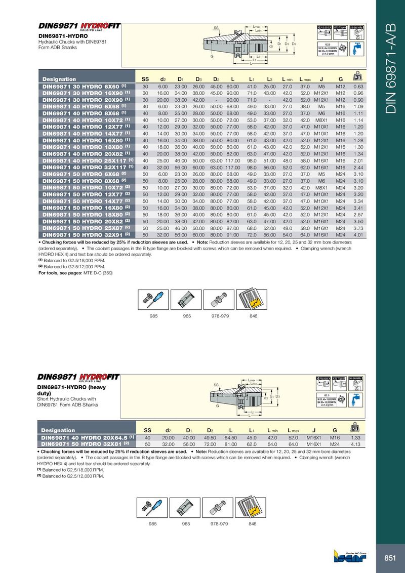 SS Lmax A 0.003 A AT3 Taper 58-60 HRc Lmin DIN69871-HYDRO Hydraulic Chucks with DIN69781 D1 D3 D2 Form ADB Shanks d2 G2.5 SK 30, 40= 18,000RPM J SK 50= 12,000RPM U<1.0 gmm G L3 L1 L kg Designation SS d 2 D 1 D 3 D 2 L L 1 L 3 L min L max J G DIN69871 30 HYDRO 6X60 (1) 30 6.00 23.00 26.00 45.00 60.00 41.0 25.00 27.0 37.0 M5 M12 0.63 DIN69871 30 HYDRO 16X90 (1) 30 16.00 34.00 38.00 45.00 90.00 71.0 43.00 42.0 52.0 M12X1 M12 0.96 DIN69871 30 HYDRO 20X90 (1) 30 20.00 38.00 42.00 - 90.00 71.0 - 42.0 52.0 M12X1 M12 0.90 DIN69871 40 HYDRO 6X68 (1) 40 6.00 23.00 26.00 50.00 68.00 49.0 33.00 27.0 38.0 M5 M16 1.09 DIN69871 40 HYDRO 8X68 (1) 40 8.00 25.00 28.00 50.00 68.00 49.0 33.00 27.0 37.0 M6 M16 1.11 DIN 69871-A/B DIN69871 40 HYDRO 10X72 (1) 40 10.00 27.00 30.00 50.00 72.00 53.0 37.00 32.0 42.0 M8X1 M16 1.14 DIN69871 40 HYDRO 12X77 (1) 40 12.00 29.00 32.00 50.00 77.00 58.0 42.00 37.0 47.0 M10X1 M16 1.20 DIN69871 40 HYDRO 14X77 (1) 40 14.00 30.00 34.00 50.00 77.00 58.0 42.00 37.0 47.0 M10X1 M16 1.20 DIN69871 40 HYDRO 16X80 (1) 40 16.00 34.00 38.00 50.00 80.00 61.0 43.00 42.0 52.0 M12X1 M16 1.28 DIN69871 40 HYDRO 18X80 (1) 40 18.00 36.00 40.00 50.00 80.00 61.0 43.00 42.0 52.0 M12X1 M16 1.30 DIN69871 40 HYDRO 20X82 (1) 40 20.00 38.00 42.00 50.00 82.00 63.0 47.00 42.0 52.0 M12X1 M16 1.34 DIN69871 40 HYDRO 25X117 (1) 40 25.00 46.00 50.00 63.00 117.00 98.0 51.00 48.0 58.0 M16X1 M16 2.01 DIN69871 40 HYDRO 32X117 (1) 40 32.00 56.00 60.00 63.00 117.00 98.0 56.00 52.0 62.0 M16X1 M16 2.44 DIN69871 50 HYDRO 6X68 (2) 50 6.00 23.00 26.00 80.00 68.00 49.0 33.00 27.0 37.0 M5 M24 3.10 DIN69871 50 HYDRO 8X68 (2) 50 8.00 25.00 28.00 80.00 68.00 49.0 33.00 27.0 37.0 M6 M24 3.10 DIN69871 50 HYDRO 10X72 (2) 50 10.00 27.00 30.00 80.00 72.00 53.0 37.00 32.0 42.0 M8X1 M24 3.20 DIN69871 50 HYDRO 12X77 (2) 50 12.00 29.00 32.00 80.00 77.00 58.0 42.00 37.0 47.0 M10X1 M24 3.20 DIN69871 50 HYDRO 14X77 (2) 50 14.00 30.00 34.00 80.00 77.00 58.0 42.00 37.0 47.0 M10X1 M24 3.34 DIN69871 50 HYDRO 16X80 (2) 50 16.00 34.00 38.00 80.00 80.00 61.0 45.00 42.0 52.0 M12X1 M24 3.41 DIN69871 50 HYDRO 18X80 (2) 50 18.00 36.00 40.00 80.00 80.00 61.0 45.00 42.0 52.0 M12X1 M24 2.57 DIN69871 50 HYDRO 20X82 (2) 50 20.00 38.00 42.00 80.00 82.00 63.0 47.00 42.0 52.0 M16X1 M24 3.50 DIN69871 50 HYDRO 25X87 (2) 50 25.00 46.00 50.00 80.00 87.00 68.0 52.00 48.0 58.0 M16X1 M24 3.73 DIN69871 50 HYDRO 32X91 (2) 50 32.00 56.00 60.00 80.00 91.00 72.0 56.00 54.0 64.0 M16X1 M24 4.01 • Chucking forces will be reduced by 25% if reduction sleeves are used. • Note: Reduction sleeves are available for 12, 20, 25 and 32 mm bore diameters (ordered separately). • The coolant passages in the B type flange are blocked with screws which can be removed when required. • Clamping wrench (wrench HYDRO HEX 4) and test bar should be ordered separately. (1) Balanced to G2.5/18,000 RPM. (2) Balanced to G2.5/12,000 RPM. For tools, see pages: MTE D-C (359) 985 965 978-979 846 Lmax A 0.003 A AT3 Taper 58-60 HRc SS Lmin DIN69871-HYDRO (heavy duty) G2.5 Short Hydraulic Chucks with J d2 D1 D3 SK 30, 40= 18,000RPM SK 50= 12,000RPM DIN69781 Form ADB Shanks G U<1.0 gmm L1 L kg Designation SS d 2 D 1 D 3 L L 1 L min L max J G DIN69871 40 HYDRO 20X64.5 (1) 40 20.00 40.00 49.50 64.50 45.0 42.0 52.0 M16X1 M16 1.33 DIN69871 50 HYDRO 32X81 (2) 50 32.00 56.00 72.00 81.00 62.0 54.0 64.0 M16X1 M24 4.13 • Chucking forces will be reduced by 25% if reduction sleeves are used. • Note: Reduction sleeves are available for 12, 20, 25 and 32 mm bore diameters (ordered separately). • The coolant passages in the B type flange are blocked with screws which can be removed when required. • Clamping wrench (wrench HYDRO HEX 4) and test bar should be ordered separately. (1) Balanced to G2.5/18,000 RPM. (2) Balanced to G2.5/12,000 RPM. 985 965 978-979 846 851