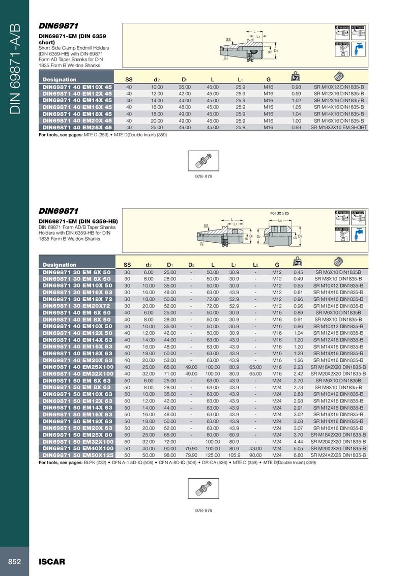 A 0.005 A AT3 Taper L DIN69871-EM (DIN 6359 L1 SS short) 58-60 HRc Short Side Clamp Endmill Holders d2 D1 (DIN 6359-HB) with DIN 69871 Form AD Taper Shanks for DIN G 1835 Form B Weldon Shanks kg Designation SS d 2 D 1 L L 1 G DIN69871 40 EM10X 45 40 10.00 35.00 45.00 25.9 M16 0.93 SR M10X12 DIN1835-B DIN69871 40 EM12X 45 40 12.00 42.00 45.00 25.9 M16 0.99 SR M12X16 DIN1835-B DIN69871 40 EM14X 45 40 14.00 44.00 45.00 25.9 M16 1.02 SR M12X16 DIN1835-B DIN69871 40 EM16X 45 40 16.00 48.00 45.00 25.9 M16 1.05 SR M14X16 DIN1835-B DIN 69871-A/B DIN69871 40 EM18X 45 40 18.00 49.00 45.00 25.9 M16 1.04 SR M14X16 DIN1835-B DIN69871 40 EM20X 45 40 20.00 49.00 45.00 25.9 M16 1.00 SR M16X16 DIN1835-B DIN69871 40 EM25X 45 40 25.00 49.00 45.00 25.9 M16 0.93 SR M18X2X10 EM SHORT For tools, see pages: MTE D (359) • MTE D(Double Insert) (359) 978-979 For d2 ≥ 25 A 0.005 A AT3 Taper L DIN69871-EM (DIN 6359-HB) L5 DIN 69871 Form AD/B Taper Shanks SS L1 58-60 HRc Holders with DIN 6359-HB for DIN D1 D2 1835 Form B Weldon Shanks d2 d2 D1 G kg Designation SS d 2 D 1 D 2 L L 1 L 5 G DIN69871 30 EM 6X 50 30 6.00 25.00 - 50.00 30.9 - M12 0.45 SR M6X10 DIN1835B DIN69871 30 EM 8X 50 30 8.00 28.00 - 50.00 30.9 - M12 0.49 SR M8X10 DIN1835-B DIN69871 30 EM10X 50 30 10.00 35.00 - 50.00 30.9 - M12 0.55 SR M10X12 DIN1835-B DIN69871 30 EM16X 63 30 16.00 48.00 - 63.00 43.9 - M12 0.81 SR M14X16 DIN1835-B DIN69871 30 EM18X 72 30 18.00 50.00 - 72.00 52.9 - M12 0.96 SR M14X16 DIN1835-B DIN69871 30 EM20X72 30 20.00 52.00 - 72.00 52.9 - M12 0.96 SR M16X16 DIN1835-B DIN69871 40 EM 6X 50 40 6.00 25.00 - 50.00 30.9 - M16 0.89 SR M6X10 DIN1835B DIN69871 40 EM 8X 50 40 8.00 28.00 - 50.00 30.9 - M16 0.91 SR M8X10 DIN1835-B DIN69871 40 EM10X 50 40 10.00 35.00 - 50.00 30.9 - M16 0.96 SR M10X12 DIN1835-B DIN69871 40 EM12X 50 40 12.00 42.00 - 50.00 30.9 - M16 1.04 SR M12X16 DIN1835-B DIN69871 40 EM14X 63 40 14.00 44.00 - 63.00 43.9 - M16 1.20 SR M12X16 DIN1835-B DIN69871 40 EM16X 63 40 16.00 48.00 - 63.00 43.9 - M16 1.20 SR M14X16 DIN1835-B DIN69871 40 EM18X 63 40 18.00 50.00 - 63.00 43.9 - M16 1.29 SR M14X16 DIN1835-B DIN69871 40 EM20X 63 40 20.00 52.00 - 63.00 43.9 - M16 1.26 SR M16X16 DIN1835-B DIN69871 40 EM25X100 40 25.00 65.00 49.00 100.00 80.9 65.00 M16 2.23 SR M18X2X20 DIN1835-B DIN69871 40 EM32X100 40 32.00 71.00 49.00 100.00 80.9 65.00 M16 2.42 SR M20X2X20 DIN1835-B DIN69871 50 EM 6X 63 50 6.00 25.00 - 63.00 43.9 - M24 2.70 SR M6X10 DIN1835B DIN69871 50 EM 8X 63 50 8.00 28.00 - 63.00 43.9 - M24 2.73 SR M8X10 DIN1835-B DIN69871 50 EM10X 63 50 10.00 35.00 - 63.00 43.9 - M24 2.83 SR M10X12 DIN1835-B DIN69871 50 EM12X 63 50 12.00 42.00 - 63.00 43.9 - M24 2.93 SR M12X16 DIN1835-B DIN69871 50 EM14X 63 50 14.00 44.00 - 63.00 43.9 - M24 2.91 SR M12X16 DIN1835-B DIN69871 50 EM16X 63 50 16.00 48.00 - 63.00 43.9 - M24 3.02 SR M14X16 DIN1835-B DIN69871 50 EM18X 63 50 18.00 50.00 - 63.00 43.9 - M24 3.08 SR M14X16 DIN1835-B DIN69871 50 EM20X 63 50 20.00 52.00 - 63.00 43.9 - M24 3.07 SR M16X16 DIN1835-B DIN69871 50 EM25X 80 50 25.00 65.00 - 80.00 60.9 - M24 3.70 SR M18X2X20 DIN1835-B DIN69871 50 EM32X100 50 32.00 72.00 - 100.00 80.9 - M24 4.44 SR M20X2X20 DIN1835-B DIN69871 50 EM40X100 50 40.00 90.00 79.90 100.00 80.9 43.00 M24 5.05 SR M20X2X20 DIN1835-B DIN69871 50 EM50X125 50 50.00 98.00 79.90 125.00 105.9 90.00 M24 6.80 SR M24X2X25 DIN1835-B For tools, see pages: BLPK (232) • DFN A-1.5D-IQ (505) • DFN A-8D-IQ (506) • DR-CA (526) • MTE D (359) • MTE D(Double Insert) (359) 978-979 852 ISCAR