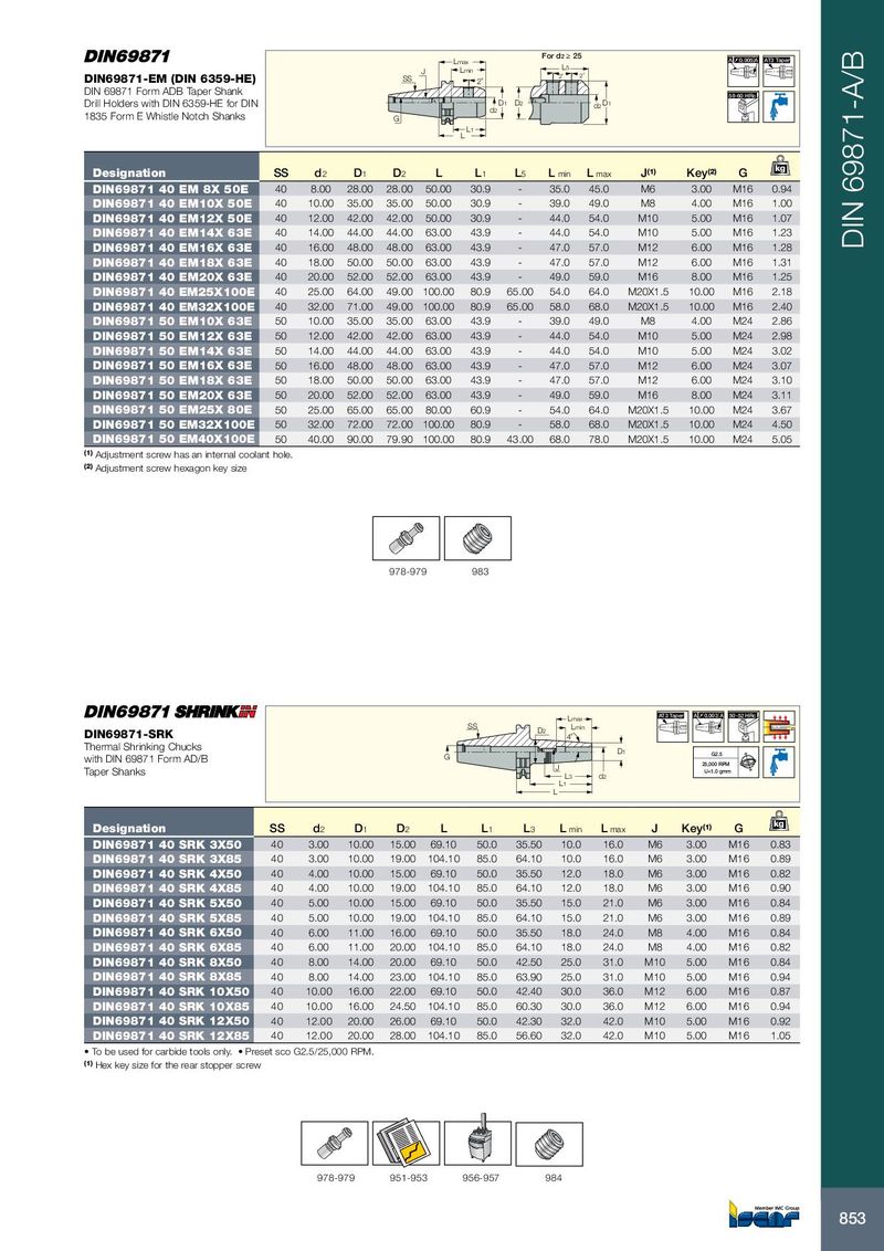 For d2 ≥ 25 Lmax A 0.005 A AT3 Taper J Lmin L5 DIN69871-EM (DIN 6359-HE) SS 2˚ 2˚ 2˚ DIN 69871 Form ADB Taper Shank 58-60 HRc Drill Holders with DIN 6359-HE for DIN D1 D2 D1 d2 d2 1835 Form E Whistle Notch Shanks G L1 L Designation SS d 2 D 1 D 2 L L 1 L 5 L min L max J (1) kg Key (2) G DIN69871 40 EM 8X 50E 40 8.00 28.00 28.00 50.00 30.9 - 35.0 45.0 M6 3.00 M16 0.94 DIN69871 40 EM10X 50E 40 10.00 35.00 35.00 50.00 30.9 - 39.0 49.0 M8 4.00 M16 1.00 DIN69871 40 EM12X 50E 40 12.00 42.00 42.00 50.00 30.9 - 44.0 54.0 M10 5.00 M16 1.07 DIN69871 40 EM14X 63E 40 14.00 44.00 44.00 63.00 43.9 - 44.0 54.0 M10 5.00 M16 1.23 DIN69871 40 EM16X 63E 40 16.00 48.00 48.00 63.00 43.9 - 47.0 57.0 M12 6.00 M16 1.28 DIN 69871-A/B DIN69871 40 EM18X 63E 40 18.00 50.00 50.00 63.00 43.9 - 47.0 57.0 M12 6.00 M16 1.31 DIN69871 40 EM20X 63E 40 20.00 52.00 52.00 63.00 43.9 - 49.0 59.0 M16 8.00 M16 1.25 DIN69871 40 EM25X100E 40 25.00 64.00 49.00 100.00 80.9 65.00 54.0 64.0 M20X1.5 10.00 M16 2.18 DIN69871 40 EM32X100E 40 32.00 71.00 49.00 100.00 80.9 65.00 58.0 68.0 M20X1.5 10.00 M16 2.40 DIN69871 50 EM10X 63E 50 10.00 35.00 35.00 63.00 43.9 - 39.0 49.0 M8 4.00 M24 2.86 DIN69871 50 EM12X 63E 50 12.00 42.00 42.00 63.00 43.9 - 44.0 54.0 M10 5.00 M24 2.98 DIN69871 50 EM14X 63E 50 14.00 44.00 44.00 63.00 43.9 - 44.0 54.0 M10 5.00 M24 3.02 DIN69871 50 EM16X 63E 50 16.00 48.00 48.00 63.00 43.9 - 47.0 57.0 M12 6.00 M24 3.07 DIN69871 50 EM18X 63E 50 18.00 50.00 50.00 63.00 43.9 - 47.0 57.0 M12 6.00 M24 3.10 DIN69871 50 EM20X 63E 50 20.00 52.00 52.00 63.00 43.9 - 49.0 59.0 M16 8.00 M24 3.11 DIN69871 50 EM25X 80E 50 25.00 65.00 65.00 80.00 60.9 - 54.0 64.0 M20X1.5 10.00 M24 3.67 DIN69871 50 EM32X100E 50 32.00 72.00 72.00 100.00 80.9 - 58.0 68.0 M20X1.5 10.00 M24 4.50 DIN69871 50 EM40X100E 50 40.00 90.00 79.90 100.00 80.9 43.00 68.0 78.0 M20X1.5 10.00 M24 5.05 (1) Adjustment screw has an internal coolant hole. (2) Adjustment screw hexagon key size 978-979 983 Lmax AT3 Taper A 0.003 A 50-52 HRc SS D2 Lmin DIN69871-SRK 4˚ Thermal Shrinking Chucks D1 with DIN 69871 Form AD/B G G2.5 J 25,000 RPM Taper Shanks U<1.0 gmm L3 d2 L1 L kg Designation SS d 2 D 1 D 2 L L 1 L 3 L min L max J Key (1) G DIN69871 40 SRK 3X50 40 3.00 10.00 15.00 69.10 50.0 35.50 10.0 16.0 M6 3.00 M16 0.83 DIN69871 40 SRK 3X85 40 3.00 10.00 19.00 104.10 85.0 64.10 10.0 16.0 M6 3.00 M16 0.89 DIN69871 40 SRK 4X50 40 4.00 10.00 15.00 69.10 50.0 35.50 12.0 18.0 M6 3.00 M16 0.82 DIN69871 40 SRK 4X85 40 4.00 10.00 19.00 104.10 85.0 64.10 12.0 18.0 M6 3.00 M16 0.90 DIN69871 40 SRK 5X50 40 5.00 10.00 15.00 69.10 50.0 35.50 15.0 21.0 M6 3.00 M16 0.84 DIN69871 40 SRK 5X85 40 5.00 10.00 19.00 104.10 85.0 64.10 15.0 21.0 M6 3.00 M16 0.89 DIN69871 40 SRK 6X50 40 6.00 11.00 16.00 69.10 50.0 35.50 18.0 24.0 M8 4.00 M16 0.84 DIN69871 40 SRK 6X85 40 6.00 11.00 20.00 104.10 85.0 64.10 18.0 24.0 M8 4.00 M16 0.82 DIN69871 40 SRK 8X50 40 8.00 14.00 20.00 69.10 50.0 42.50 25.0 31.0 M10 5.00 M16 0.84 DIN69871 40 SRK 8X85 40 8.00 14.00 23.00 104.10 85.0 63.90 25.0 31.0 M10 5.00 M16 0.94 DIN69871 40 SRK 10X50 40 10.00 16.00 22.00 69.10 50.0 42.40 30.0 36.0 M12 6.00 M16 0.87 DIN69871 40 SRK 10X85 40 10.00 16.00 24.50 104.10 85.0 60.30 30.0 36.0 M12 6.00 M16 0.94 DIN69871 40 SRK 12X50 40 12.00 20.00 26.00 69.10 50.0 42.30 32.0 42.0 M10 5.00 M16 0.92 DIN69871 40 SRK 12X85 40 12.00 20.00 28.00 104.10 85.0 56.60 32.0 42.0 M10 5.00 M16 1.05 • To be used for carbide tools only. • Preset sco G2.5/25,000 RPM. (1) Hex key size for the rear stopper screw 978-979 951-953 956-957 984 853