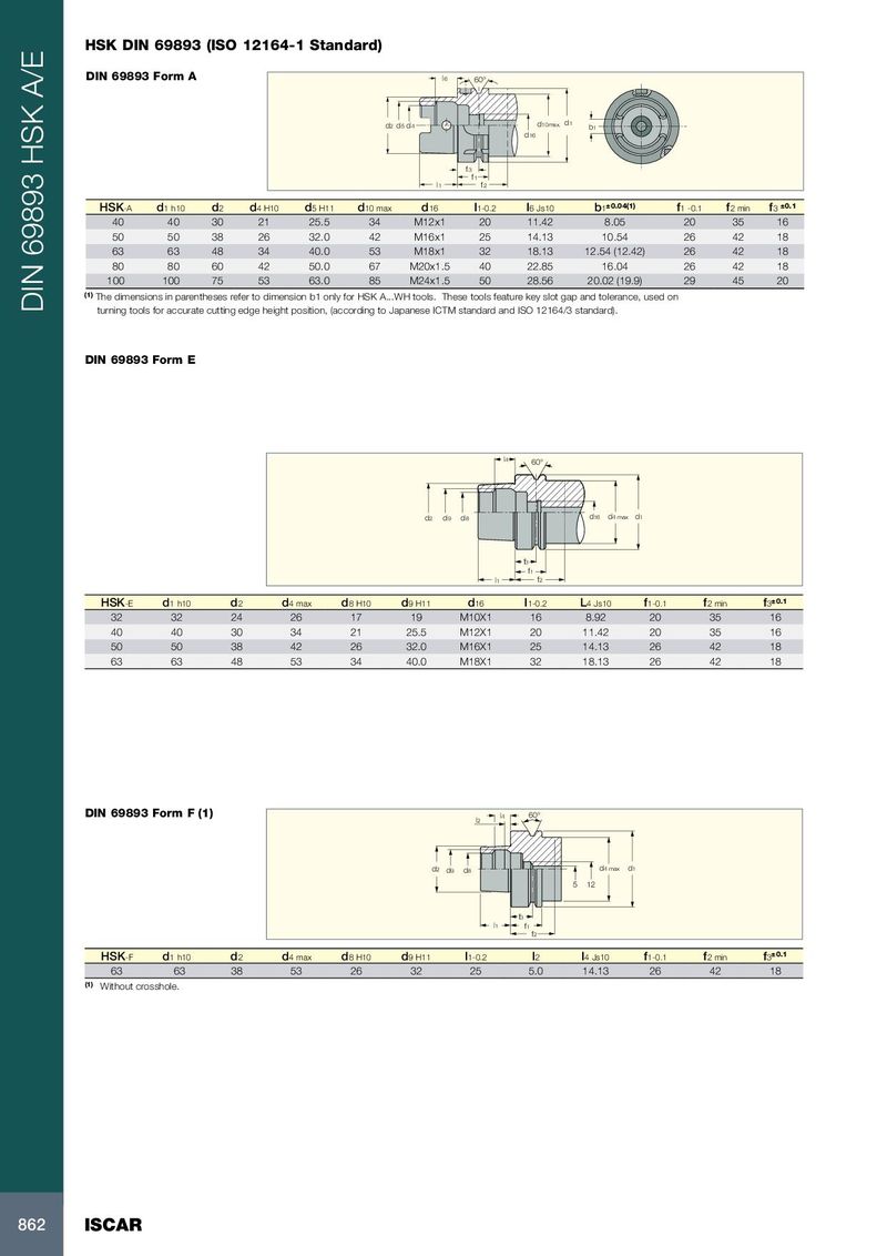 HSK DIN 69893 (ISO 12164-1 Standard) DIN 69893 Form A l 6 60° d2 d5 d4 d10 max. d1 b1 d16 f 3 f 1 l 1 f 2 HSK -A d 1 h10 d 2 d 4 H10 d 5 H11 d 10 max d 16 l 1-0.2 l 6 Js10 b 1 ±0.04(1) f 1 -0.1 f 2 min f 3 ±0.1 40 40 30 21 25.5 34 M12x1 20 11.42 8.05 20 35 16 50 50 38 26 32.0 42 M16x1 25 14.13 10.54 26 42 18 63 63 48 34 40.0 53 M18x1 32 18.13 12.54 (12.42) 26 42 18 80 80 60 42 50.0 67 M20x1.5 40 22.85 16.04 26 42 18 100 100 75 53 63.0 85 M24x1.5 50 28.56 20.02 (19.9) 29 45 20 (1) The dimensions in parentheses refer to dimension b1 only for HSK A...WH tools. These tools feature key slot gap and tolerance, used on DIN 69893 HSK A/E turning tools for accurate cutting edge height position, (according to Japanese ICTM standard and ISO 12164/3 standard). DIN 69893 Form E l4 60° d2 d9 d8 d16 d4 max d1 f3 f1 l1 f2 HSK -E d 1 h10 d 2 d 4 max d 8 H10 d 9 H11 d 16 l 1-0.2 L 4 Js10 f 1-0.1 f 2 min f 3 ±0.1 32 32 24 26 17 19 M10X1 16 8.92 20 35 16 40 40 30 34 21 25.5 M12X1 20 11.42 20 35 16 50 50 38 42 26 32.0 M16X1 25 14.13 26 42 18 63 63 48 53 34 40.0 M18X1 32 18.13 26 42 18 DIN 69893 Form F (1) l4 60° l2 d2 d9 d8 d4 max d1 5 12 f3 l1 f1 f2 HSK -F d 1 h10 d 2 d 4 max d 8 H10 d 9 H11 l 1-0.2 l 2 l 4 Js10 f 1-0.1 f 2 min f 3 ±0.1 63 63 38 53 26 32 25 5.0 14.13 26 42 18 (1) Without crosshole. 862 ISCAR