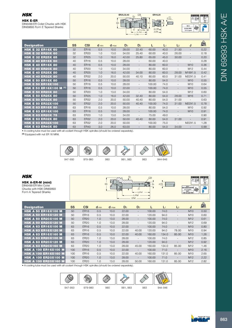 ER25,32,40 CSI ER16,20 D2 A 0.003 A 58-60 HRc d min max HSK E-ER DIN6499 ER Collet Chucks with HSK SS D3 D3 G2.5 DIN69893 Form E Tapered Shanks J L1 Ref. 25,000 RPM L3 Ref. U<1.0 gmm L1 Ref. L Ref. L Ref. kg Designation SS CSI d min d max D 3 D 2 L L 1 L 3 J HSK E 32 ER16X 60 32 ER16 0.5 10.0 28.00 22.40 60.00 40.0 21.50 - 0.22 HSK E 32 ER20X 60 32 ER20 1.0 13.0 34.00 25.40 60.00 40.0 26.00 - 0.18 HSK E 32 ER25X 65 32 ER25 1.0 16.0 42.00 25.80 65.00 45.0 30.00 - 0.20 HSK E 40 ER16X 60 40 ER16 0.5 10.0 28.00 - 60.00 40.0 - - 0.28 HSK E 40 ER16X 80 40 ER16 0.5 10.0 28.00 - 80.00 60.0 - M10 0.36 HSK E 40 ER20X 80 40 ER20 1.0 13.0 34.00 - 80.00 60.0 - M12 0.44 HSK E 40 ER25X 80 40 ER25 1.0 16.0 42.00 34.00 80.00 60.0 28.00 M18X1.5 0.42 HSK E 40 ER32X 80 40 ER32 2.0 20.0 50.00 40.10 80.00 60.0 31.00 M22X1.5 0.41 HSK E 50 ER16X 80 50 ER16 0.5 10.0 28.00 - 80.00 54.0 - M10 0.55 DIN 69893 HSK A/E HSK E 50 ER16X100 50 ER16 0.5 10.0 28.00 - 100.00 74.0 - M10 0.64 HSK E 50 ER16X100 M (1) 50 ER16 0.5 10.0 22.00 - 100.00 74.0 - M10 0.55 HSK E 50 ER20X 80 50 ER20 1.0 13.0 34.00 - 80.00 54.0 - M12 0.60 HSK E 50 ER25X 80 50 ER25 1.0 16.0 42.00 32.40 80.00 54.0 28.00 M16 0.71 HSK E 50 ER32X 80 50 ER32 2.0 20.0 50.00 40.40 80.00 54.0 31.00 - 0.63 HSK E 50 ER32X100 50 ER32 2.0 20.0 50.00 40.40 100.00 74.0 31.00 M22X1.5 0.78 HSK E 63 ER16X 80 63 ER16 0.5 10.0 28.00 - 80.00 54.0 - M10 0.92 HSK E 63 ER16X100 63 ER16 0.5 10.0 28.00 - 100.00 74.0 - M10 0.91 HSK E 63 ER20X 75 63 ER20 1.0 13.0 34.00 - 75.00 49.0 - - 0.90 HSK E 63 ER32X 80 63 ER32 2.0 20.0 50.00 40.40 80.00 54.0 31.00 - 0.91 HSK E 63 ER32X100 63 ER32 2.0 20.0 50.00 - 100.00 75.0 - M22X1.5 1.28 HSK E 63 ER40X 80 63 ER40 3.0 26.0 63.00 - 80.00 54.0 34.00 - 0.99 • A cooling tube must be used with all coolant through HSK spindles (should be ordered separately). (1) Equipped with nut ER 16 MINI. 947-950 979-980 980 981, 983 983 944-946 D 2 CSI A 0.003 A 58-60 HRc HSK A-ER-M (mini) SS D 3 d min max DIN6499 ER Mini Collet G2.5 Chucks with HSK DIN69893 J HSK 40,50,63=20,000RPM U<1.0 gmm G6.3 Form A Tapered Shanks L 3Ref HSK 100=12,000 RPM L 1Ref L Ref . kg Designation SS CSI d min d max D 3 D 2 L L 1 L 3 J HSK A 50 ER16X100 M 50 ER16 0.5 10.0 22.00 - 100.00 74.0 - M10 0.50 HSK A 50 ER16X120 M 50 ER16 0.5 10.0 22.00 - 120.00 94.0 - M10 0.60 HSK A 50 ER20X100 M 50 ER20 1.0 13.0 28.00 - 100.00 74.0 - M12 0.61 HSK A 50 ER20X120 M 50 ER20 1.0 13.0 28.00 - 120.00 94.0 - M12 0.69 HSK A 63 ER16X100 M 63 ER16 0.5 10.0 22.00 - 100.00 74.0 - M10 0.80 HSK A 63 ER16X120 M 63 ER16 0.5 10.0 22.00 40.00 120.00 94.0 78.00 M10 0.94 HSK A 63 ER16X160 M 63 ER16 0.5 10.0 22.00 40.00 160.00 134.0 85.00 M10 1.26 HSK A 63 ER20X100 M 63 ER20 1.0 13.0 28.00 - 100.00 74.0 - M12 0.85 HSK A 63 ER20X120 M 63 ER20 1.0 13.0 28.00 - 120.00 94.0 - M12 0.92 HSK A 63 ER20X160 M 63 ER20 1.0 13.0 28.00 45.00 160.00 134.0 85.00 M12 1.46 HSK A 100 ER16X100 M 100 ER16 0.5 10.0 22.00 - 100.00 71.0 - M10 2.16 HSK A 100 ER16X160 M 100 ER16 0.5 10.0 22.00 40.00 160.00 131.0 85.00 M10 2.65 HSK A 100 ER20X100 M 100 ER20 1.0 13.0 28.00 - 100.00 71.0 - M12 2.22 HSK A 100 ER20X160 M 100 ER20 1.0 13.0 28.00 50.00 160.00 131.0 85.00 M12 2.82 • A cooling tube must be used with all coolant through HSK spindles (should be ordered separately). 947-950 979-980 980 981, 983 983 944-946 863